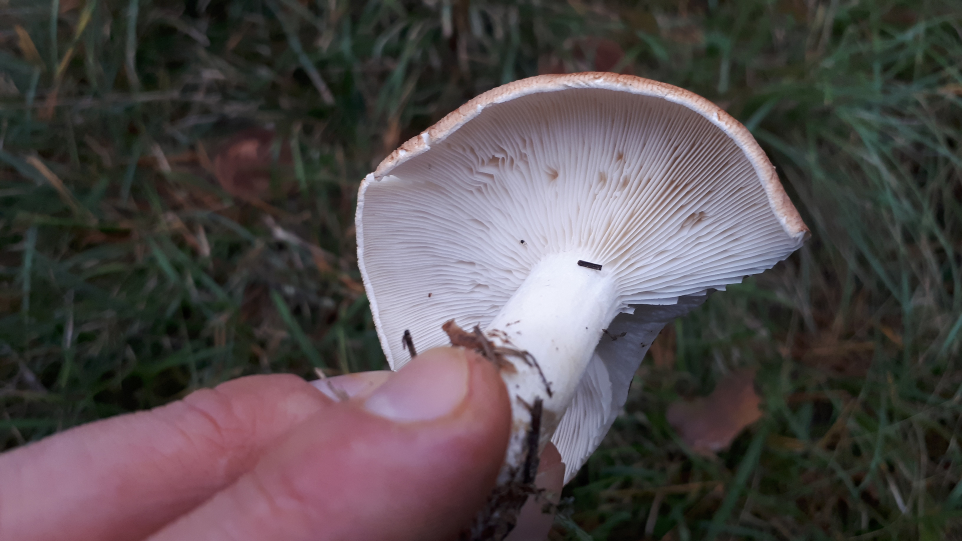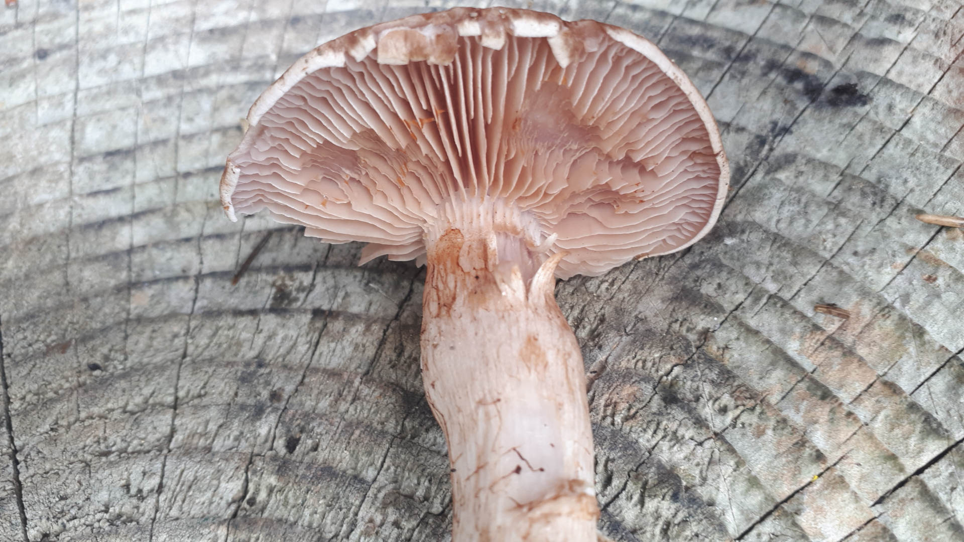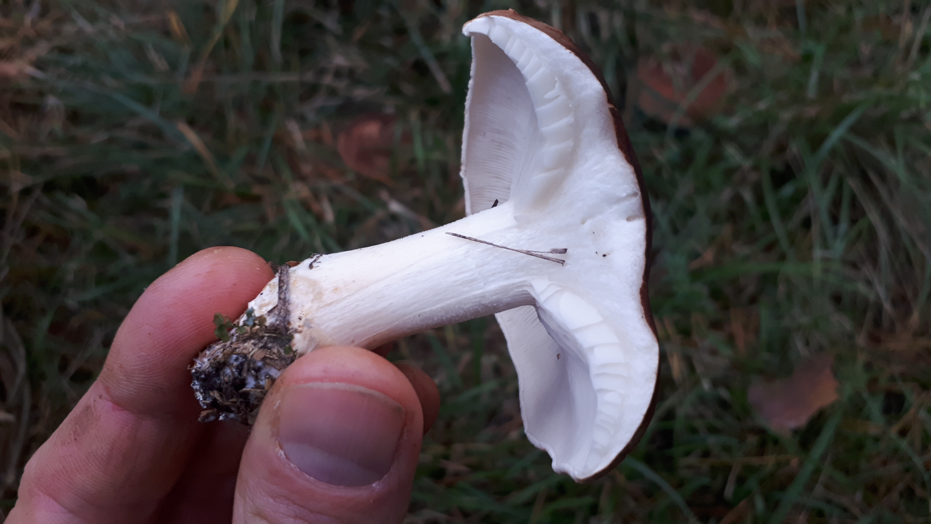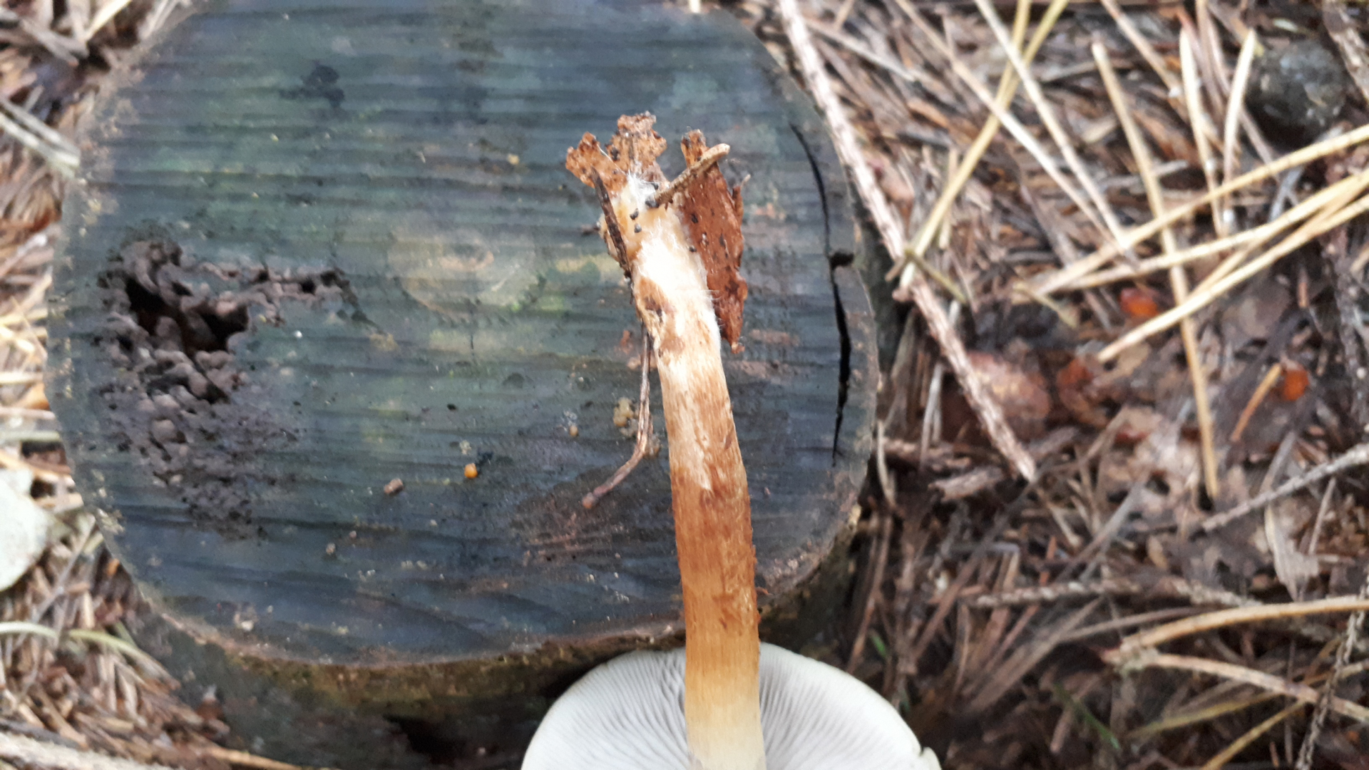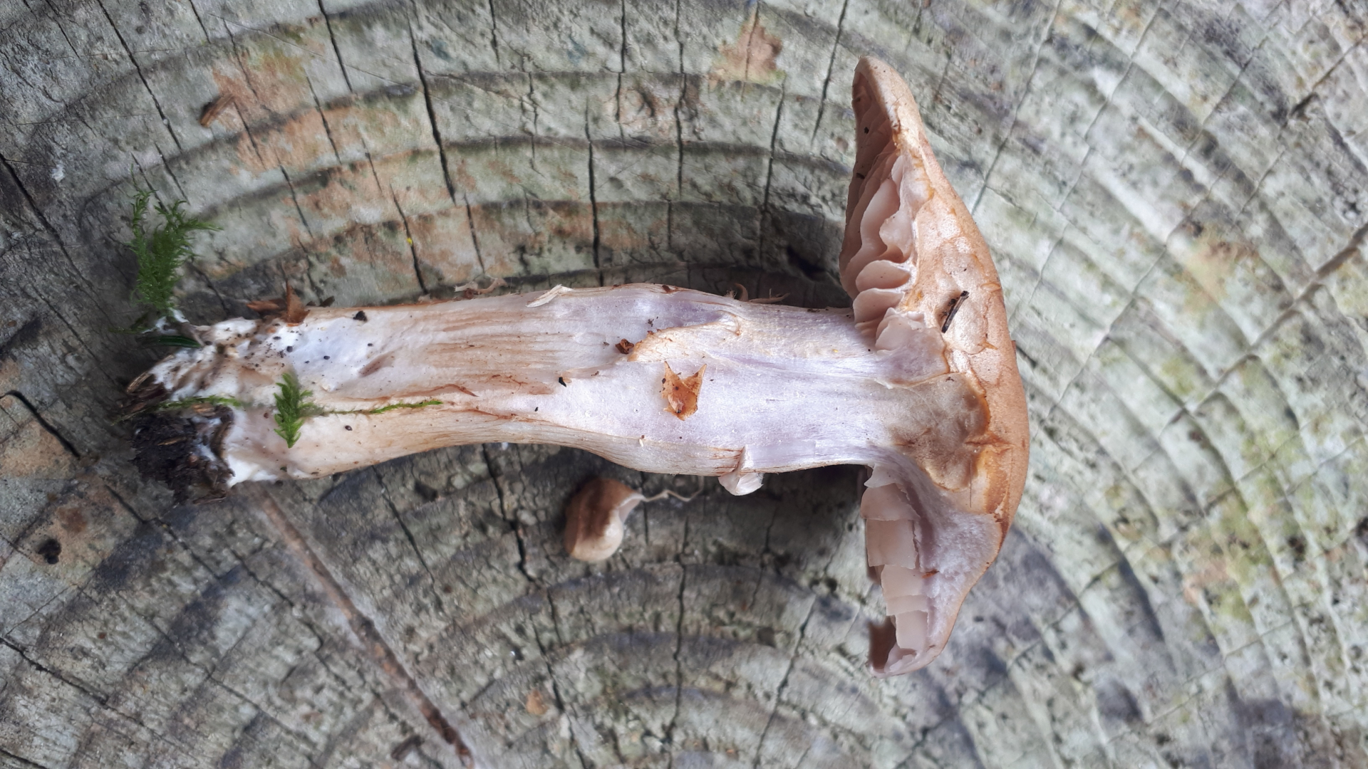 Hellbrauner Hut, weißlicher Stiel mit Lilahauch. Beim Ankratzen passiert nix... weder geruch noch farbe.
