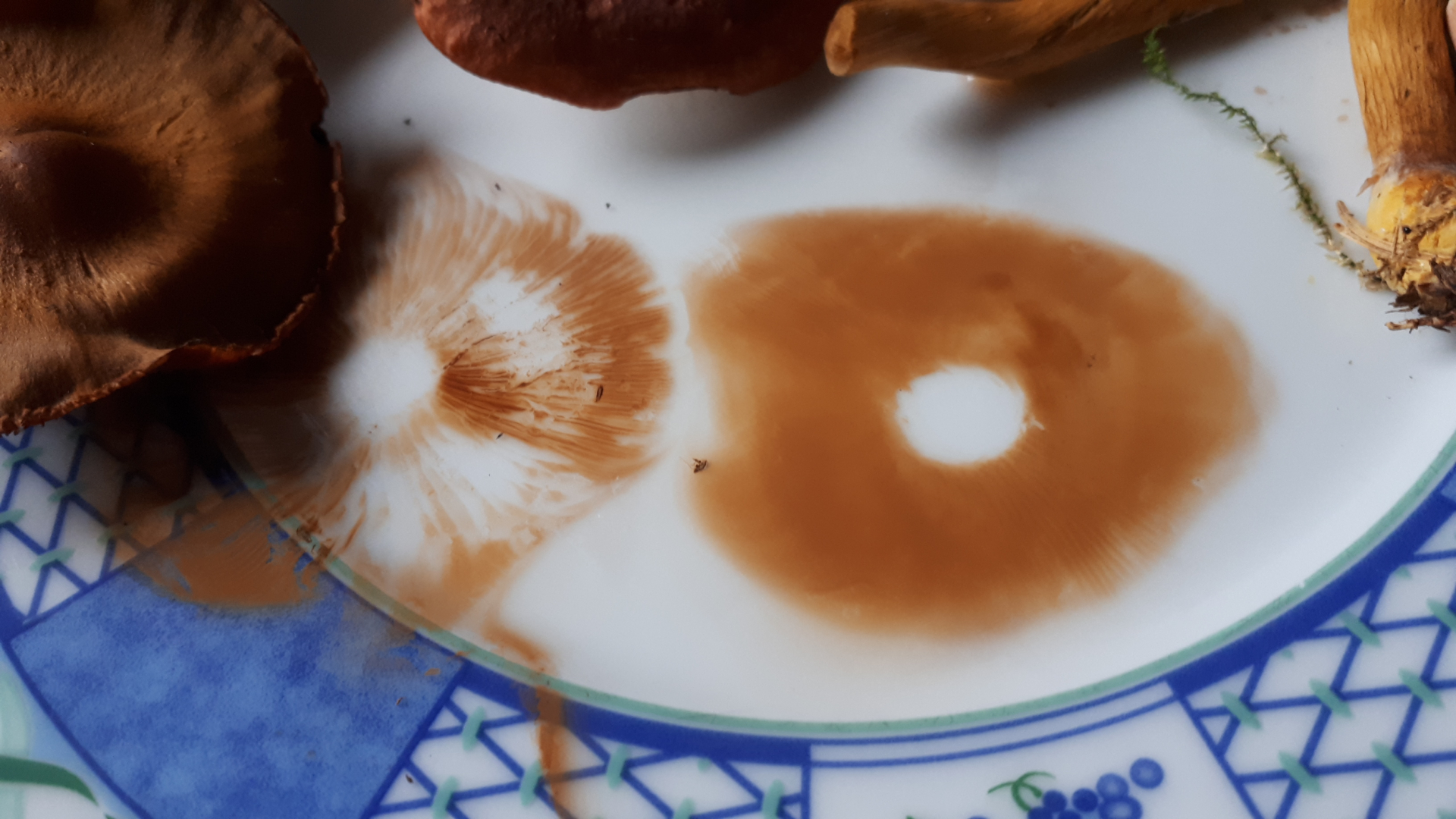 Leider nur kunstlichtbilder. Sporenpulver weiß. Wie beim dunklen gemeinen Halli ein dunklrr Fleck in der Mitte und diese typische Hallimaschhutschuppung. Lg