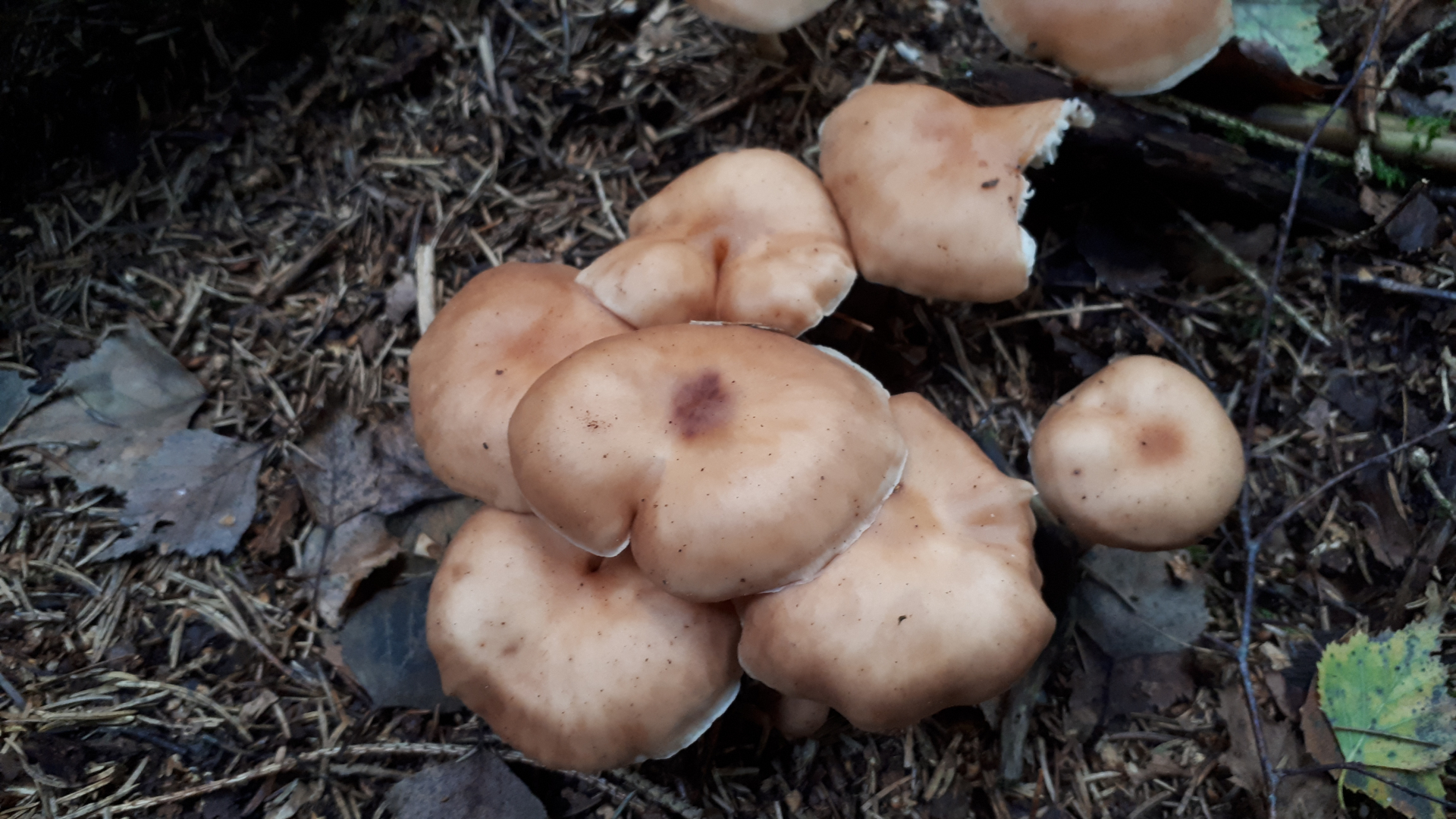 Bei dem graubraunen Hut und dem festen Fleisch musste ich an helle Räslinge denken. Was meint ihr? Im Schatten (im Dunkel) junger Fichten gefunden, büschelig wachsend. Lg