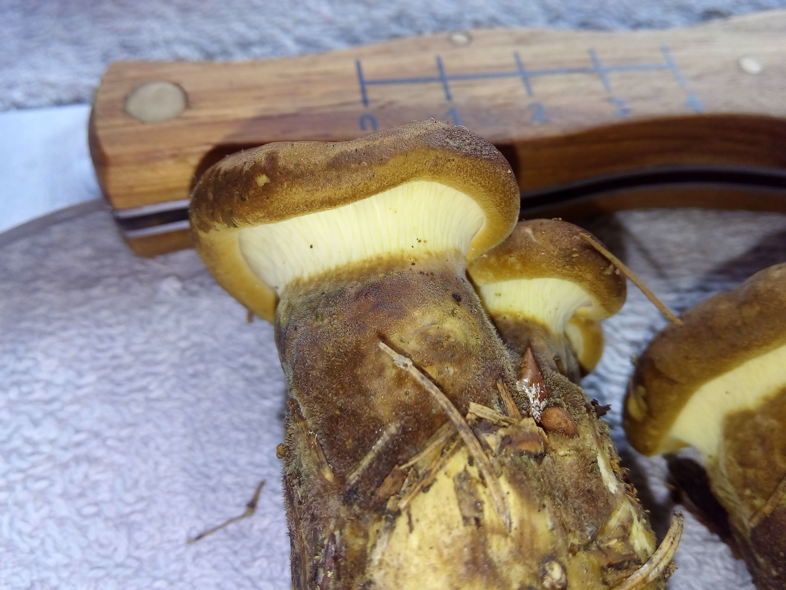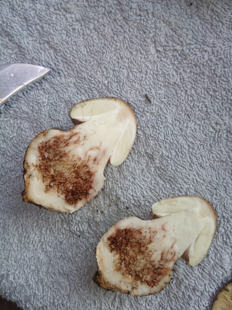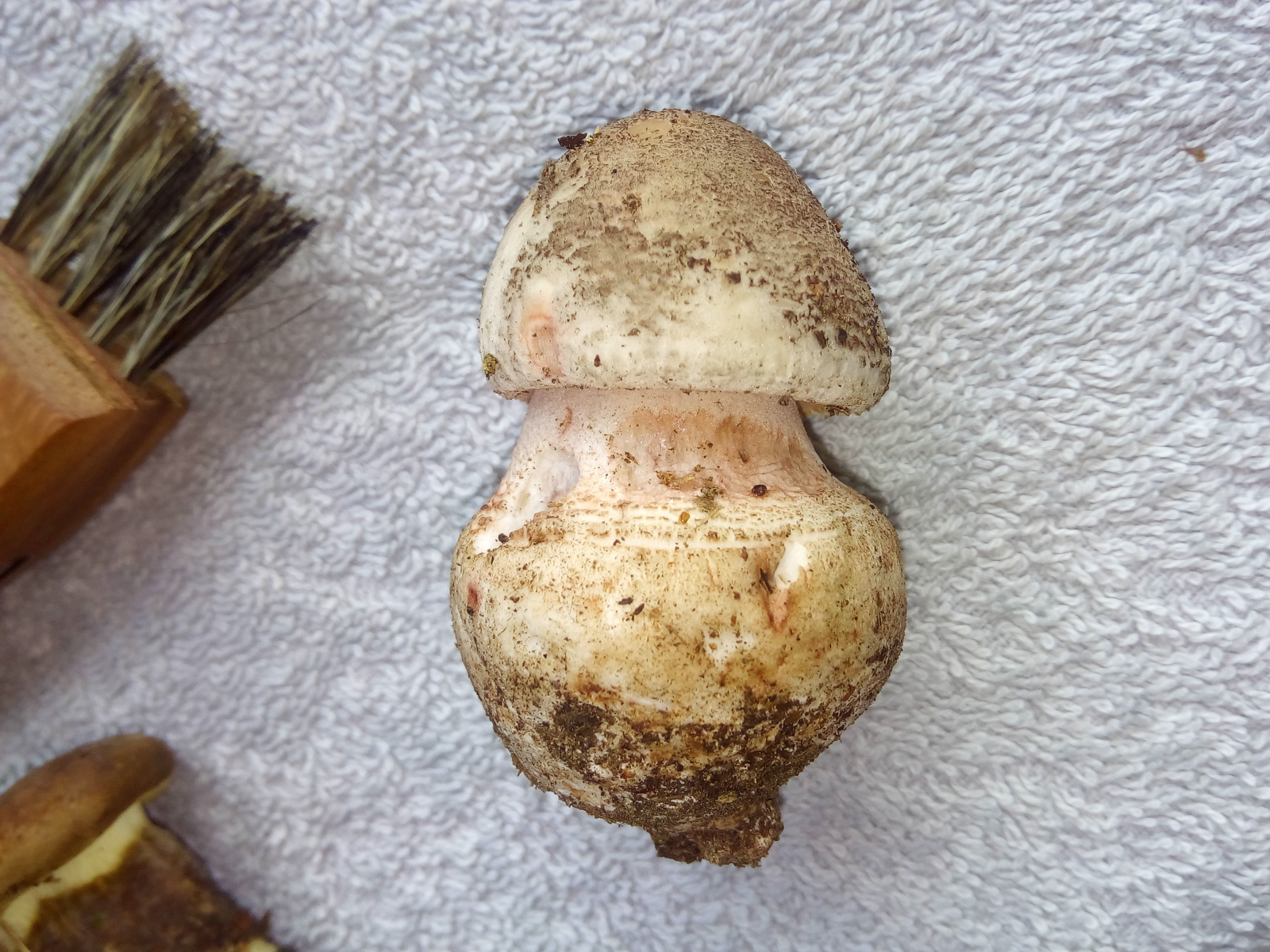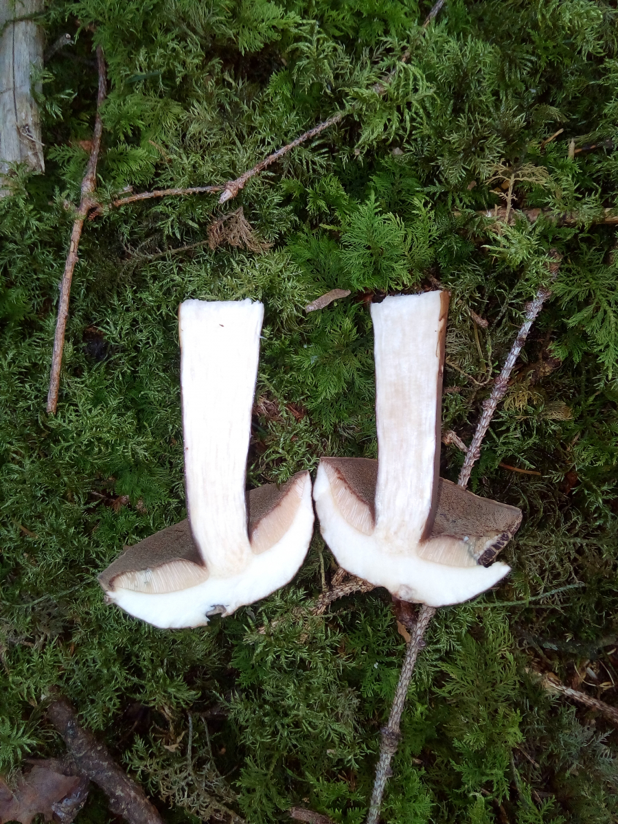 Und zu guter letzt, ein interessanter Pilz, von dem ich mehrere gesehen habe aber nur ein Exemplar zur Bestimmung mitgenommen habe. Beim durchschneiden zuhause gesehen dass er madig ist