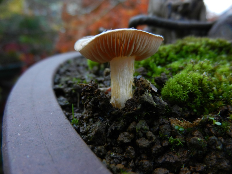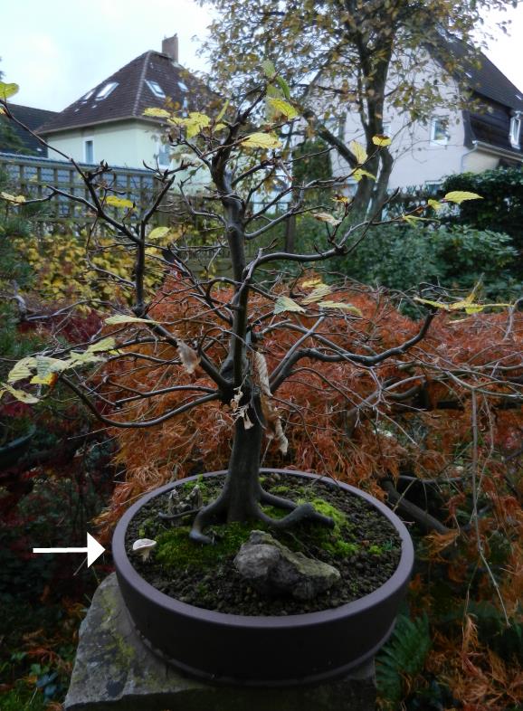 Ich habe in einer meiner Bonsai-Schalen mit Hainbuche einen Pilz entdeckt, den ich nicht bestimmen konnte.