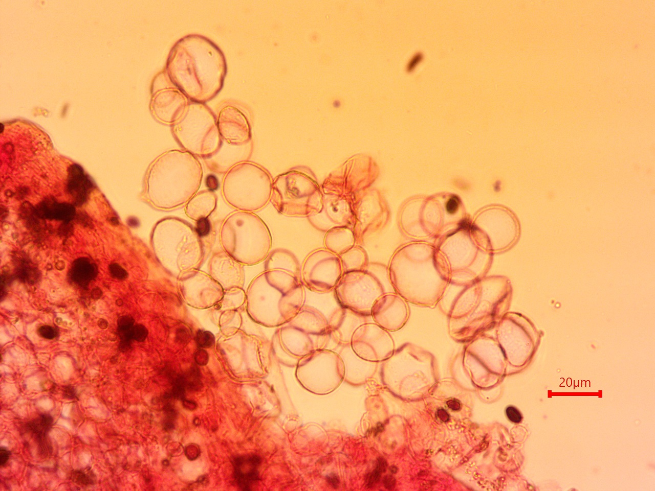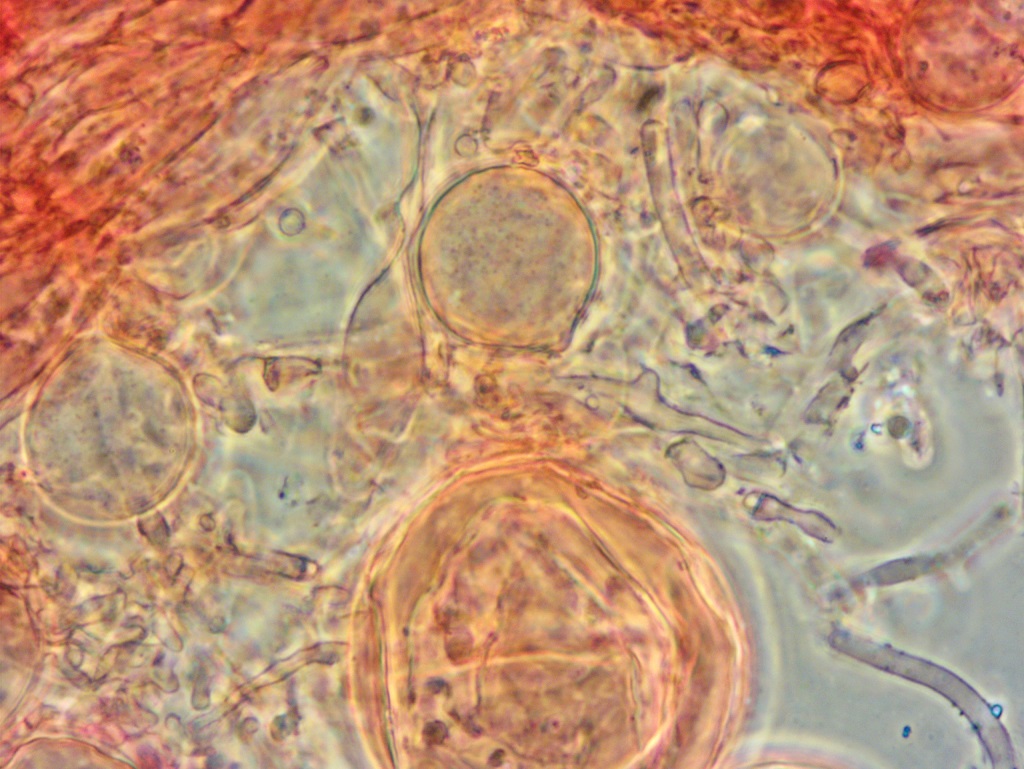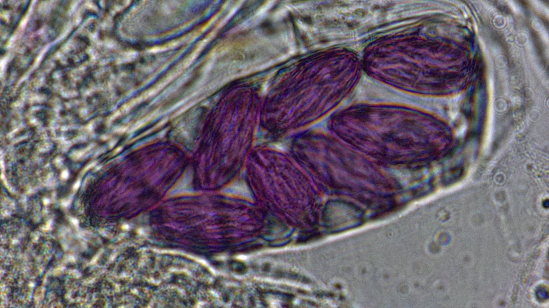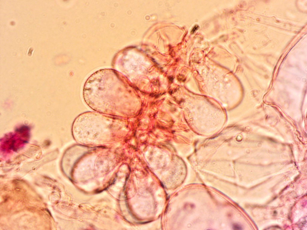 Asci und Sporen. Sporengröße: 19,3-23,6x10,3-11,7 im Ascus gemessen, weil freie Sporen nicht da waren: Bilder 5,6 und 7