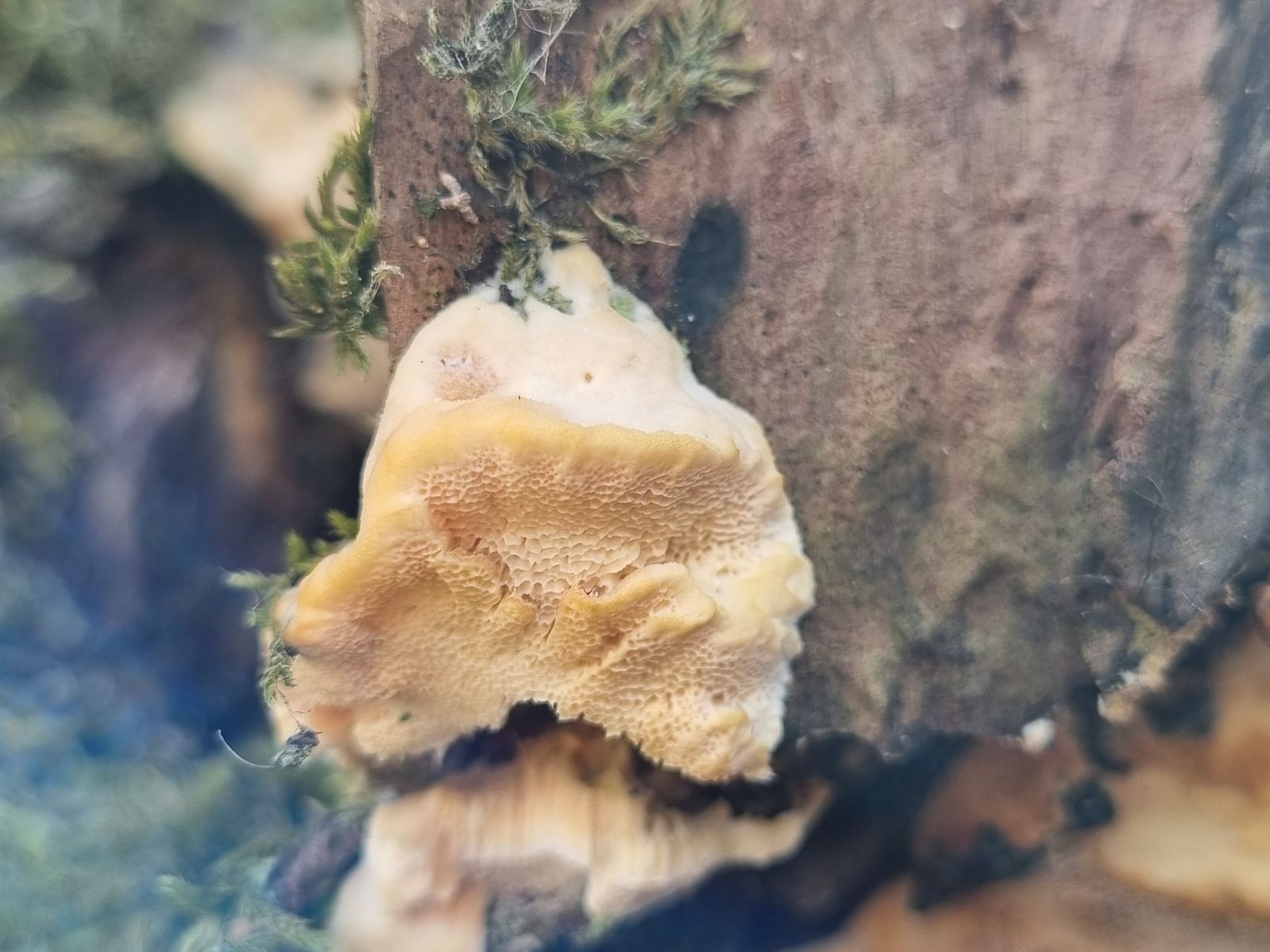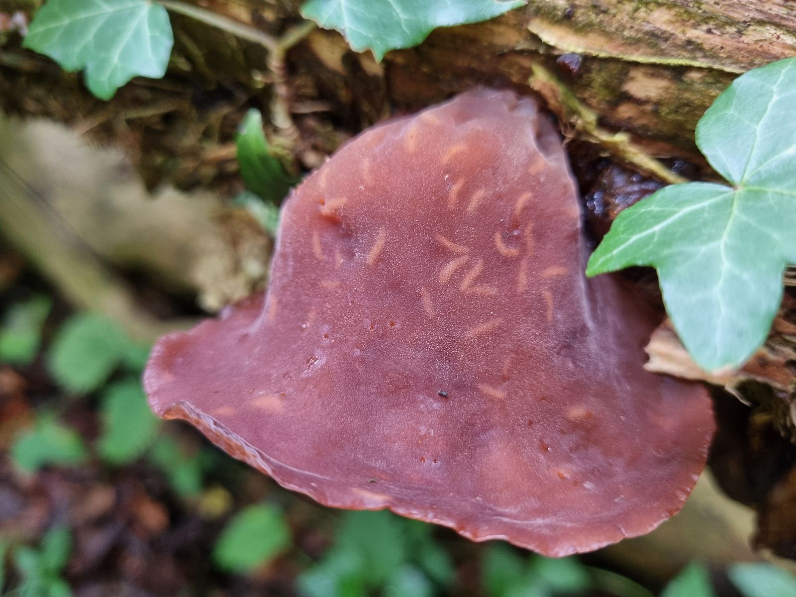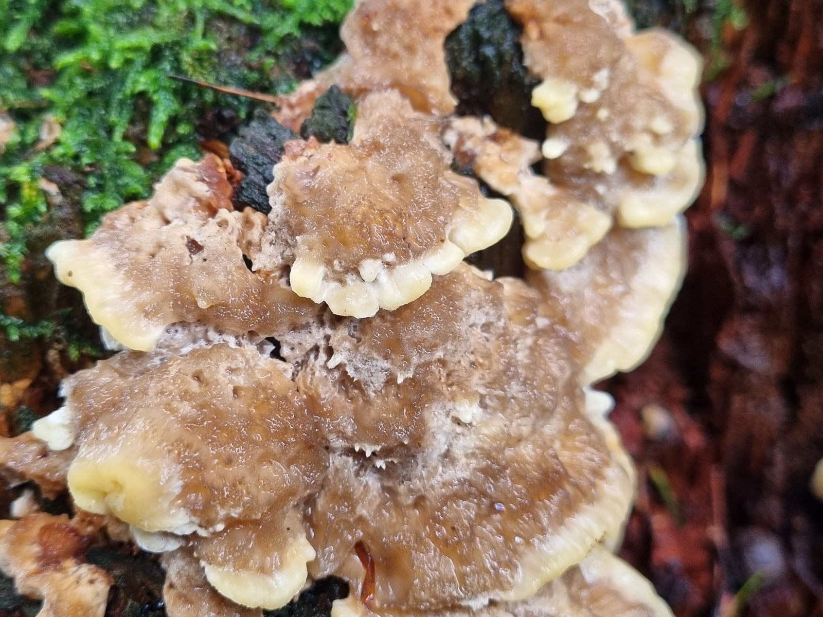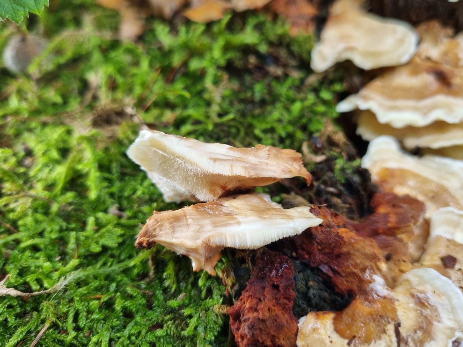 Der Pilz ist recht zäh, hat kleine Poren, geruchlich unbedeutend. Verfärbt nicht auf Druck/wird beim Abtrocknen dunkler, stufenartiges Wachstum. Ausdehnung gesamt ca 15cm, das letzte hütchen ist bei 2cm.