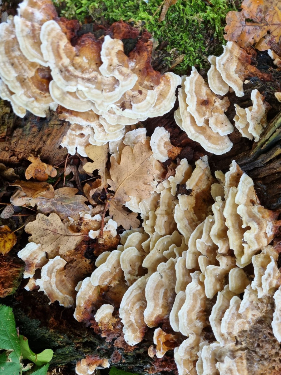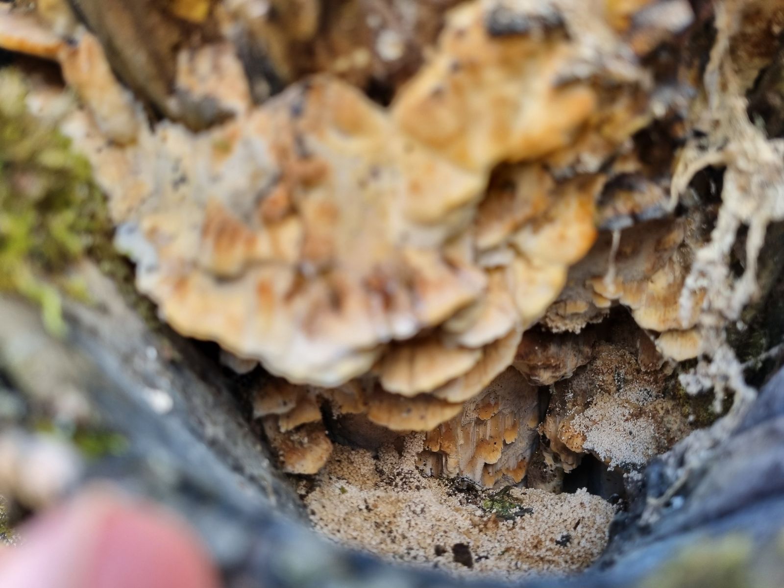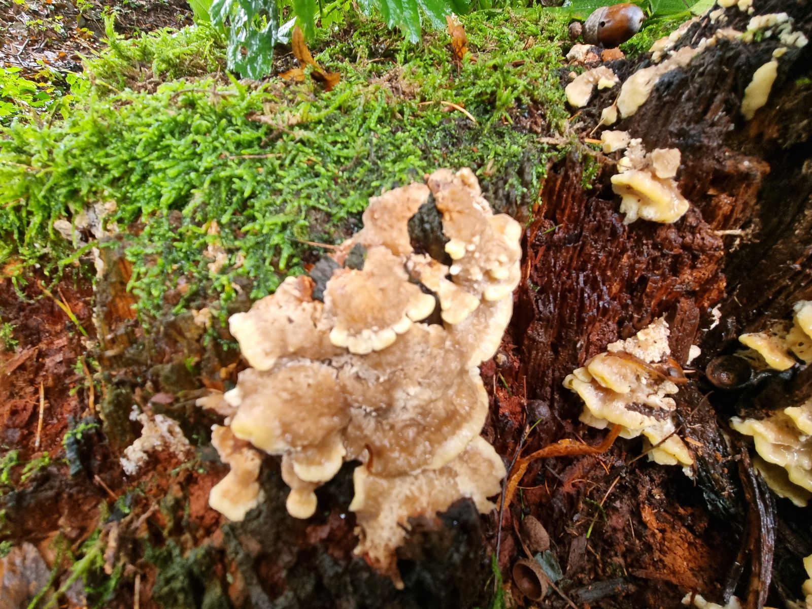 Der Pilz ist recht zäh, hat kleine Poren, geruchlich unbedeutend. Verfärbt nicht auf Druck/wird beim Abtrocknen dunkler, stufenartiges Wachstum. Ausdehnung gesamt ca 15cm, das letzte hütchen ist bei 2cm.