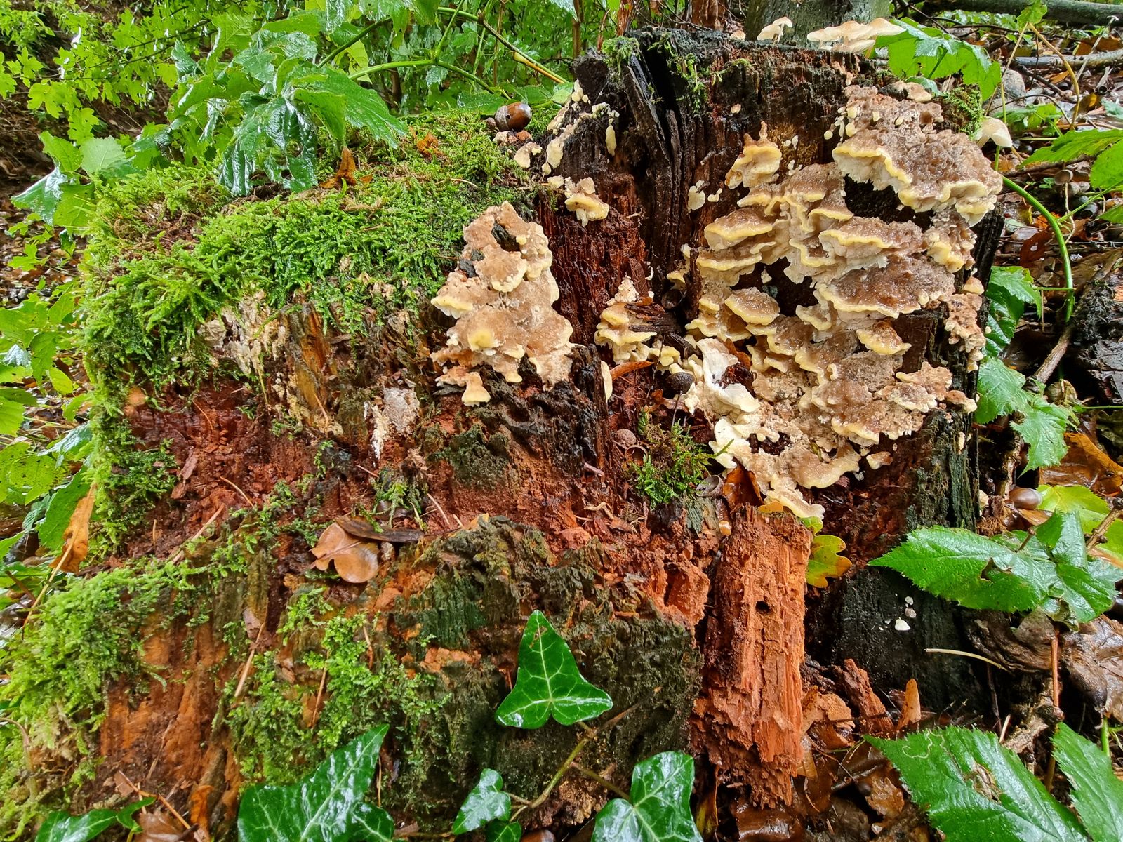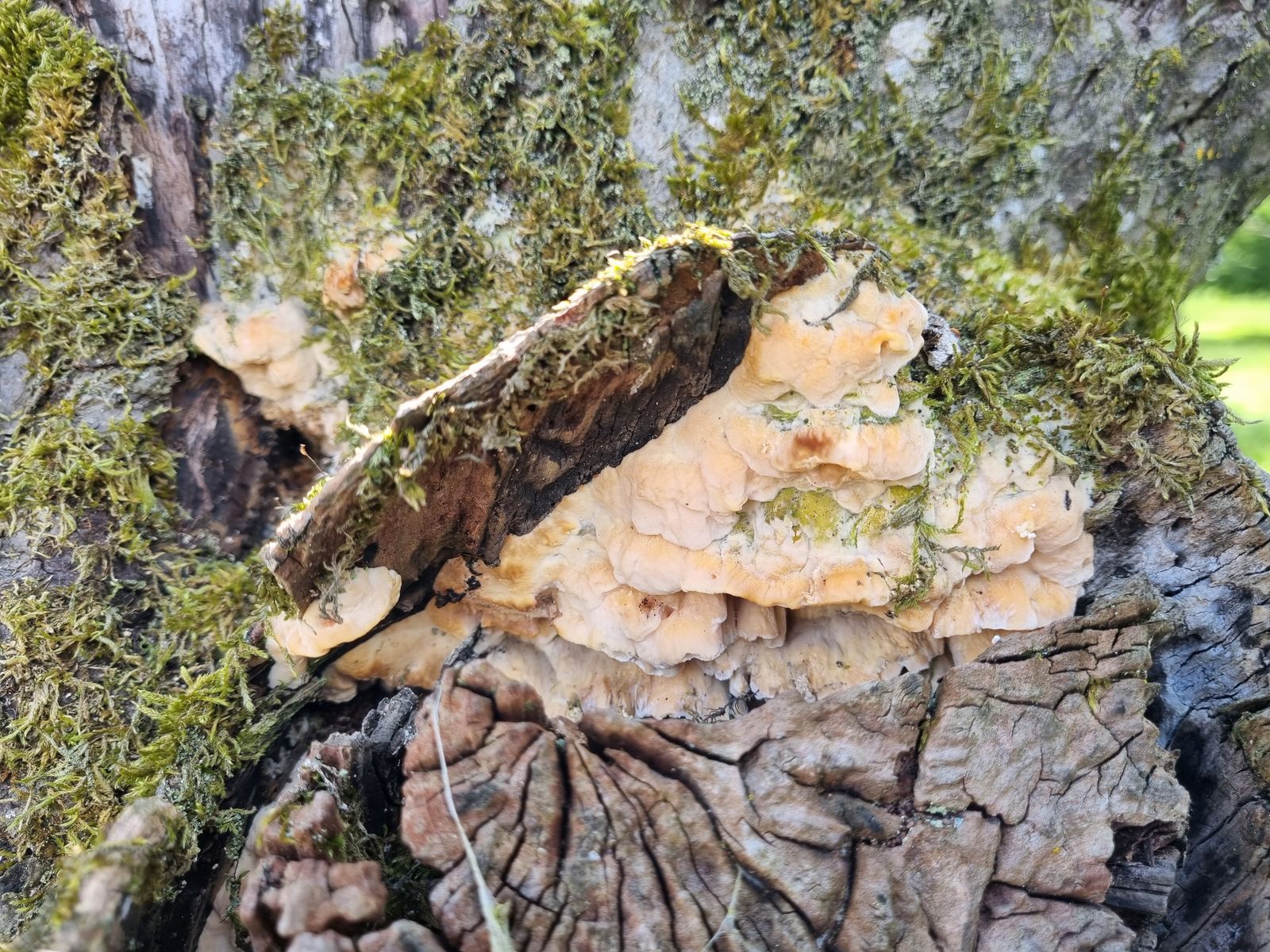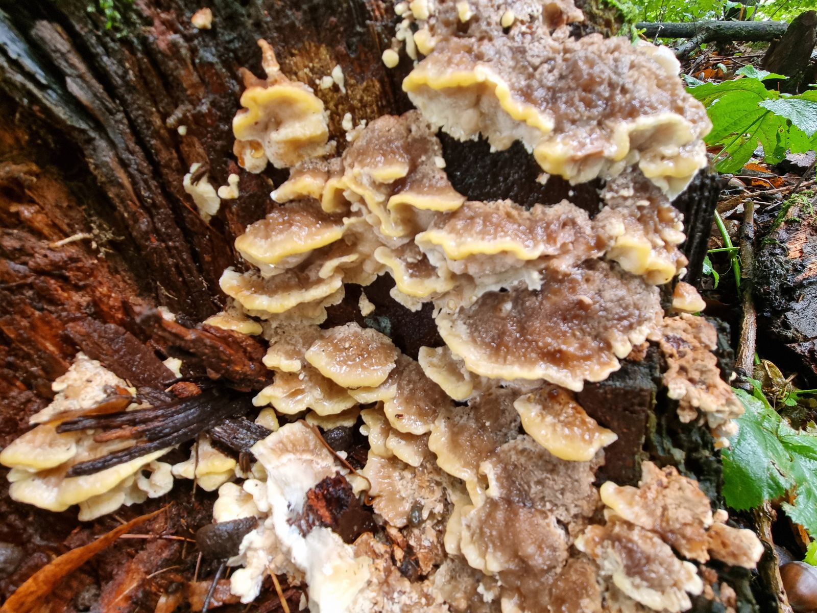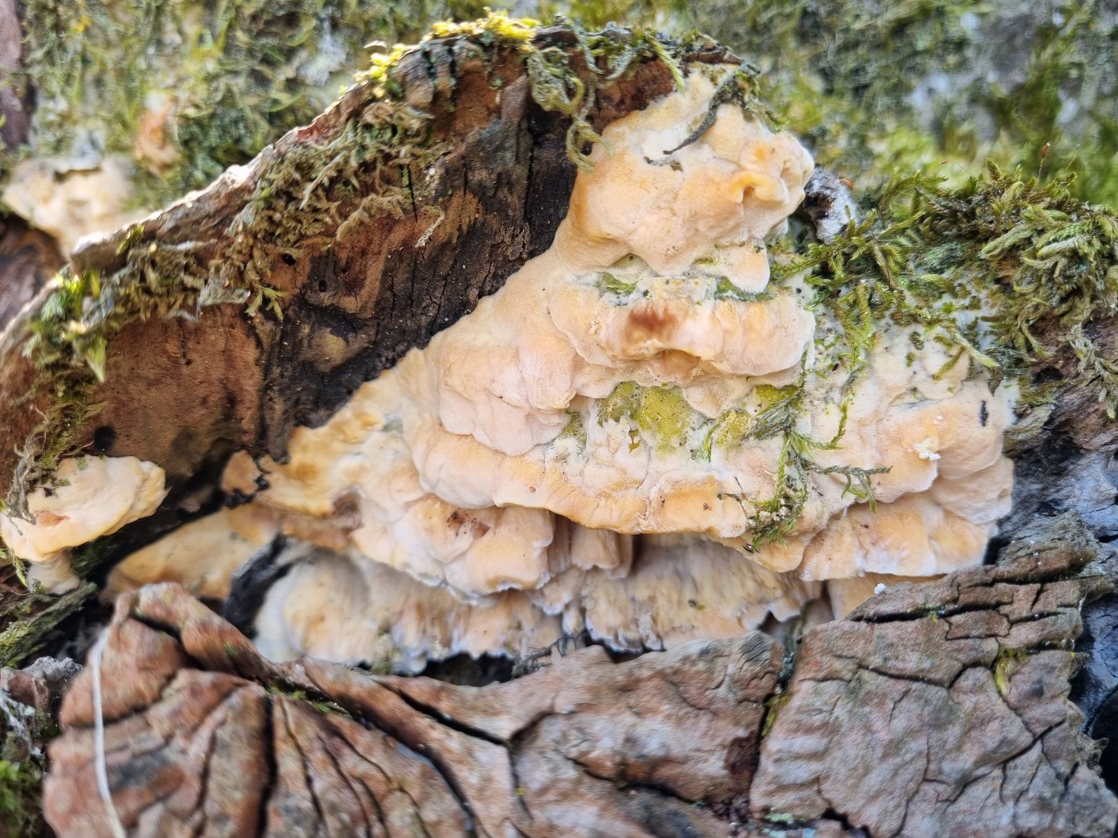 Der Pilz ist recht zäh, hat kleine Poren, geruchlich unbedeutend. Verfärbt nicht auf Druck/wird beim Abtrocknen dunkler, stufenartiges Wachstum. Ausdehnung gesamt ca 15cm, das letzte hütchen ist bei 2cm.