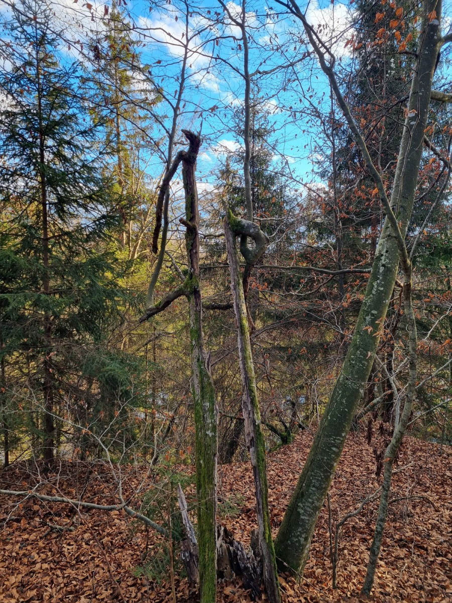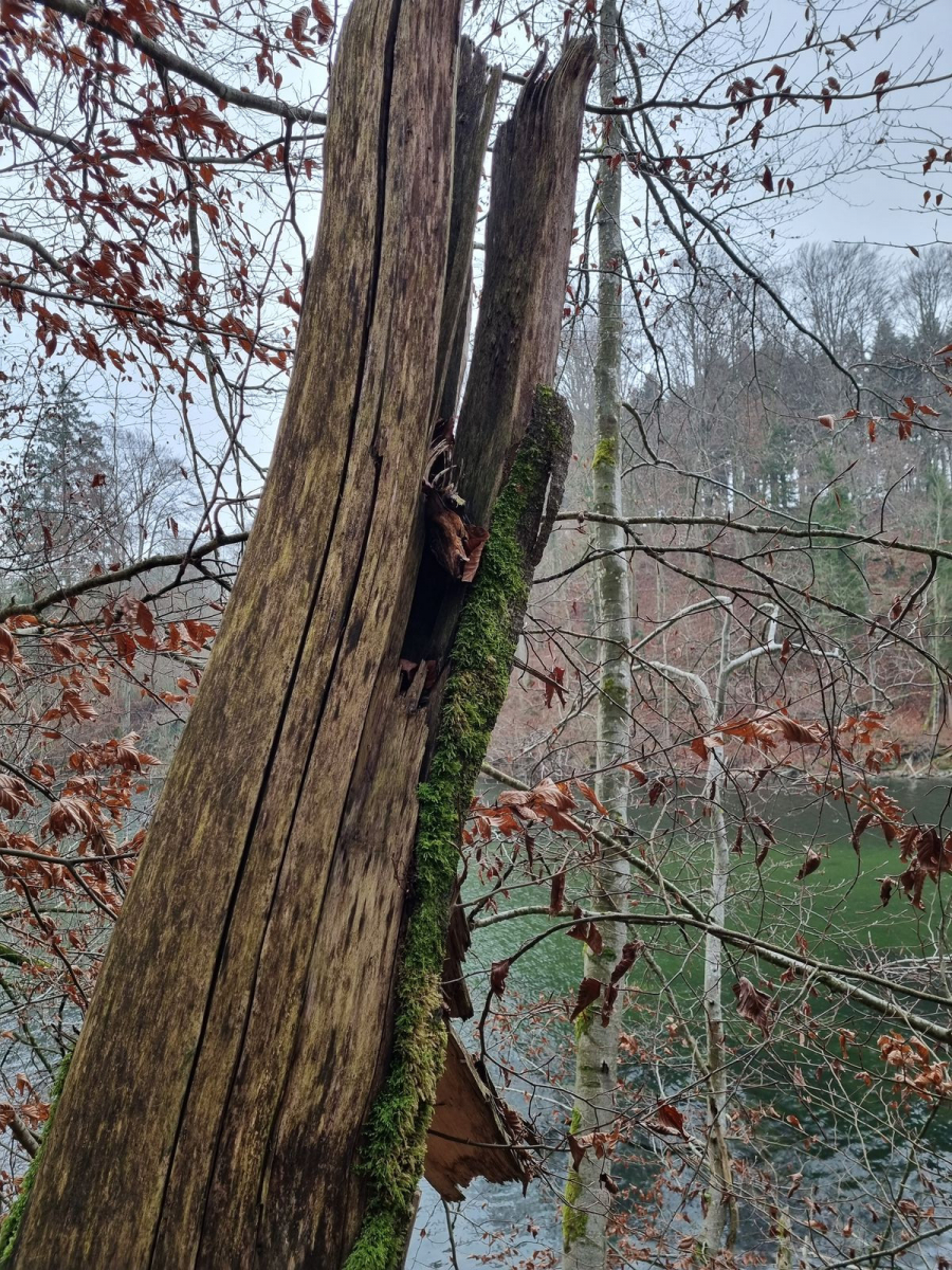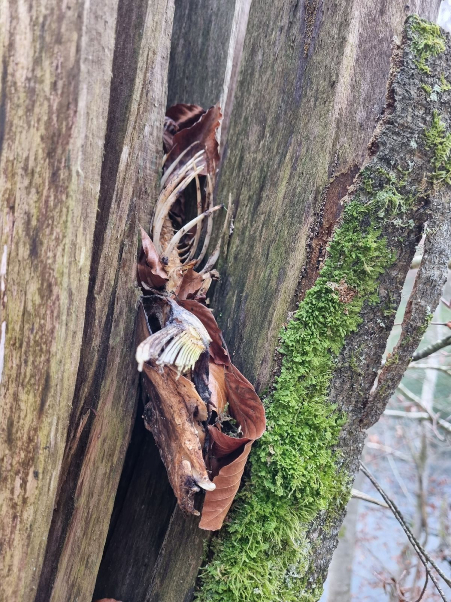 In ca 1, 5m Höhe in einer gespaltenen Buche hab ich die Überreste einer Barbe gefunden.