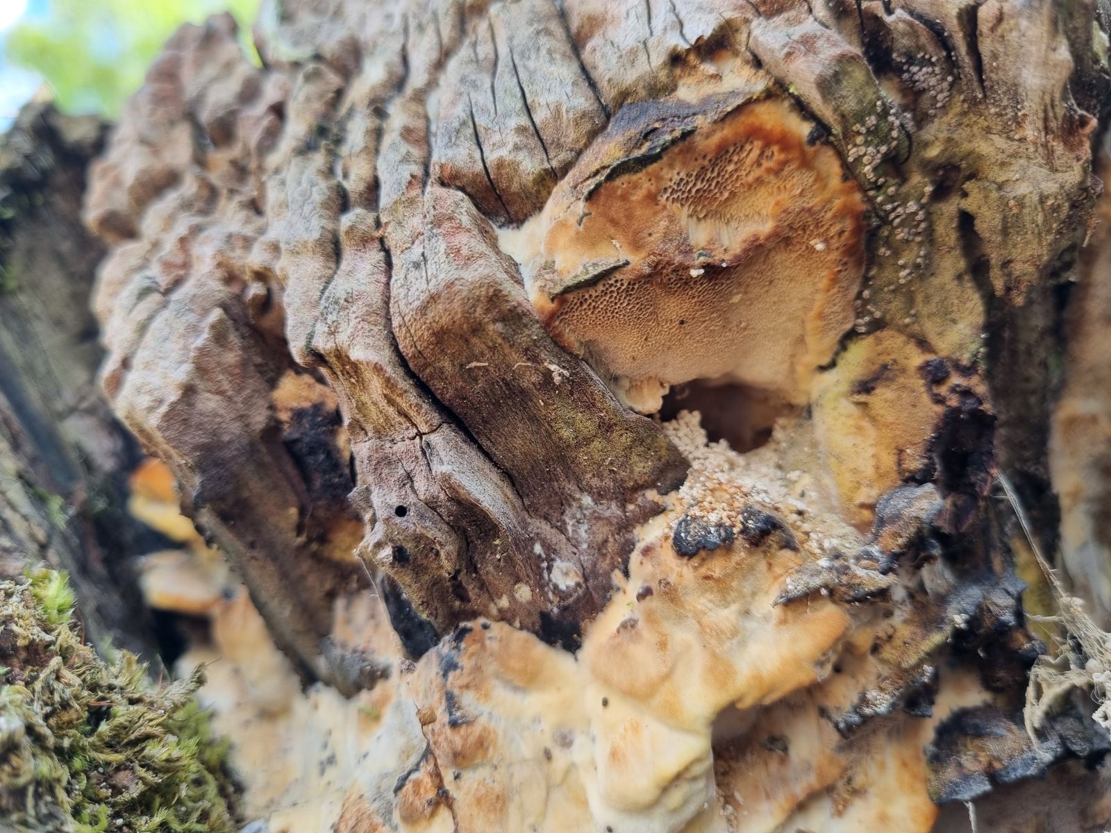 Der Pilz ist recht zäh, hat kleine Poren, geruchlich unbedeutend. Verfärbt nicht auf Druck/wird beim Abtrocknen dunkler, stufenartiges Wachstum. Ausdehnung gesamt ca 15cm, das letzte hütchen ist bei 2cm.