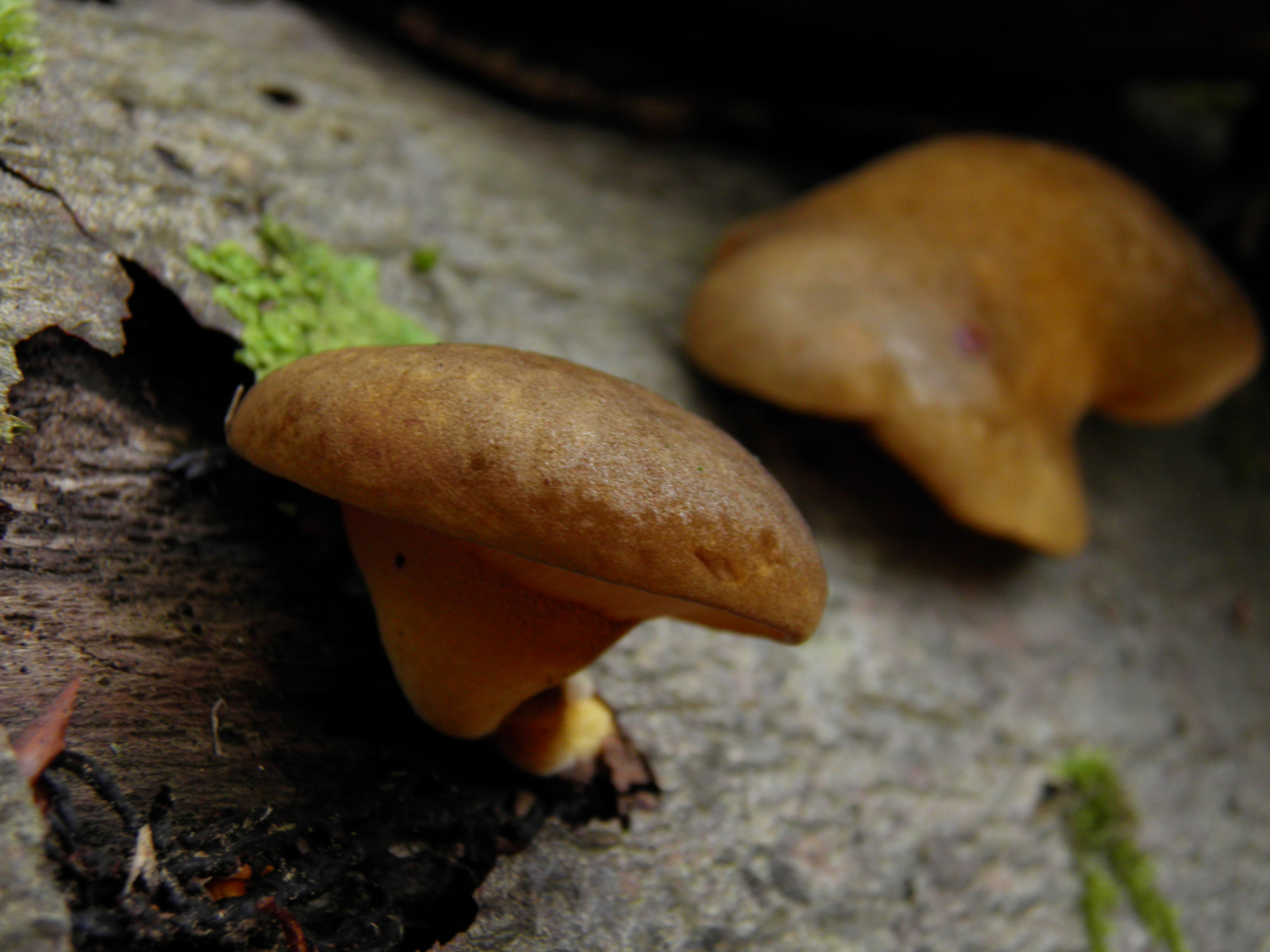 hier Mitte Oktober an morscher fichte, hüte ca 2-3cm, Geruch unbedeutend, keine Verfärbung auf Druck