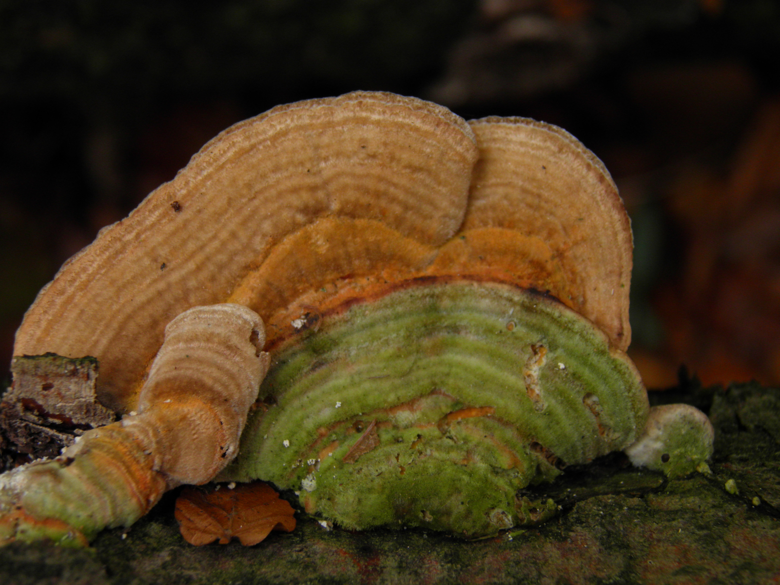 orange/weiß: vmtl duftender goldporling und reihige tramete im nachbarschaftsstreit