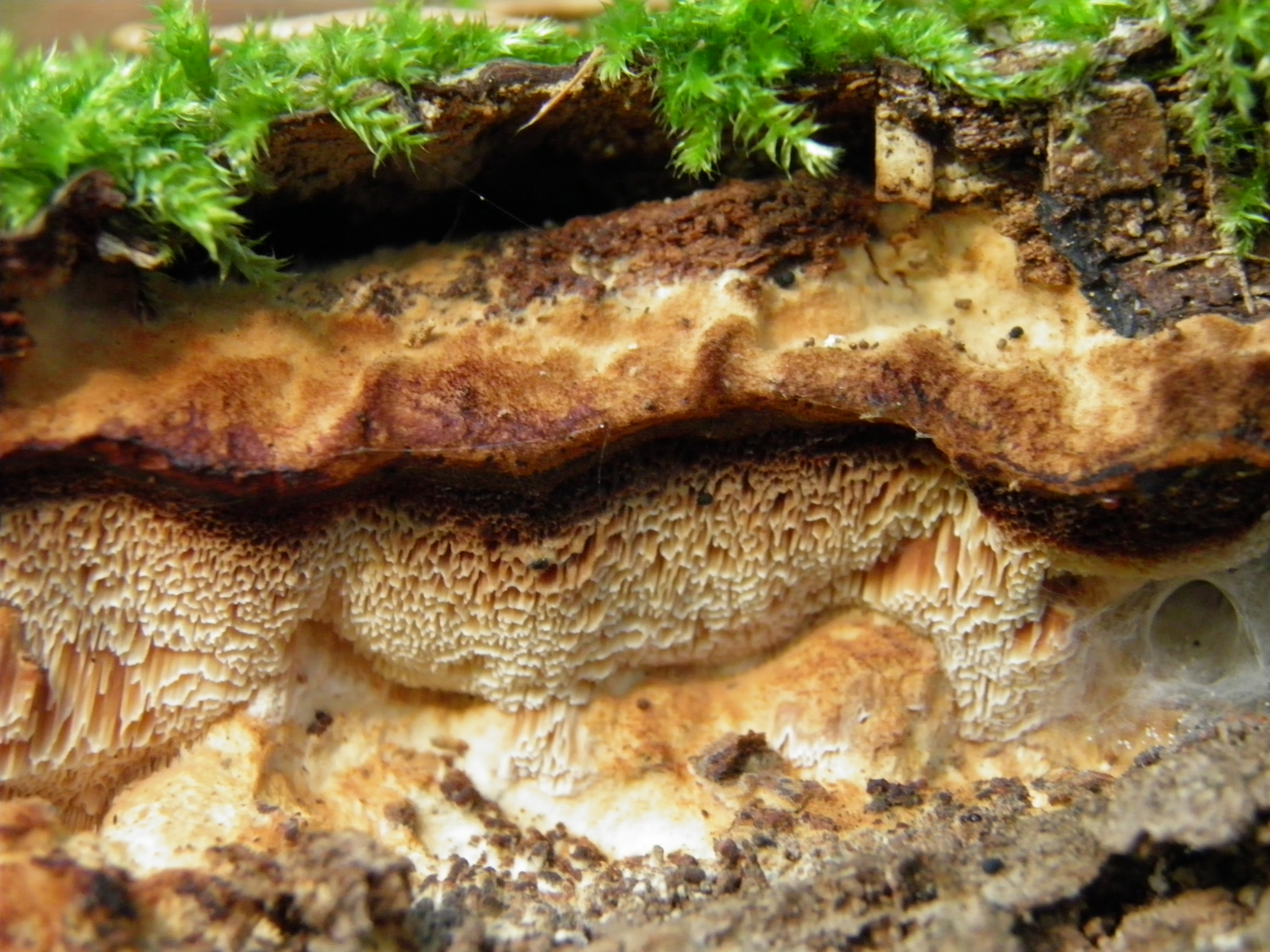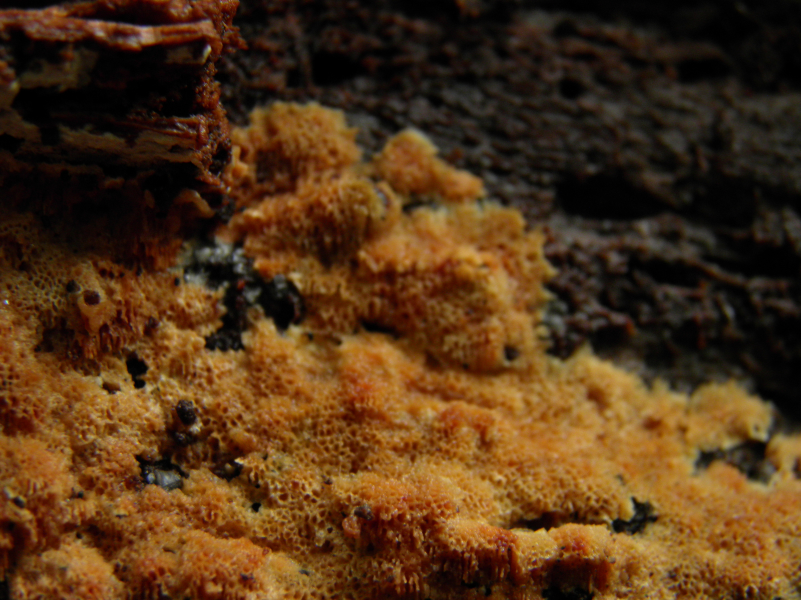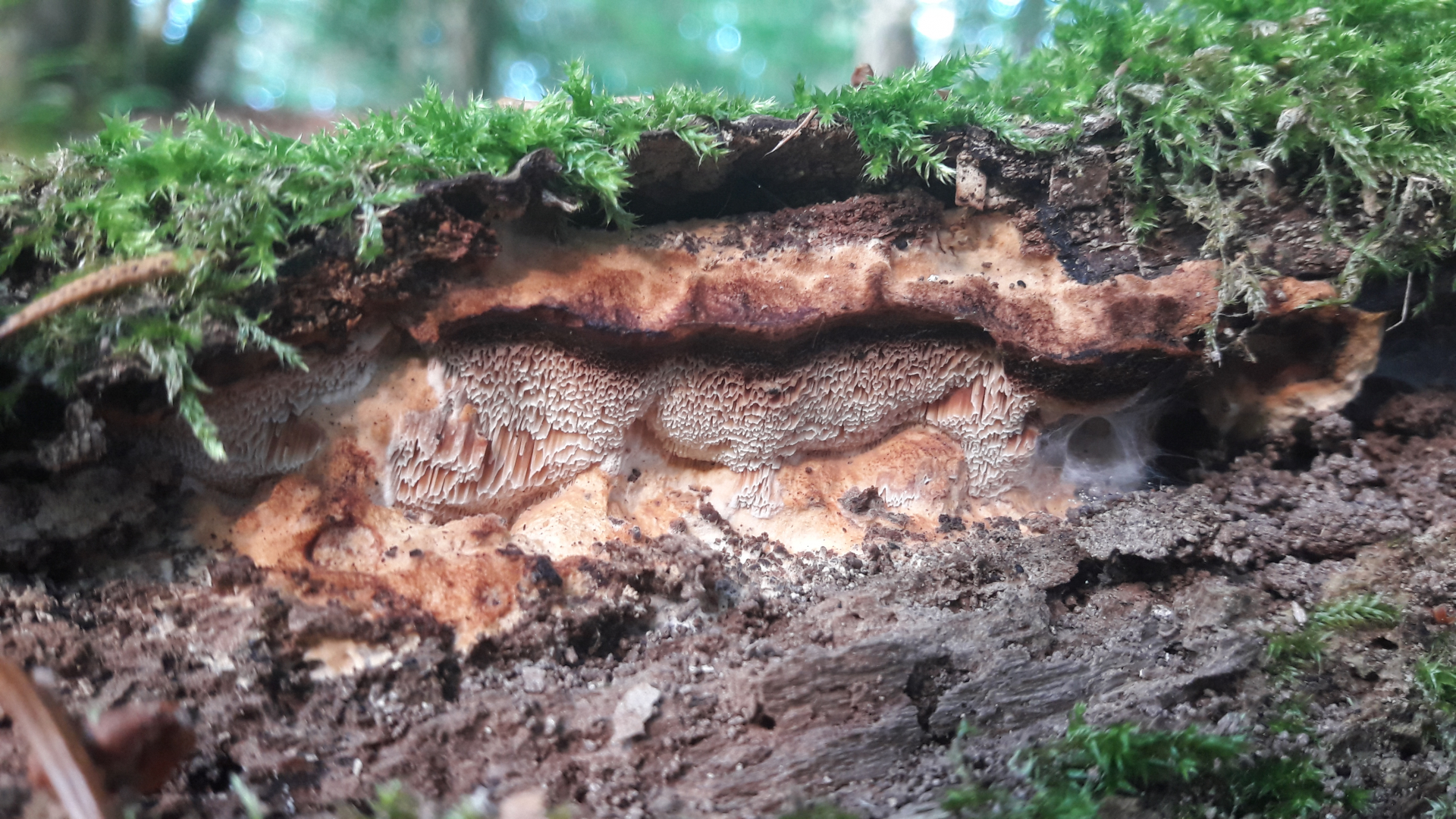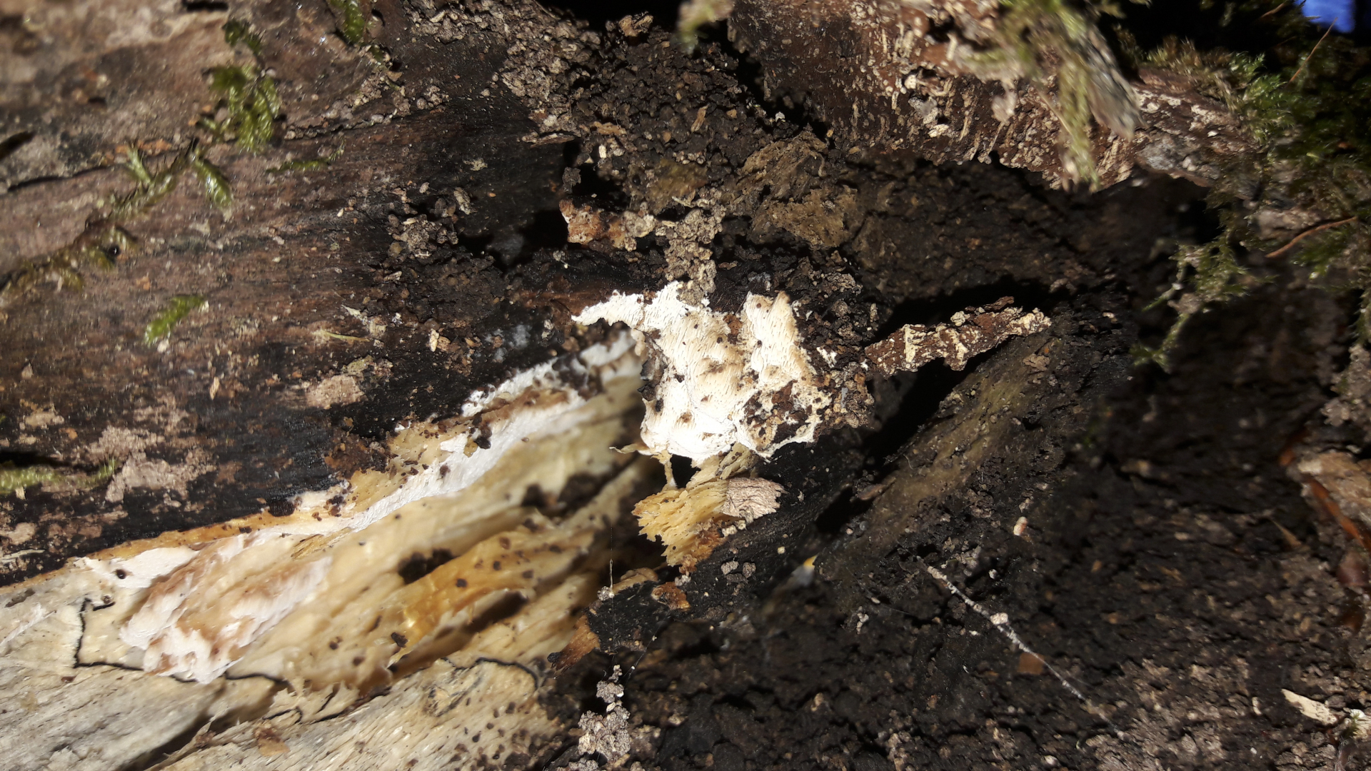 an Unterseite einer liegenden morschen Fichte mglw. Cineromyces lindbladii