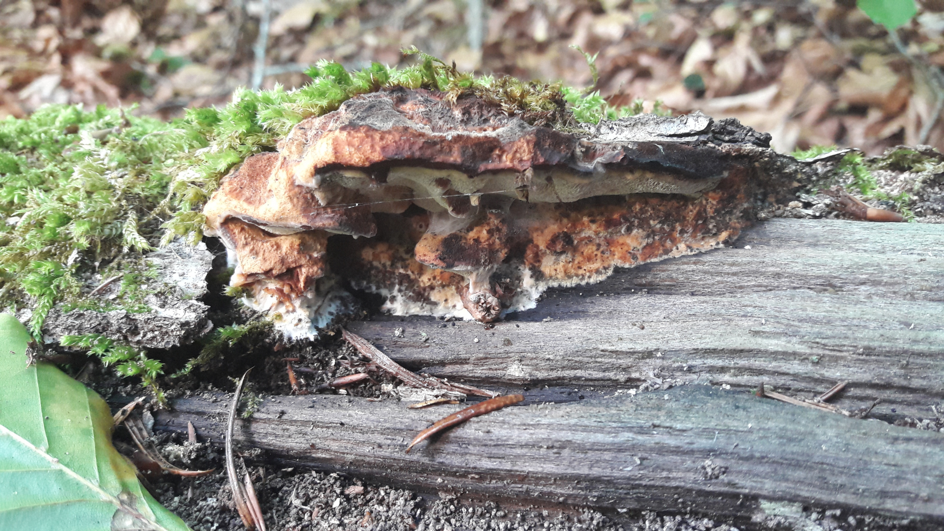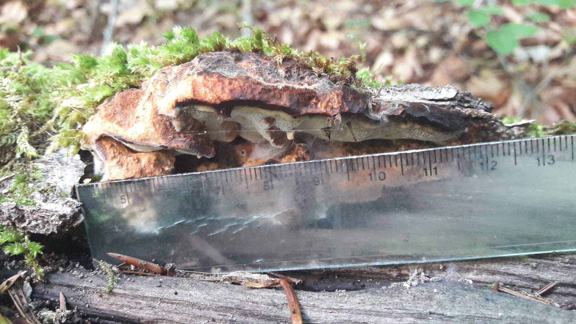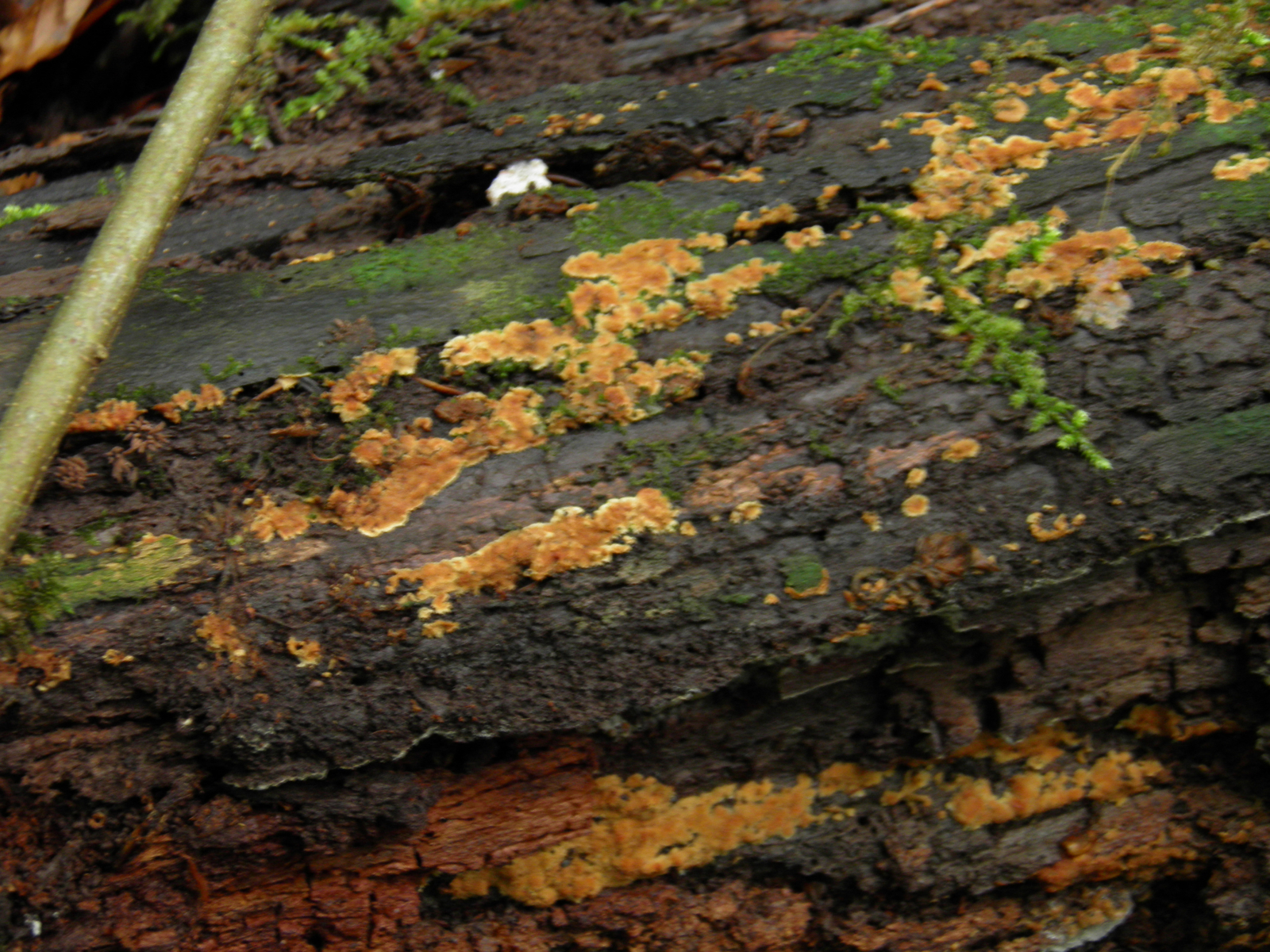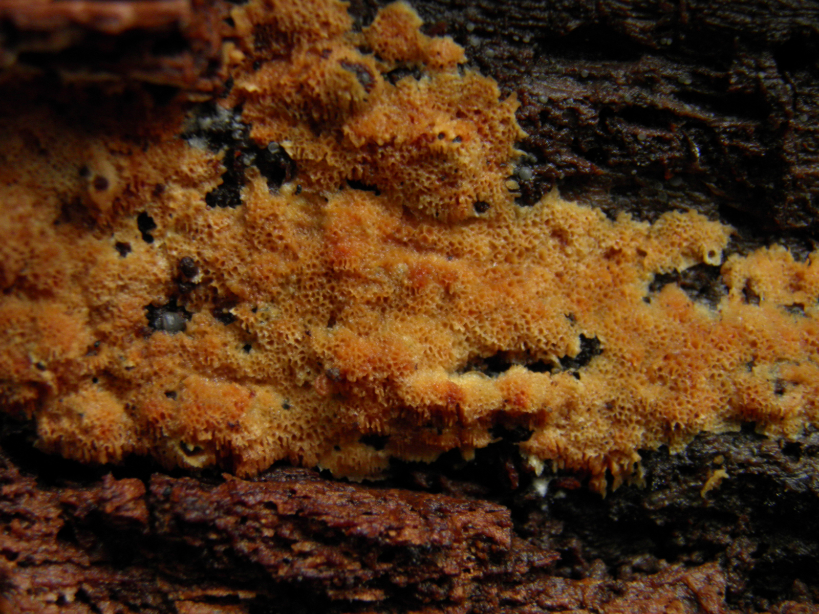 an Unterseite einer liegenden morschen Fichte mglw. Cineromyces lindbladii