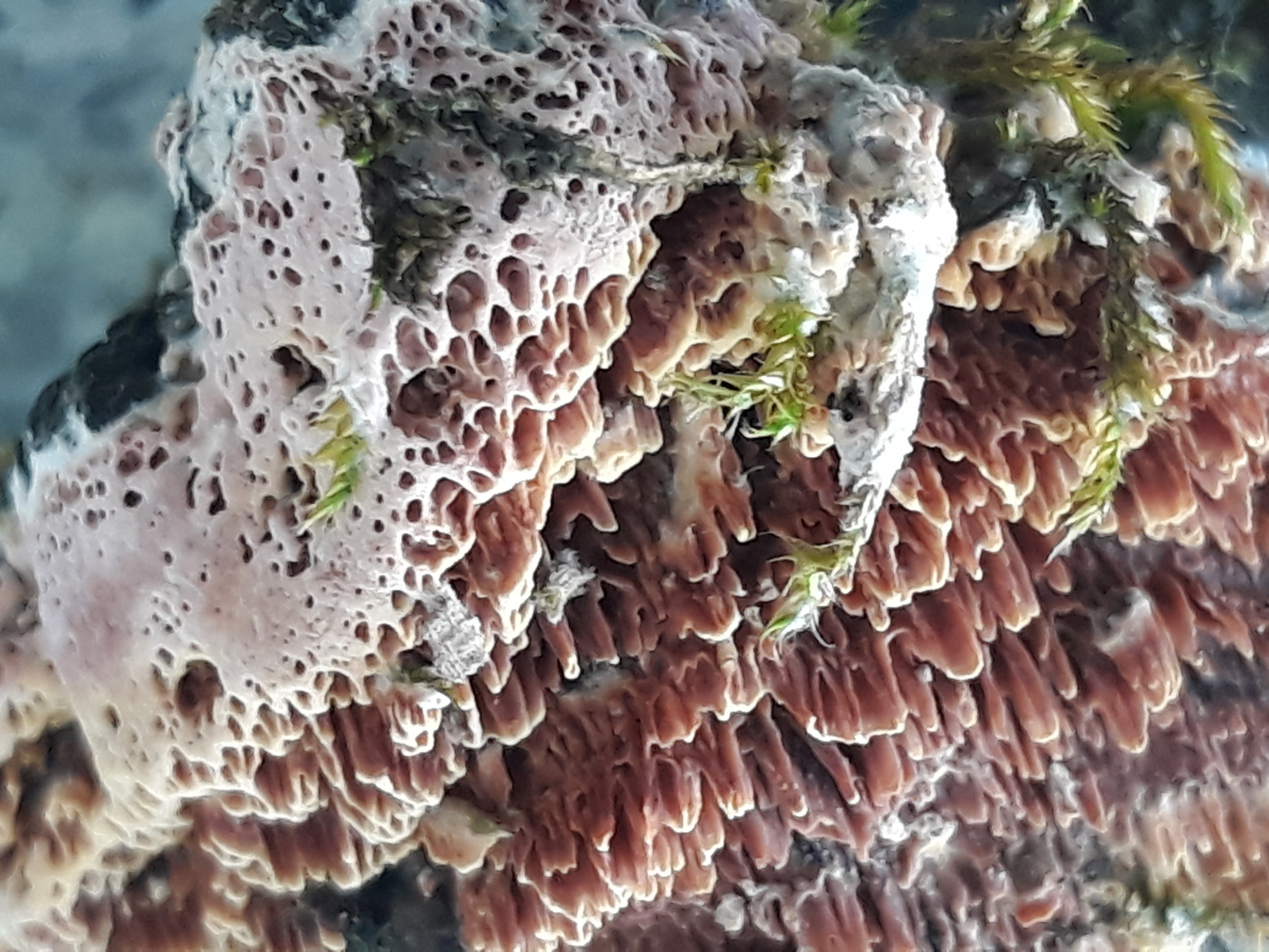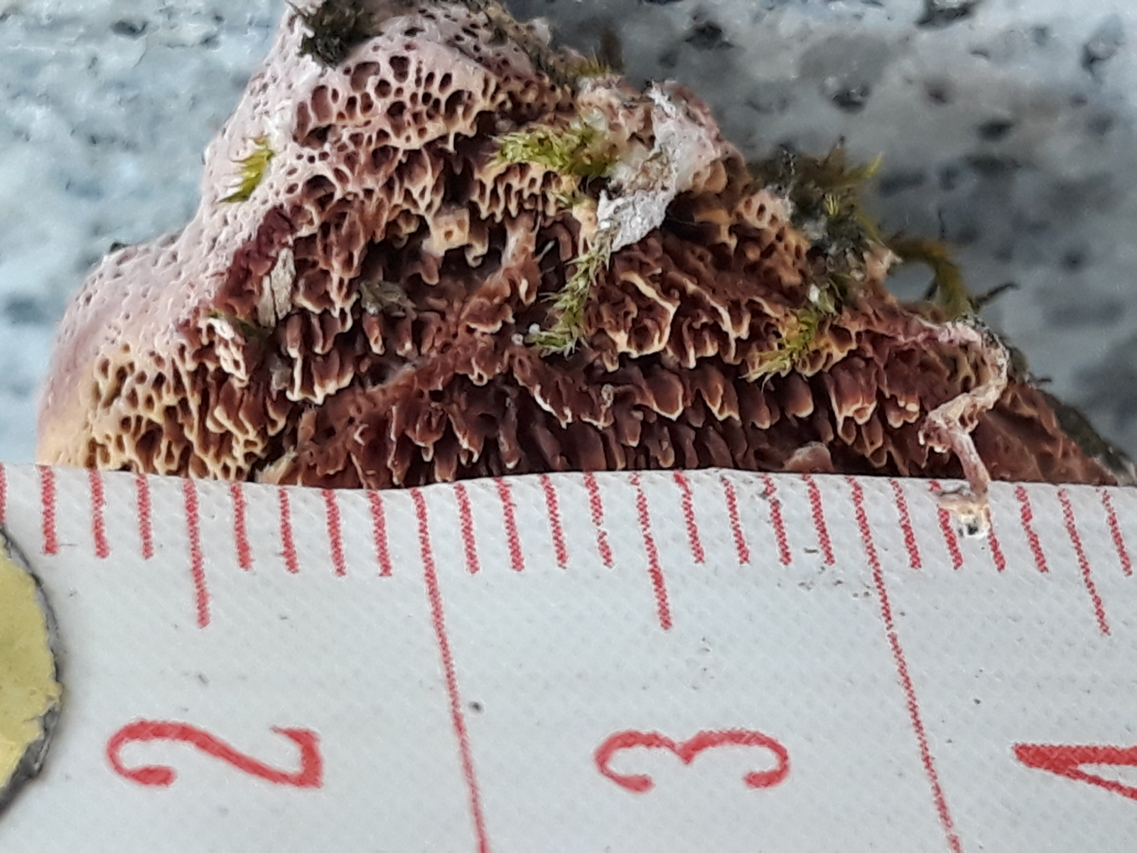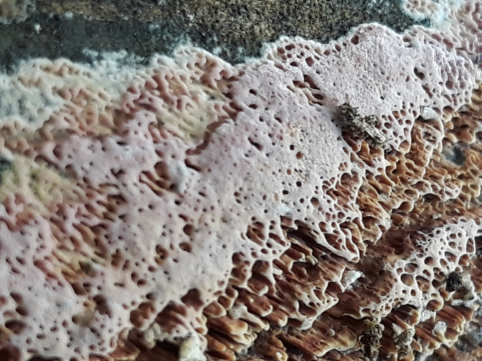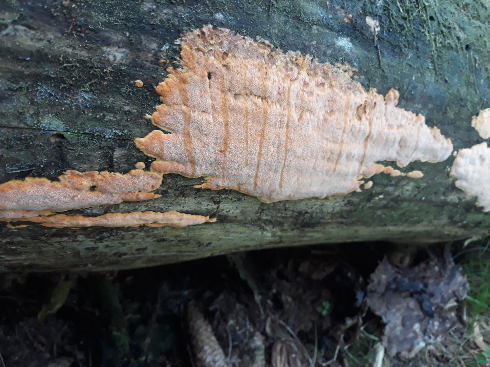 überwiegend resupinate Fruchtkörper, sehr zäh, keine offensichtlichen Verfärbungen, Geruch unbedeutend- ich würde da Richtung Antrodia tippen