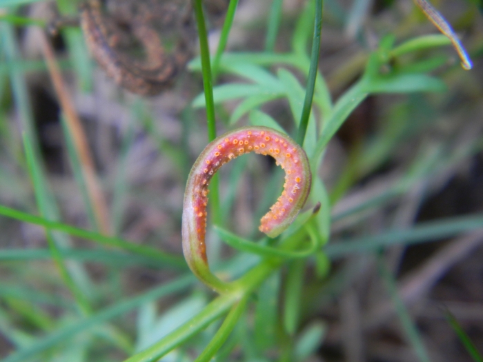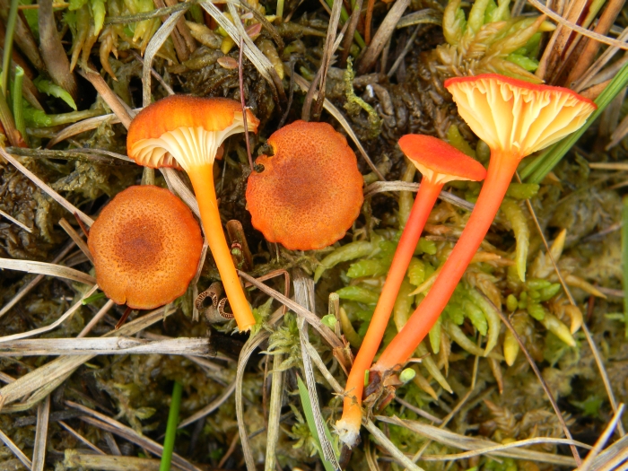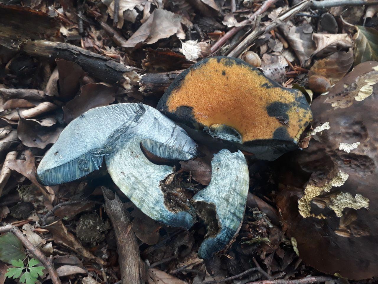 Bemerkenswert fand ich die dunkle Hutfarbe (auch des jüngsten, im Foto durchgeschnitten präsentierten Fruchtkörpers) und das sehr stark ausgeprägte Blauen des im frischen Anschnitt gelblichen Fleisches (an den genauen Farbton kann ich mich leider nicht erinnern und konnte ich aufgrund der schnellen Farbreaktion auch nicht fotographieren). Röhren orange-gelb, Stiel etwas rötlich beflockt (hoffe, das Foto gibt das her). Einen besonderen Geruch habe ich nicht wahrgenommen.