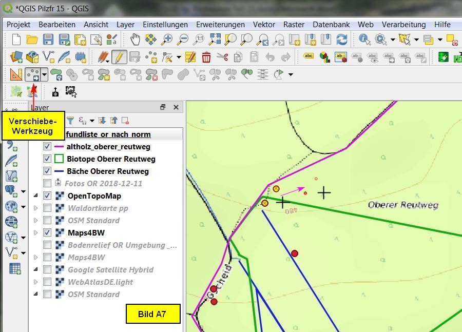 Es soll nun der Fundpunkt (Hypholoma fasciculare), von dem der kleine pinkfarbene Pfeil wegzeigt, in Pfeilrichtung verschoben werden.