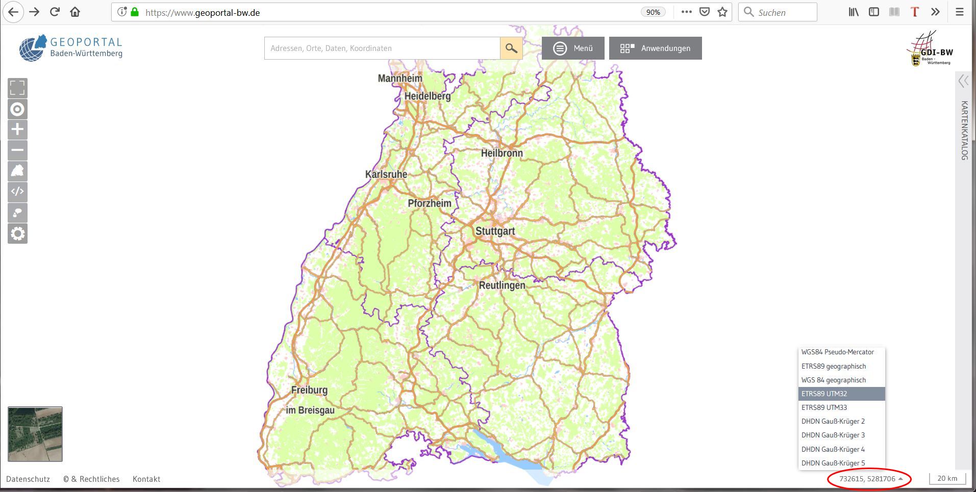 ETRS89 / UTM (Universal transverse Mercator) - Flächengetreues KBS in der Einheit Meter, d.h. geeignet zum Messen von Strecken und Flächen