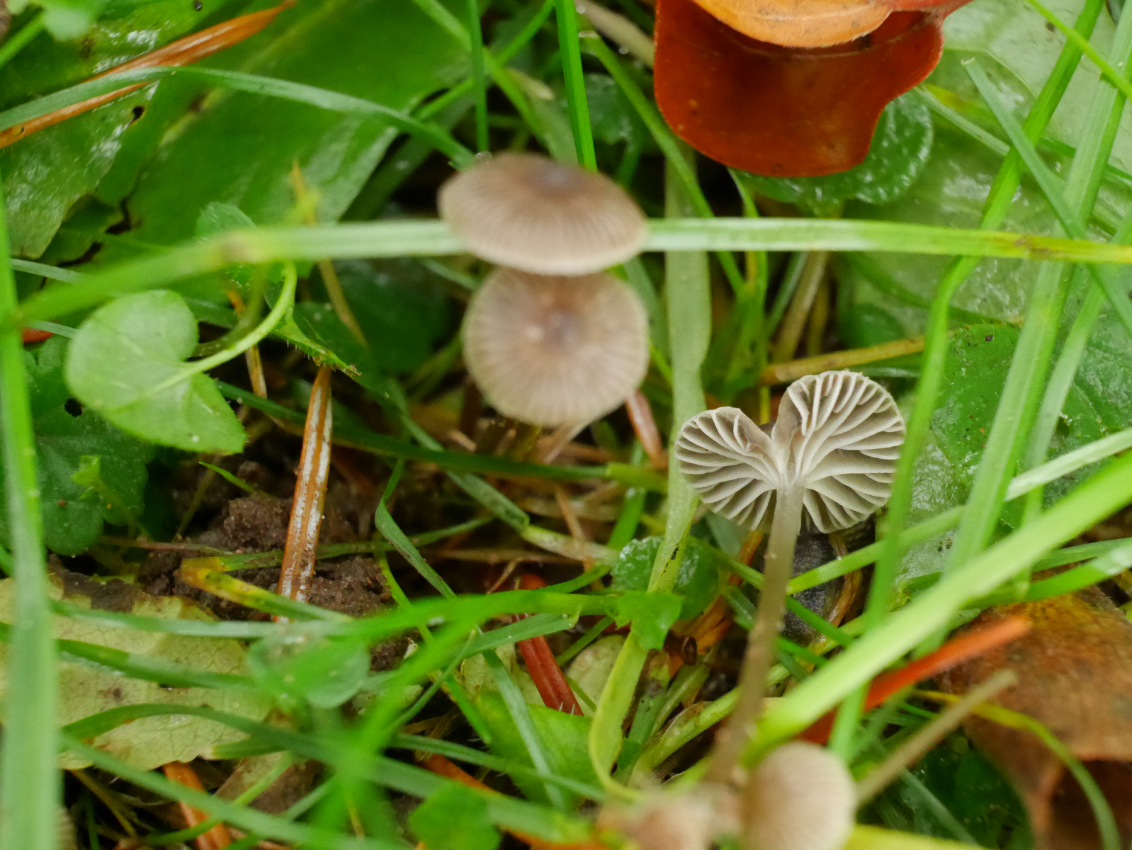 Mitte Oktober des letzten Jahres fand ich diese Helmlinge auf einer feuchten vermoosten Wiese auf sandigem Untergrund ganz in der Nähe eines Baches. Vielleicht hat jemand von Euch Erfahrung mit solchen kleinen Helmlingen und kann aus den drei von mir im Bestimmungsversuch ermittelten Arten die ein oder andere ausschließen oder neue ins Spiel bringen: