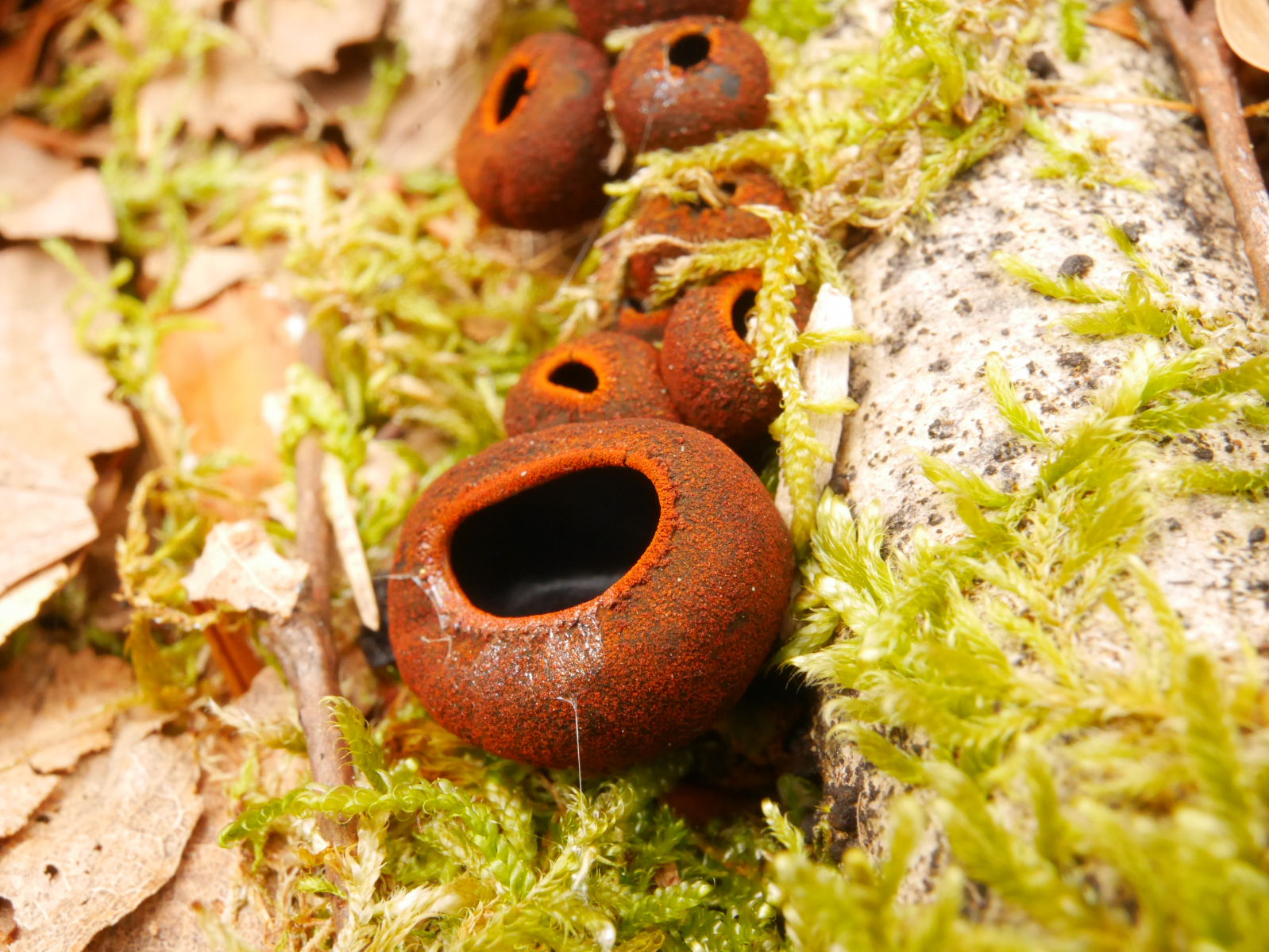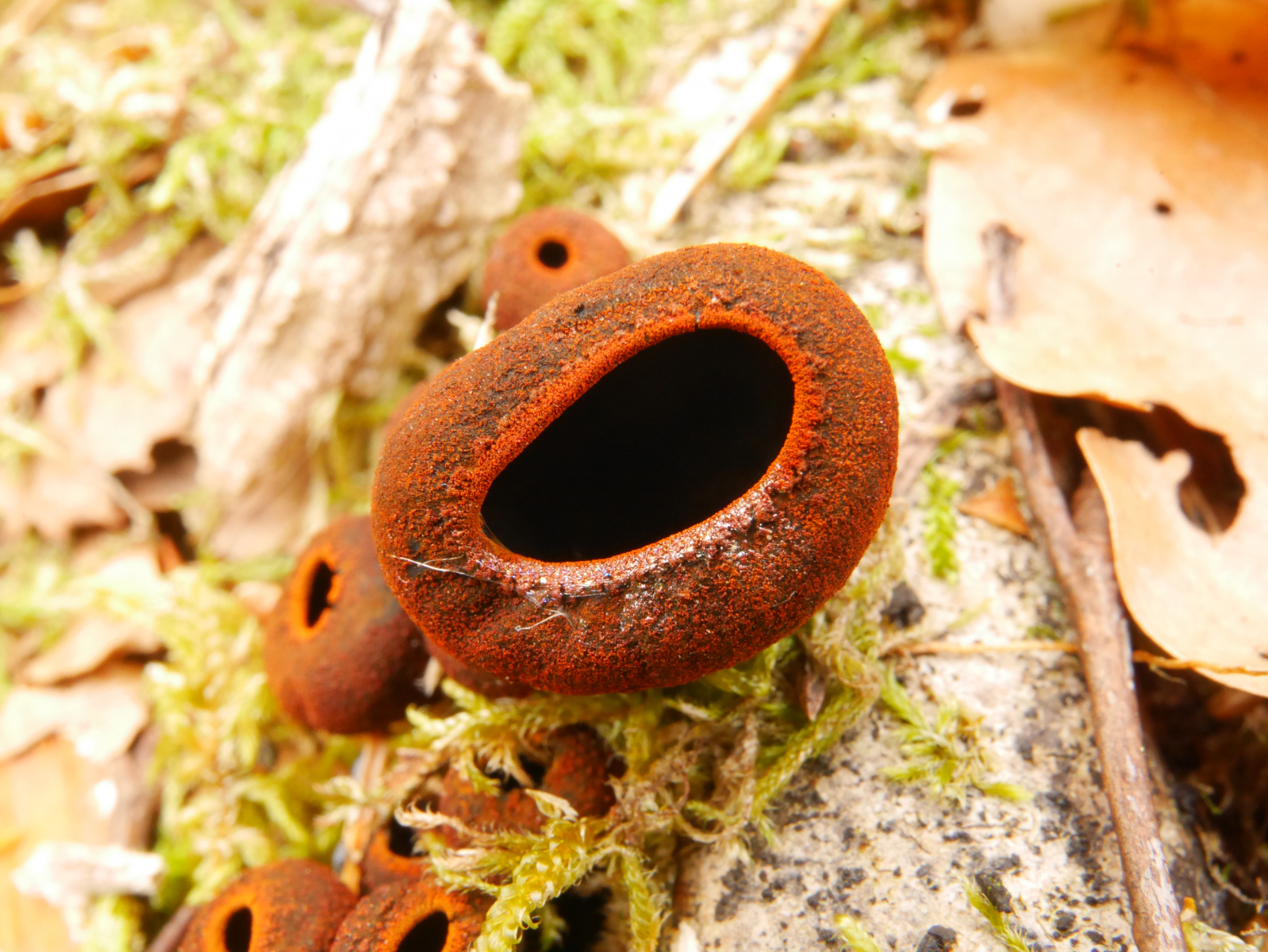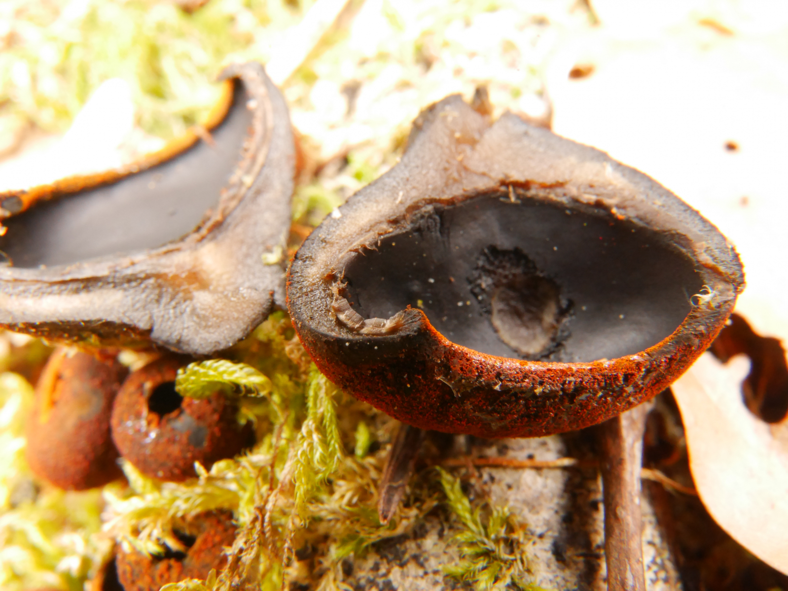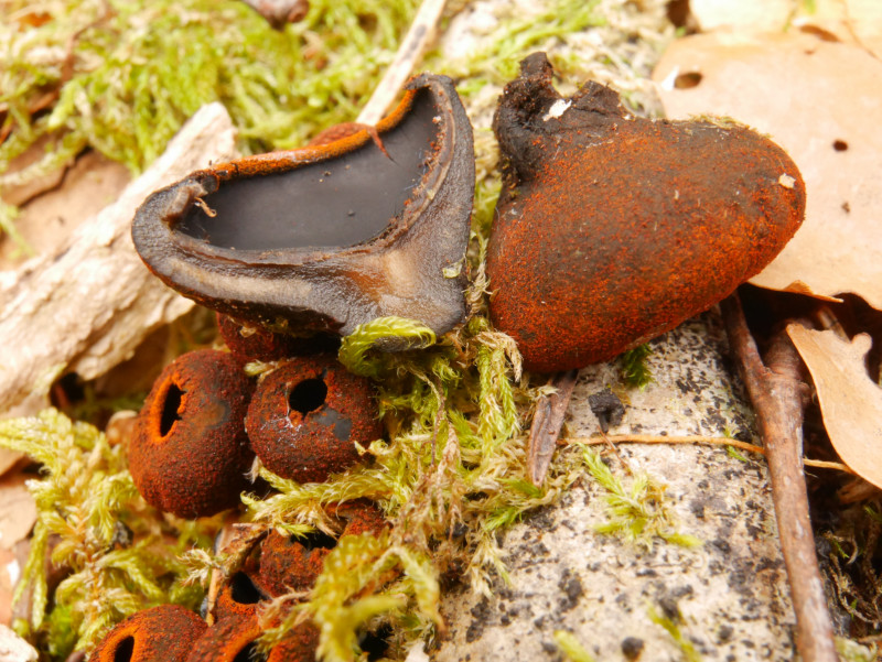 bereits Mitte April fand ich den unten gezeigten Becherling. Ich kann kaum Angaben zum Fund machen, außer, dass die Fruchtkörper auf einem Stöckchen, vermutlich Buche, wuchsen und der größte den Durchmesser eines 1-Cent-Stückes nicht ganz erreichte.
