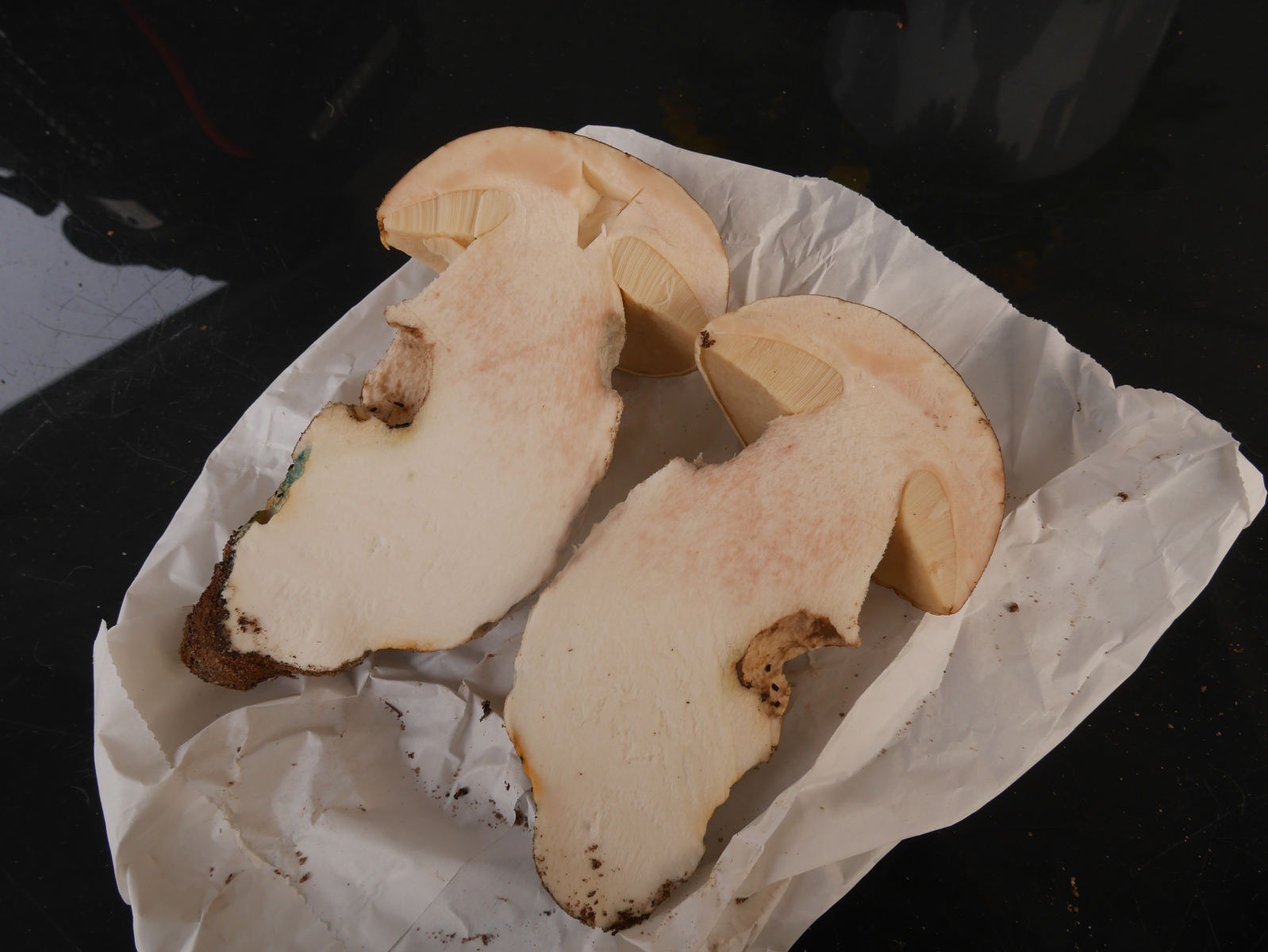 Zu L. cyaneobasileucum passt gar nicht (siehe hierzu auch das Portrait Leccinum cyaneobasileucum von Pablo), dass der Pilz im Längsschnitt im Hut und der oberen Stielhälfte zunächst lansam rosa anläuft, um dann nach ein bis zwei Stunden graubläulich zu werden.