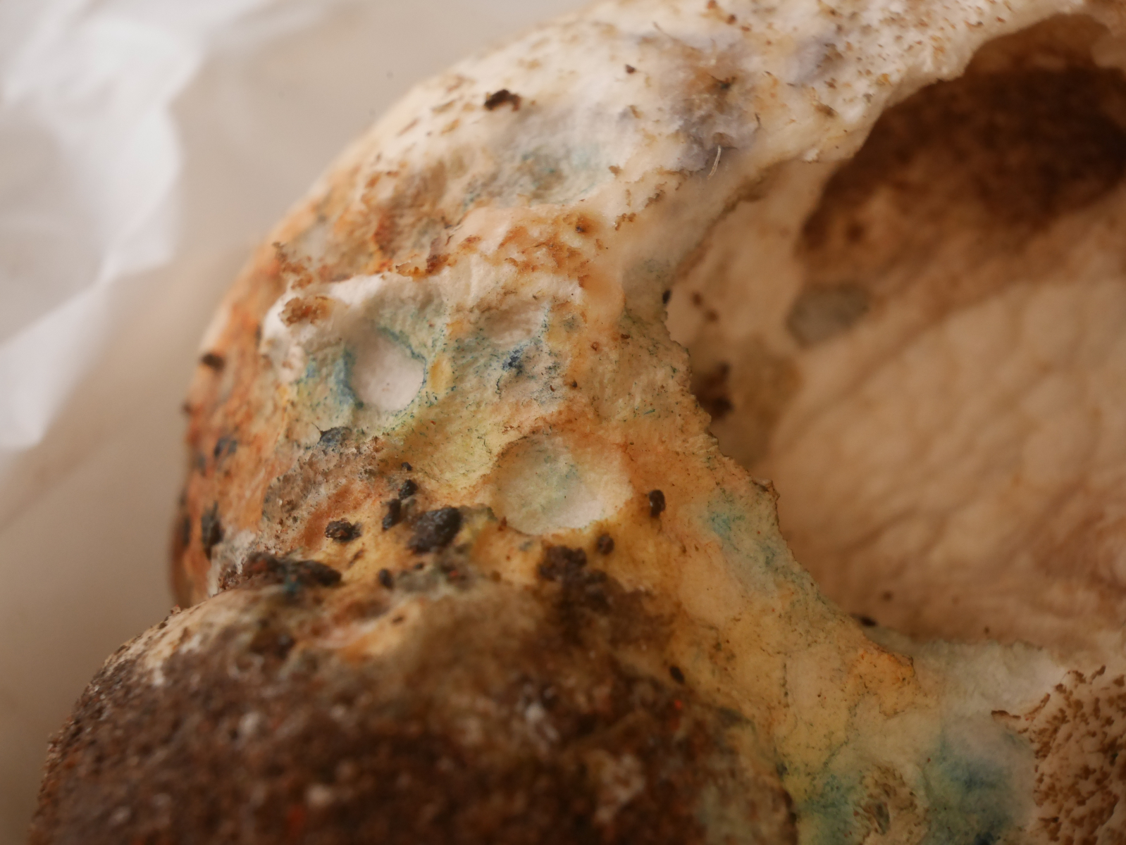 Da ich mal gehört hatte, dass Suillellus luridus oberhalb der Röhren eine rote Schicht aufweist, welche bei Neoboletus luridiformis nicht vorhanden ist, habe ich noch ein Schnittfoto angefertigt. Hier muss man mit dem Fotografieren schnell sein, sonst ist ohnehin alles blau. Die rote Linie blieb mir verborgen.