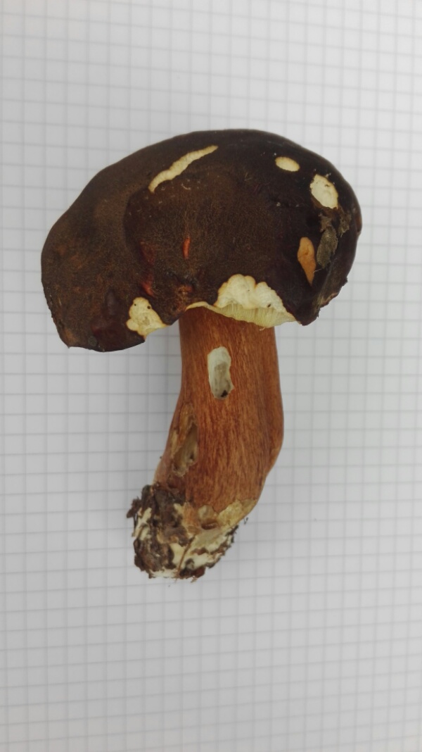 Hut: Farbe schwarzbraun, Oberfläche samtig, an verletzten Stellen cremeweiß, leicht rötend.