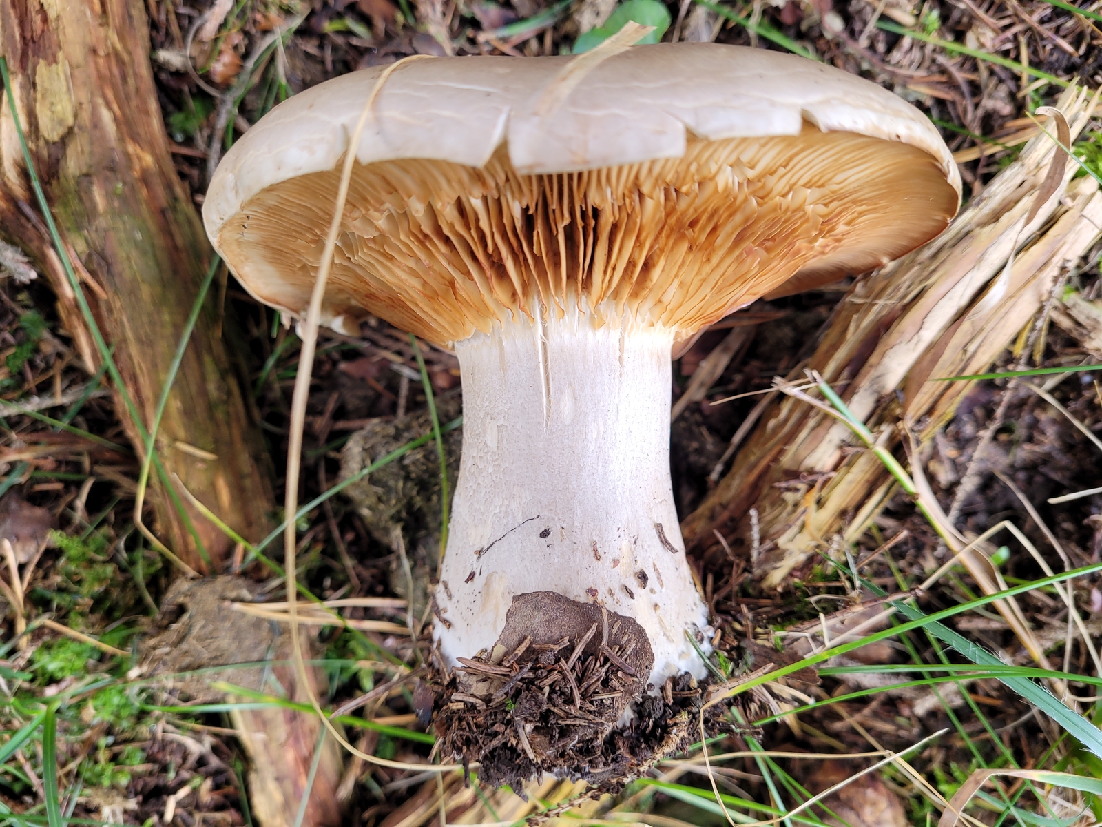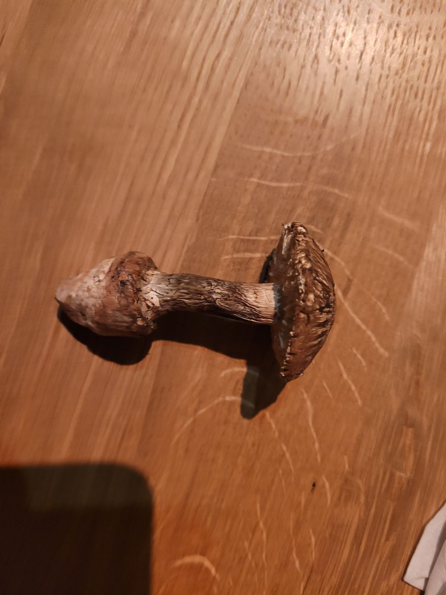 Pilze der Gattung Squamanita (Schuppenwulstlinge) sind extrem(!) selten und sollten komplett geschützt werden. Da der Finder den Pilz aber eh bereits entnommen hatte und der Pilz nicht wie einer aussah, den ich kannte (im Vergleich zu Squamanita schreieri - dem gelben Schuppenwulstling - sind optisch klare Unterschiede festzustellen), hatte ich versucht, den Finder dazu zu bringen, dass der Pilz wissenschaftlich untersuchen lässt. Insbesondere wurden kürzlich drei weitere Squamanita Arten publiziert (S. orientalis, S. mira, S. sororcula) und ich hatte den Eindruck, dass es sich um eine dieser Arten handeln müsste oder um Squamanita umbonata, welche auch aus Japan oder Nordamerika bekannt ist. "Umbonate" bedeutet auf englisch ja gebuckelt, und der vorliegende Pilz hat einen recht deutlichen Buckel auf seinem Hut. Somit liegt meine Vermutung hier klar bei Squamanita umbonata.