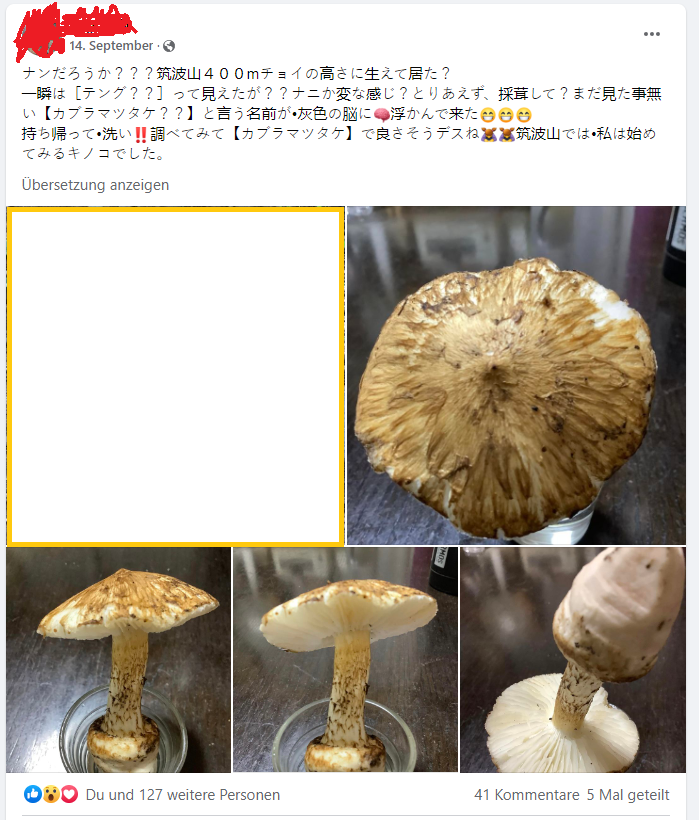 Ich bin vor einigen Wochen in einer japanischen Facebook-Gruppe auf einen Pilz gestossen, welcher mein Interesse geweckt hatte. Ich war mir sicher, dass es sich um eine Squamanita-Art handeln muss und hatte versucht, den Finder auf die Seltenheit seines Fundes aufmerksam zu machen und ihn zu bitten, den Pilz einer wissenschaftlichen Untersuchung zukommen zu lassen, da er ihn ja schon gepflückt hatte. Leider sprach er kein englisch (und ich kein japanisch), was die Kontaktaufnahme erst verhindert hatte. Glücklicherweise hatte sich dann aber ein Student der Universität Tokyo als Vermittler zur Verfügung gestellt und veranlasst, dass der Finder ihm den Pilz zukommen liess.