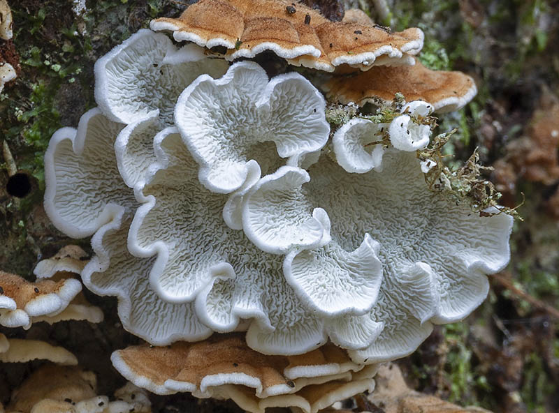 diesen Pilz habe ich Mitte Dezember in Deutschland, Schleswig-Holstein, am Stamm und den Ästen einer umgestürzten, seit Jahren abgestorbenen Rotbuche fotografiert. Die Rotbuche stand einstmals separat in einem immer noch vorhandenen Fichtenhochwald. Die Fruchtkörper waren maximal 3,5cm breit und höchstens 3cm tief. Anfänglich hatte ich den Zaunblättling unter Verdacht, dieser ist es wohl eher nicht.