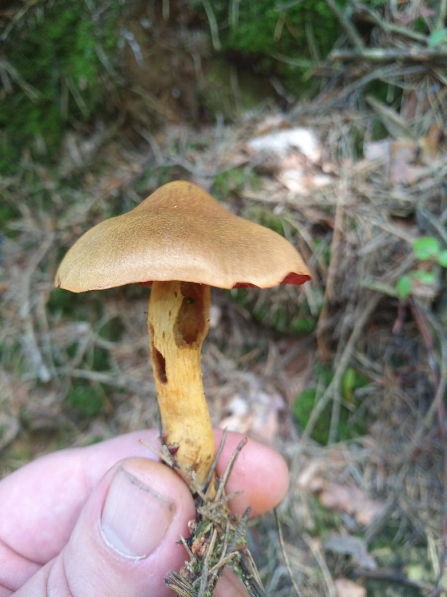 Neben den Perlpilzen und den Rotfußröhrlingen habe ich drei kleine Flaschenstäublinge entdeckt, bei denen ich mir aber hinreichend sicher bin. Ausserdem ist mir dieser kleine Schwammerl aufgefallen, der mich von der äußeren Form her entfernt an einen Pfifferling erinnert. Dass es kein Pfifferling ist, weiß ich. Mich würde interessieren, was es ist. Ich habe ihn mitgenommen, um ihn zu bestimmen, aber es gelingt mir nicht. Wollt ihr mir helfen?