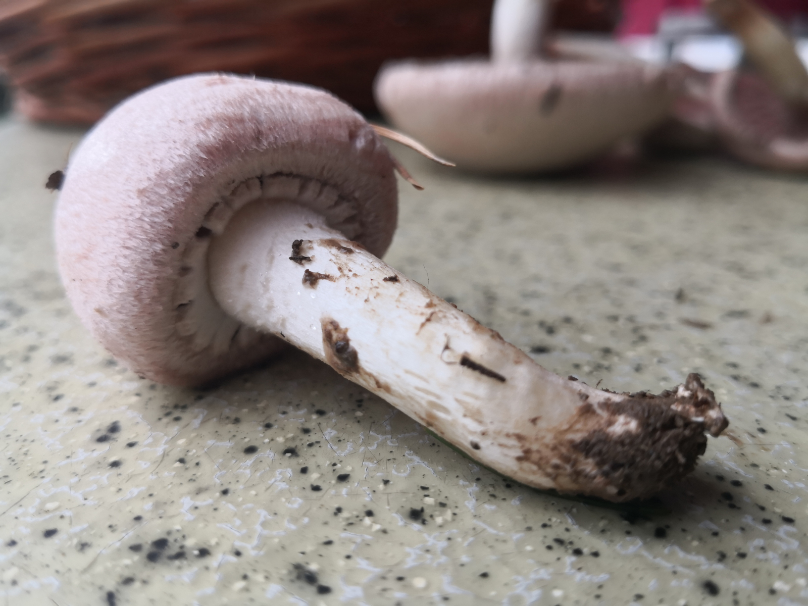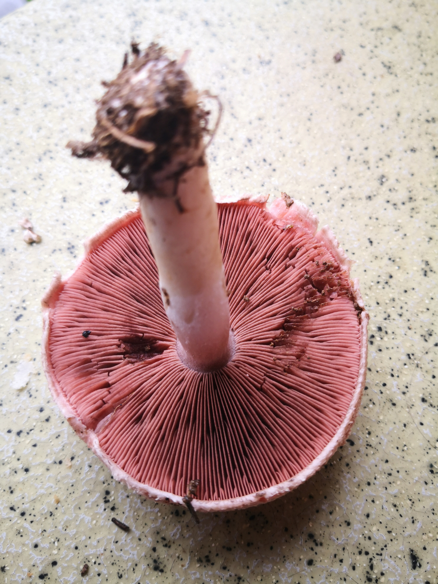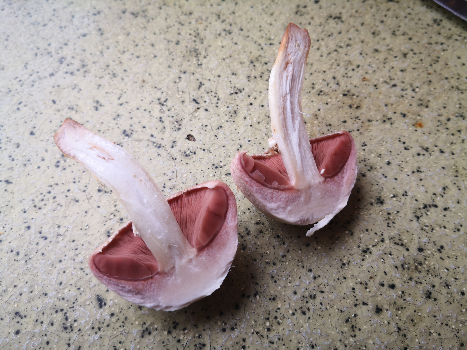 Das, was ich mit Glanz falsch beschrieben habe, heißt in meiner Literatur "Fleischrosa fleckig" - sehe ich hier bei allem, bei dem großen Rechts [edit: auf dem Foto links] am wenigsten, der wird der älteste sein. Aber auch bei dem ist der Stiel so rosa - cremefarben, wie er sein soll.