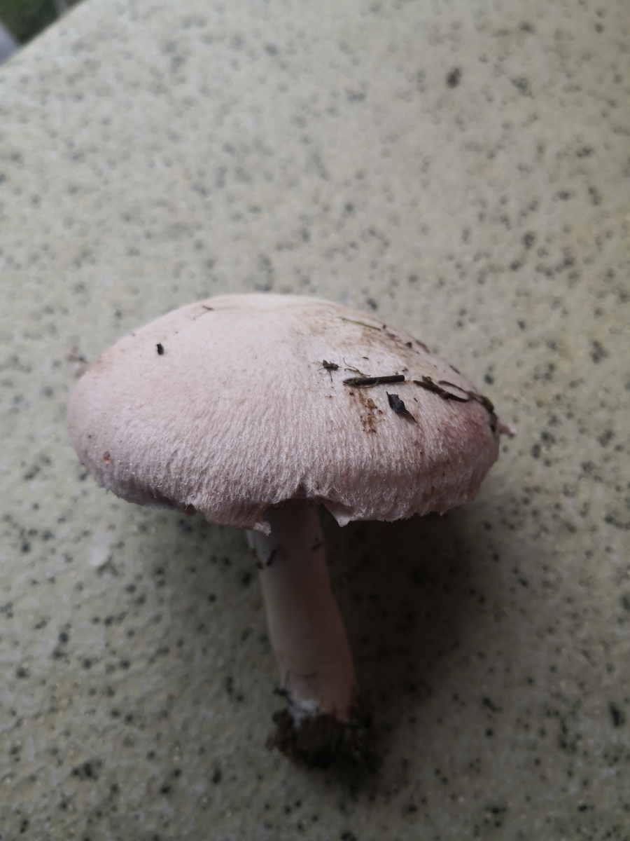 Ich habe heute zwischen meiner Blaufichte und meinem Rhododendron diesen schönen mir fremden Pilz gefunden. Aus der Ferne dachte ich an einen Parasolpilz, bei nahen zunächst an einen Safranschirmling - aber schon die violett-braunen Lamellen haben mich zweifeln lassen. Der Pilz verfärbt sich überhaupt nicht, wenn man am Stiel kratzt und auch auf Druck tut sich nirgends viel.