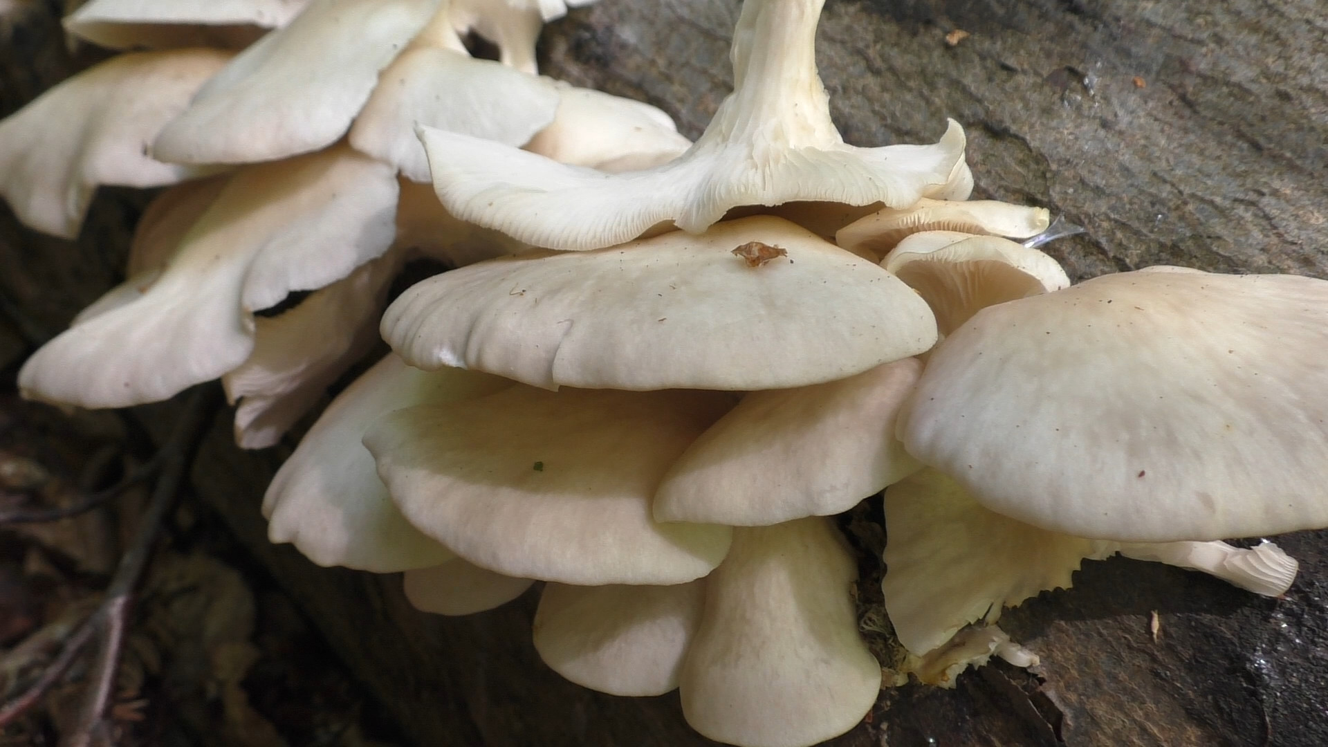 Das sieht nach Austernseitlingen aus. De Farbe des Hutes ist beim Austernpilz sehr veränderlich und kann von blassgrau, bräunlich, bläulich bis fast schwarz variieren.