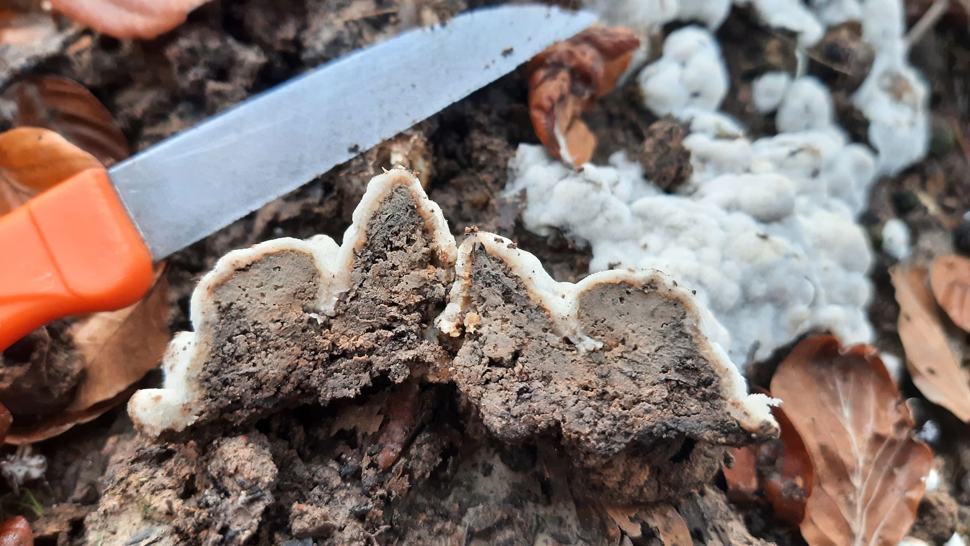 Fangen wir mal mit einer Cortinarie an. Diese Exemplare mit dem markant runzeligen Hut hätte ich in der Sektion Elatiores vermutet, Hut und Stiel sind aber trocken. Auffällig finde ich auch die deutlich überstehende Huthaut. Vor Ort war kein auffälliger Geruch festzustellen. Ob diese Merkmalskombination ausreicht, um die zu benamsen? Geschmacksprobe, Schnittbild und KOH könnte ich nachliefern, wenn das mit einem Erkenntnisgewinn verbunden ist: