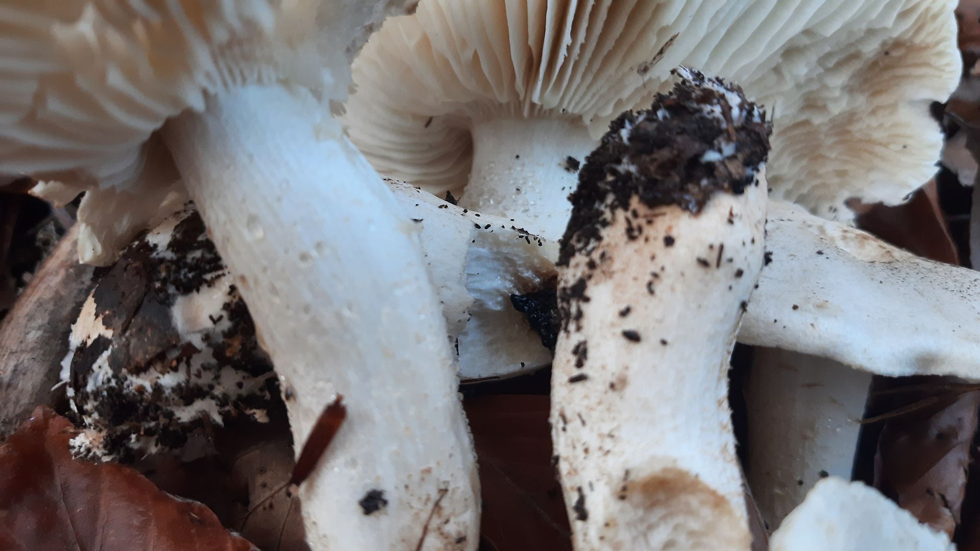 Tricholoma sejunctum versus Amanita phalloides. Von oben betrachtet, haben die schon eine gewisse Ähnlichkeit - von unten natürlich nicht: