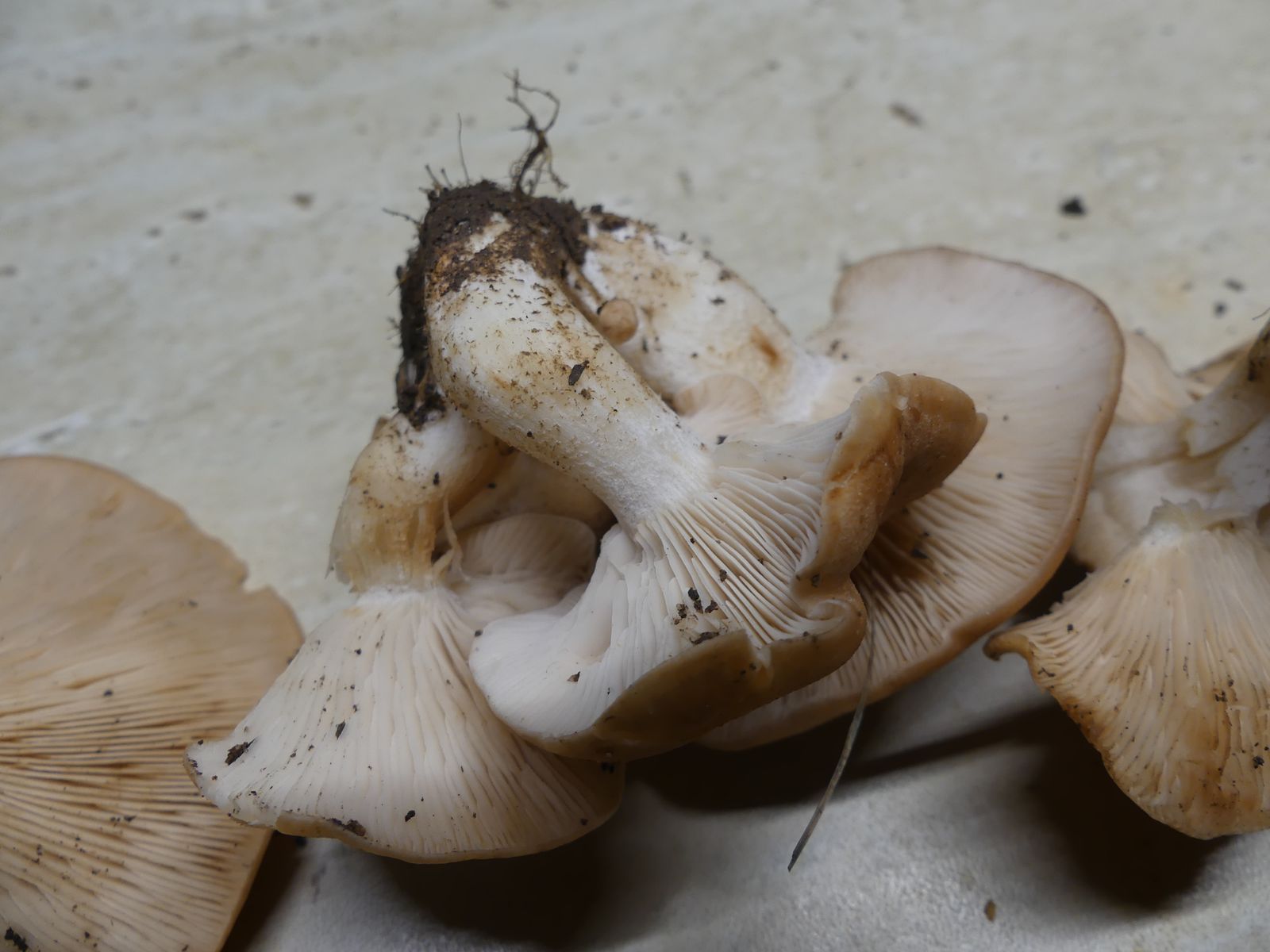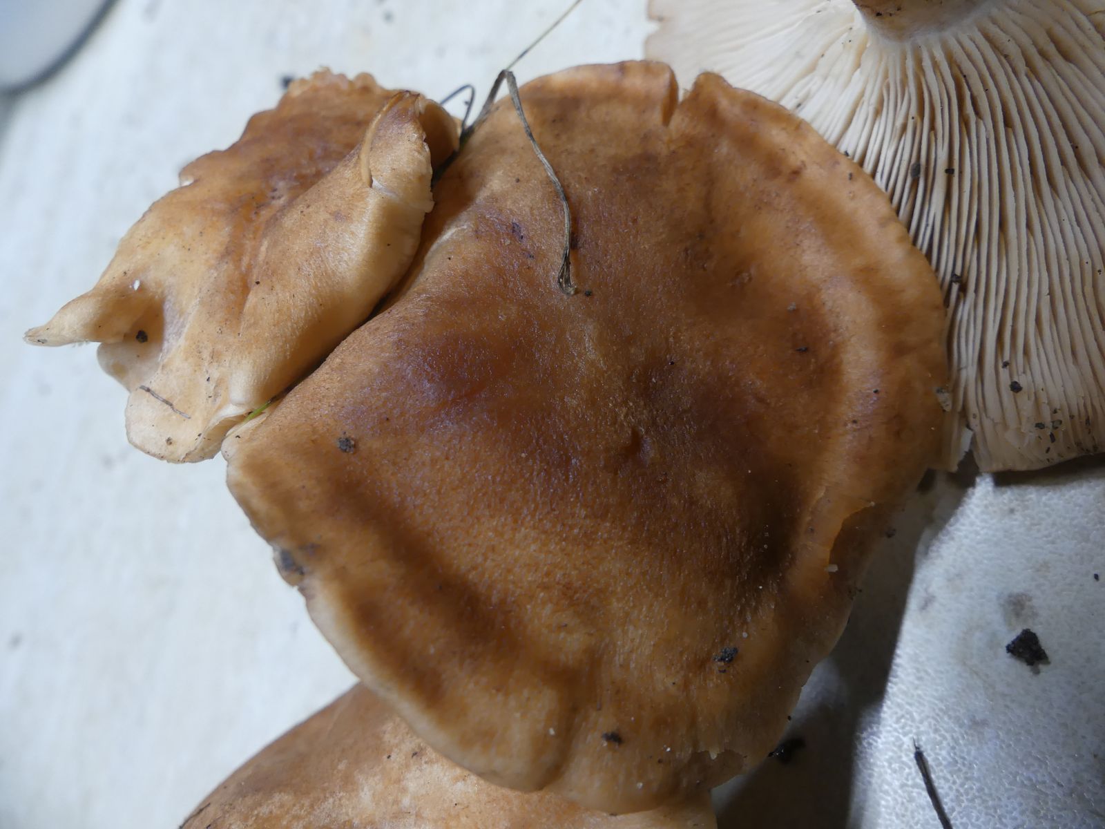 Ich halte das für "Große Kremplinge" s.l., mehr geht wohl nicht ohne Mikroskop und / oder ITS. Hutdurchmesser bis ca. 25 cm, ein schöner Hexenring mit etwa einem Dutzend Fruchtkörper ca. 15 - 20 Meter von einer großen (Rot?)Eiche entfernt, wenn ich das Falllaub richtig interpretiert habe.