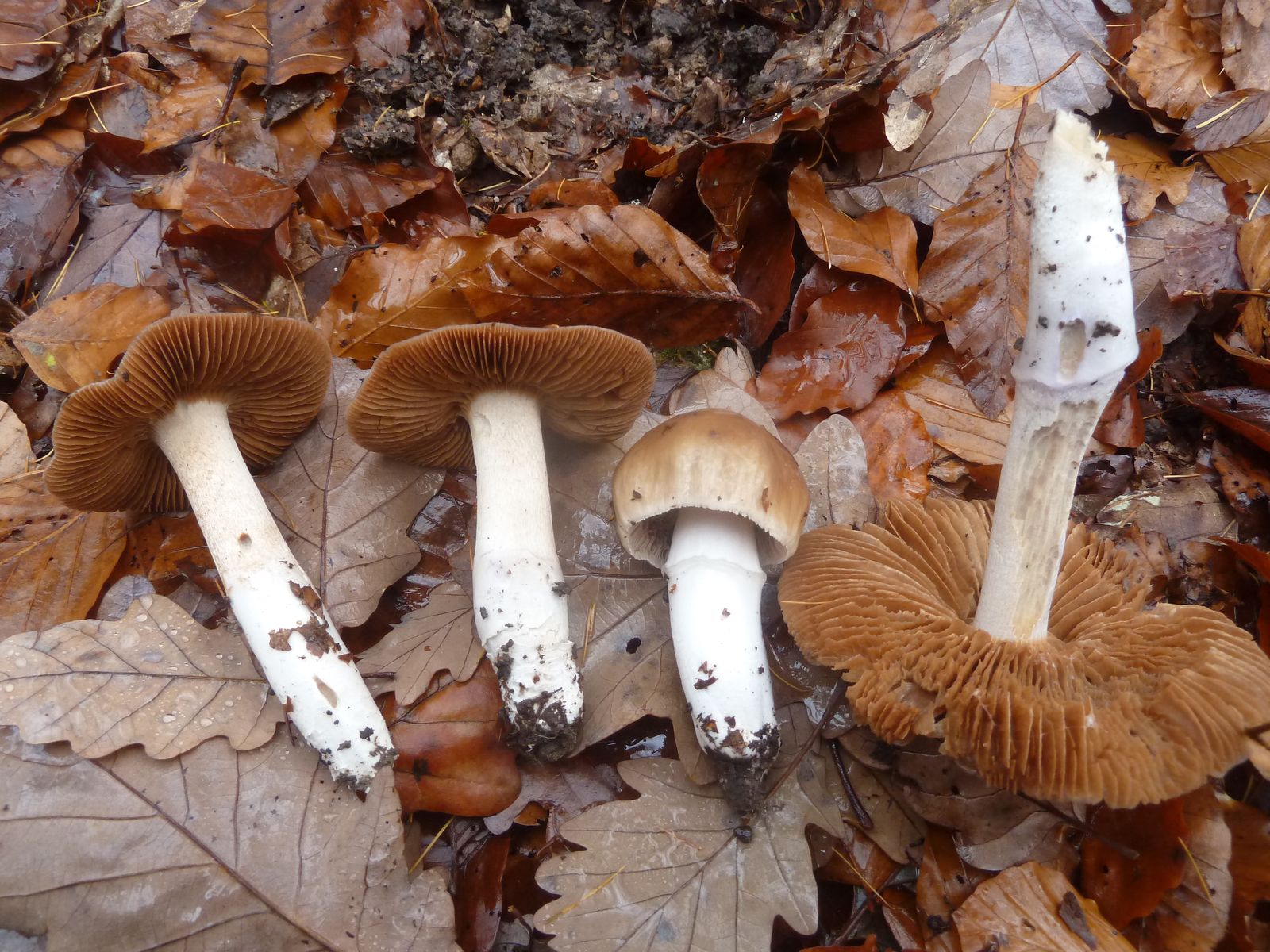 Heute habe ich diese Kollektion im Eichen-Buchen-Kiefern-Mischwald gefunden. Der radialfaserige Hut, die Velumflocken auf dem Hut, das in der oberen Hälfte blaue Stielfleisch und das gelbe Stielfleisch in der Basis zusammen mit der ockerbraunen Stieloberfläche auf älteren Exemplaren führen mich zu Luhmanns Klumpfuß.
