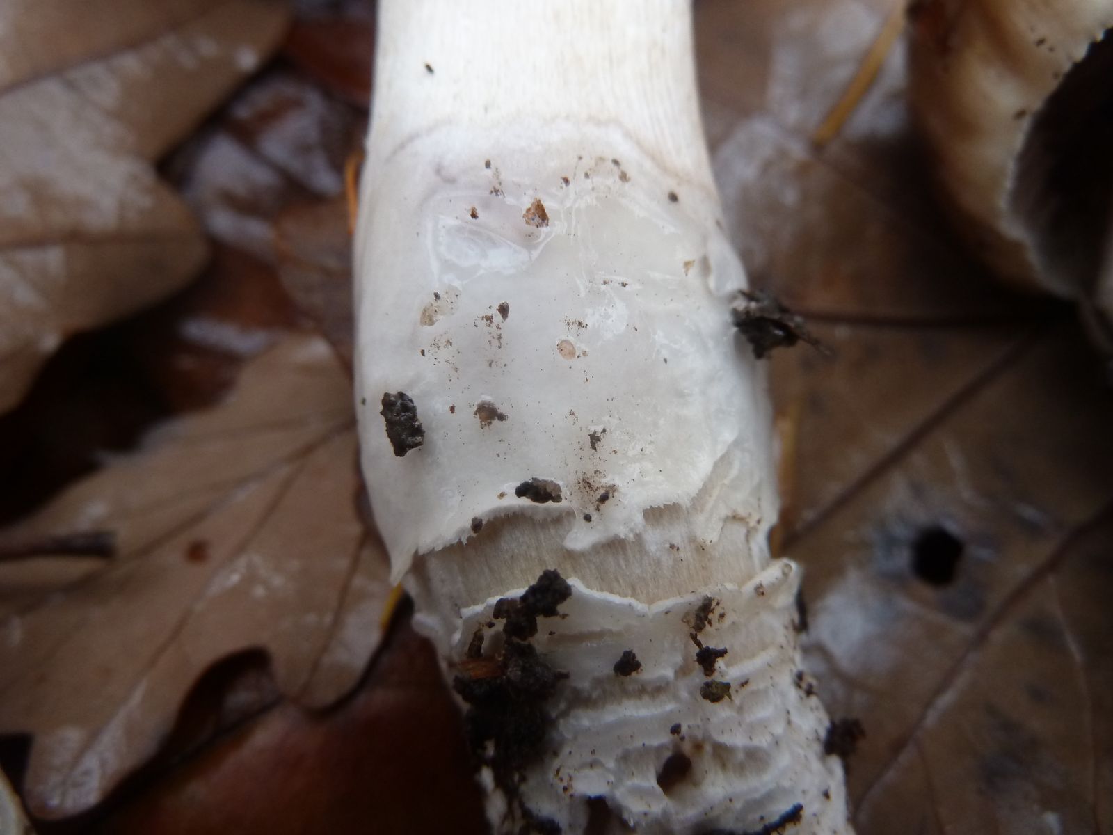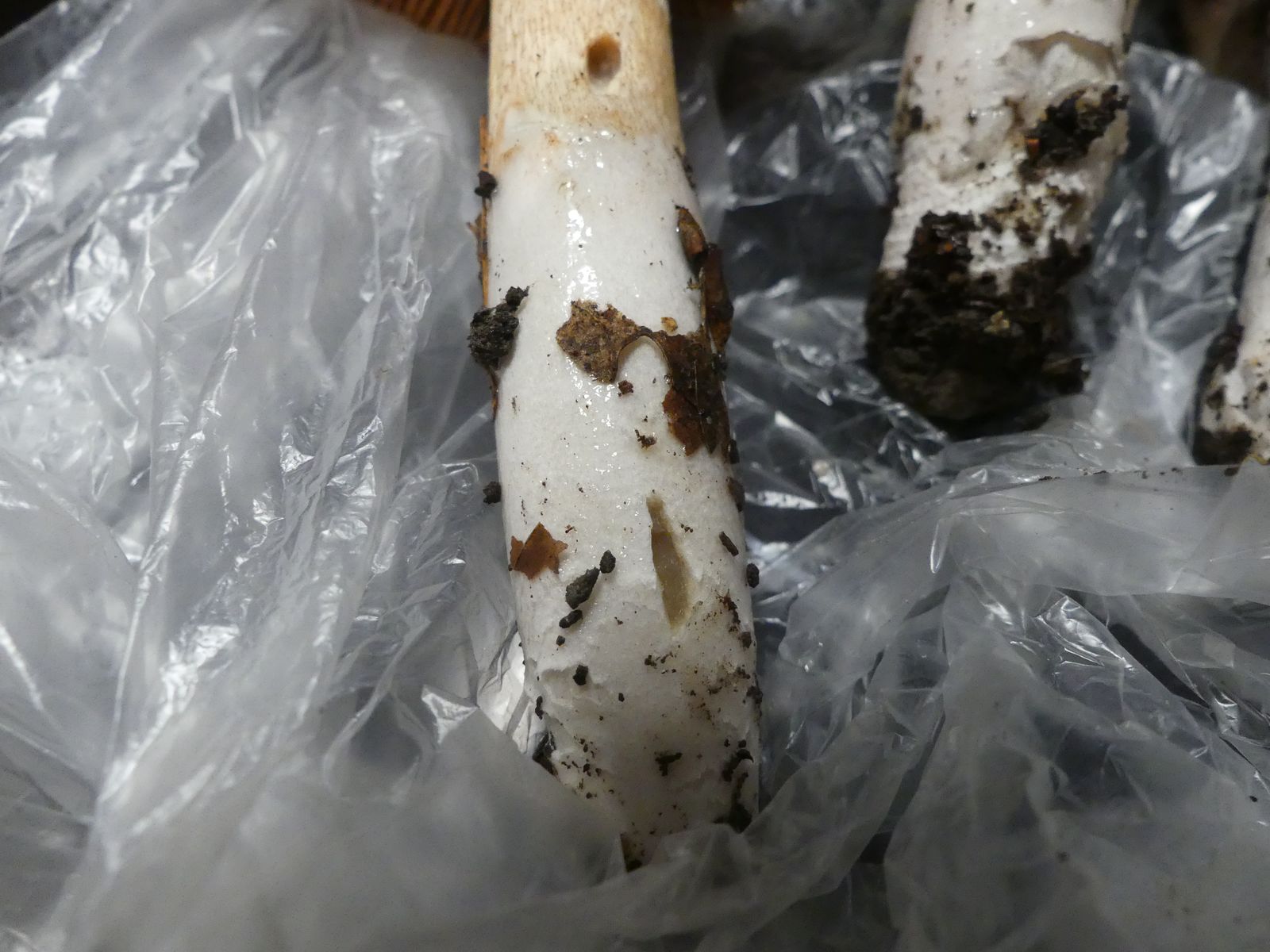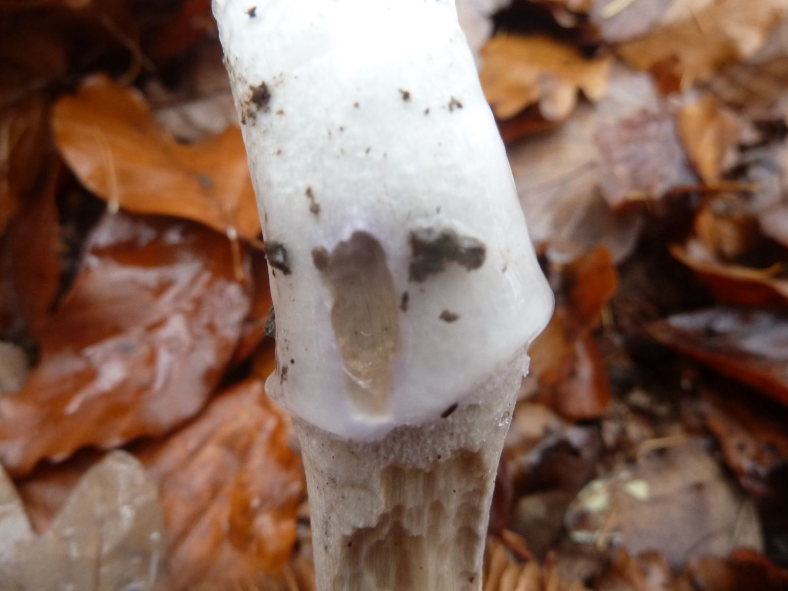 Huthaut mit einiger Verzögerung schwach bitter, kaum wahrnehmbar. Geruch in der Stielbasis ebenfalls kaum wahrnehmbar. Wenn ich die Stielknolle zwischen den Fingern zermatsche, ist ein Hauch von A. phalloides Geruch (wie junge Frkp., ohne Aas-Komponente) wahrnehmbar. Ganz schwach wahrnehmbar, witterungsbedingt?