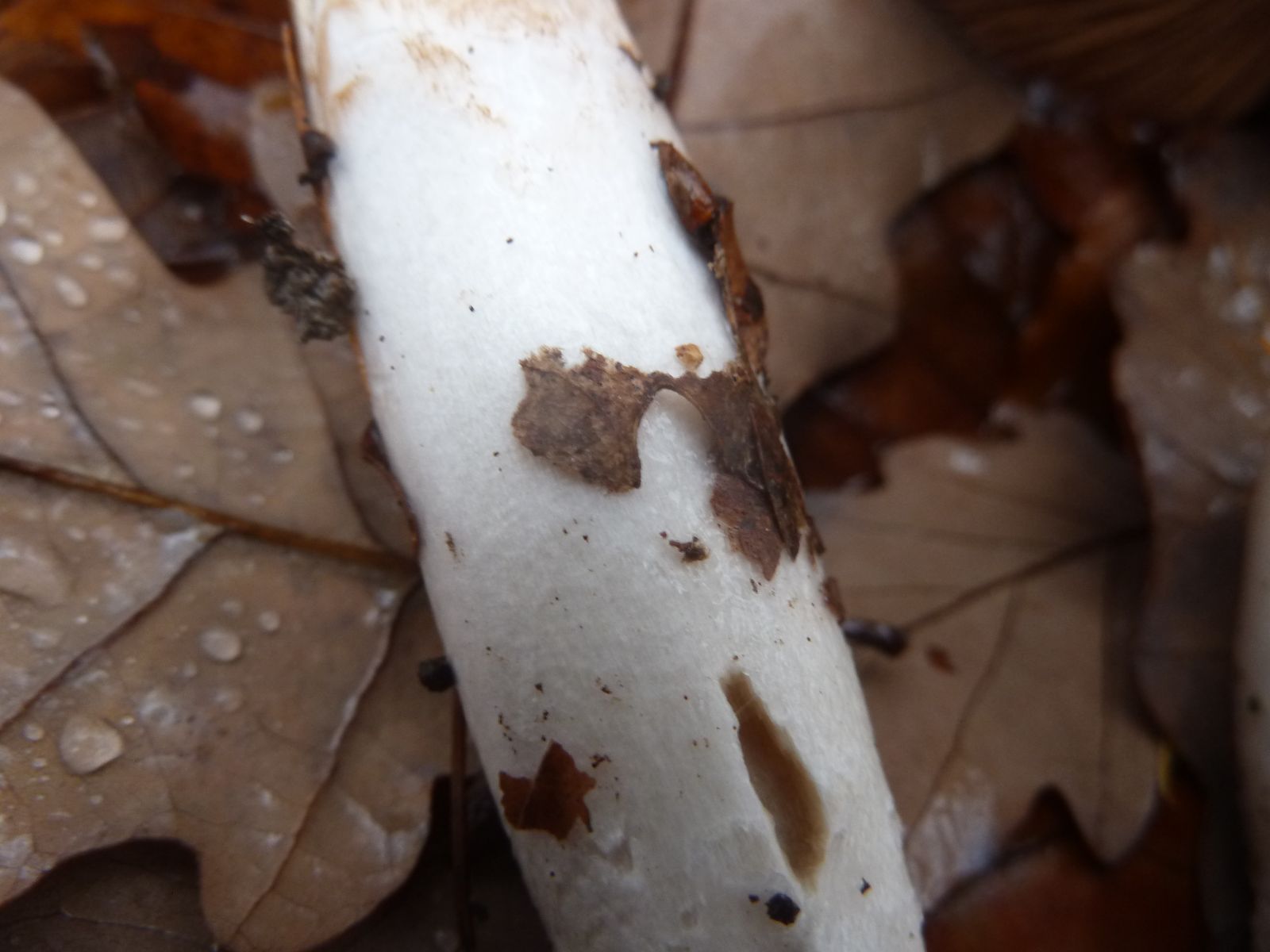 Wegen Habitus und Farbe dachte ich zunächst an den Leoparden-Klumpfuß, den ich keine 100 Meter entfernt vor ein paar Jahren gefunden hatte. Es ist aber kein Leoparden-Klumpfuß, denn die rote KOH-Reaktion fehlt und Fleisch/Hut müssten deutlich intensiver gefärbt sein.
