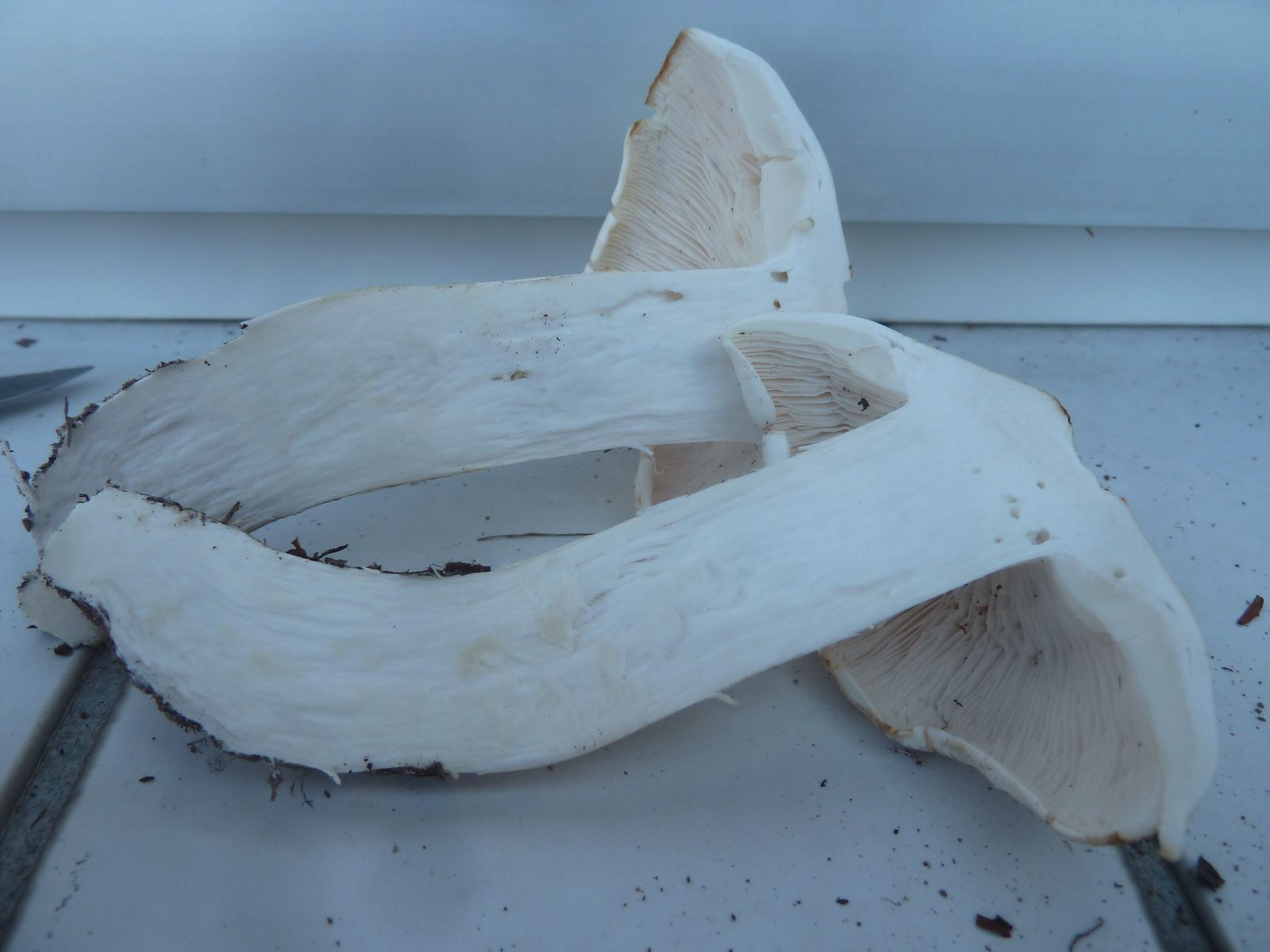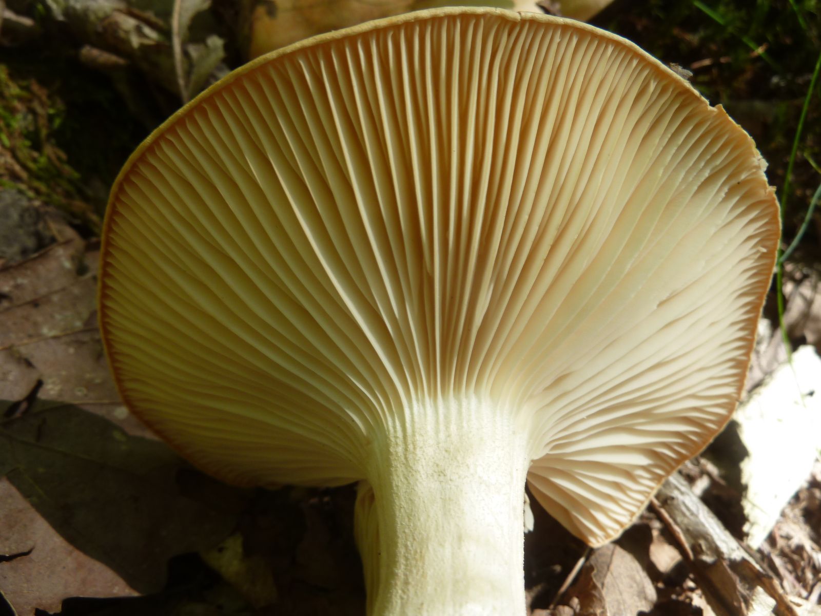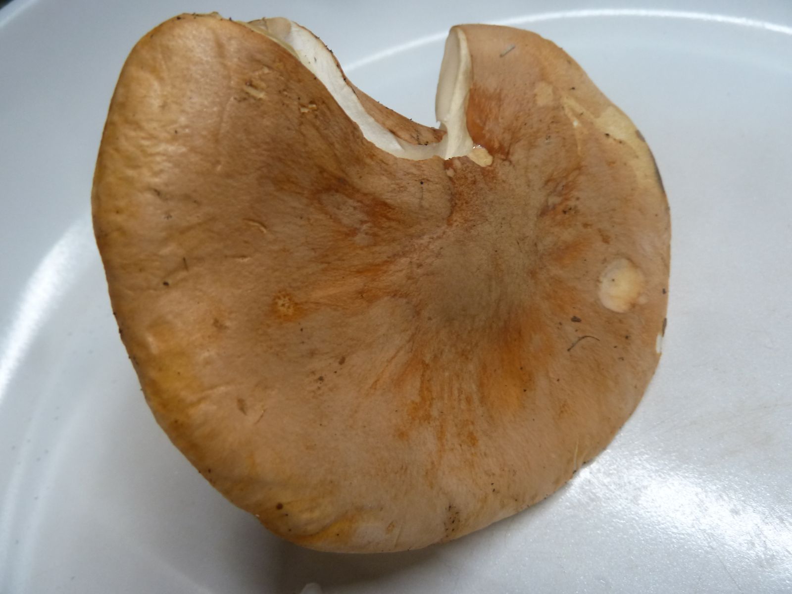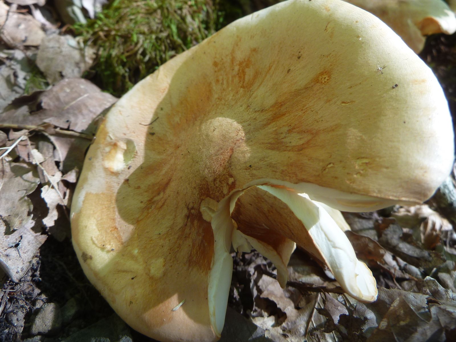 Kopfzerbrechen bereitet mir der Riesenrötlings-Doppelgänger. Zuerst dachte ich an einen Riesen-Rötling, den ich im gleichen Habitat (Eichen-Buchen-Mischwald) vor ein paar Wochen in Stückzahlen gefunden hatte. Dieses Exemplar ist aber kein Riesen-Rötling, denn es fehlen die gelben Lamellen und der Geruch ist komplett anders, richtig muffig, nicht mehlartig-süßlich. Auch das deutliche Gilben ist auffällig, welches sich über Nacht bei der Lagerung im Freien auf meiner Terrasse gebildet hat.