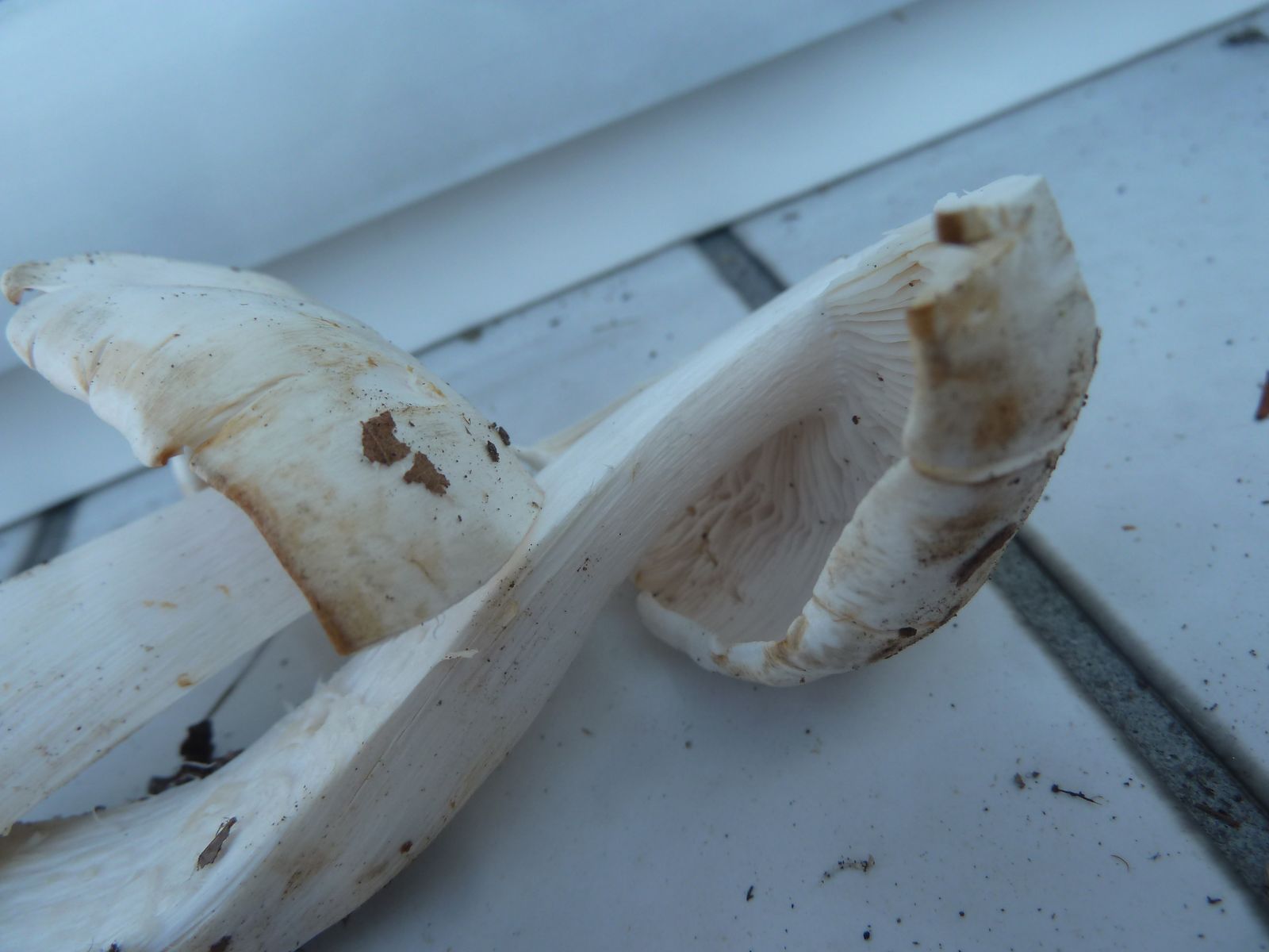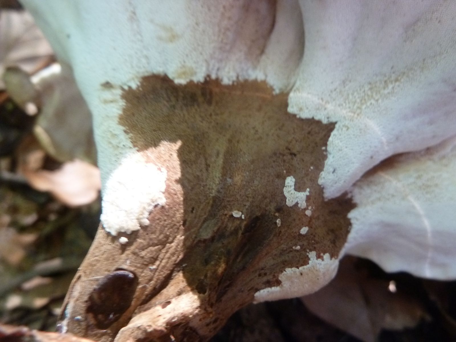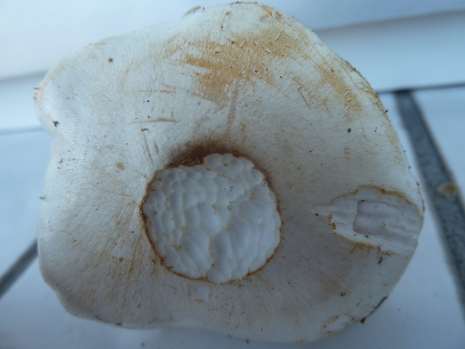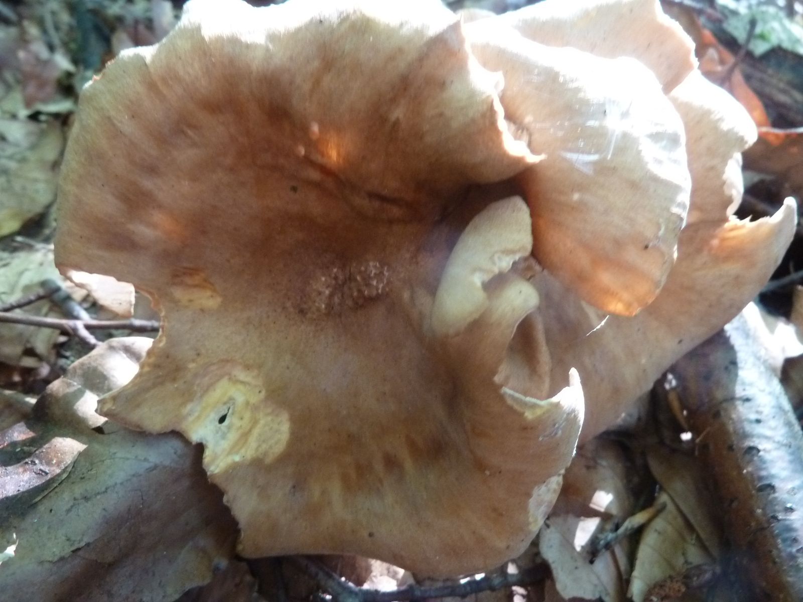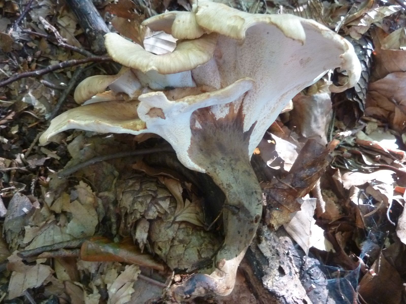 Kopfzerbrechen bereitet mir der Riesenrötlings-Doppelgänger. Zuerst dachte ich an einen Riesen-Rötling, den ich im gleichen Habitat (Eichen-Buchen-Mischwald) vor ein paar Wochen in Stückzahlen gefunden hatte. Dieses Exemplar ist aber kein Riesen-Rötling, denn es fehlen die gelben Lamellen und der Geruch ist komplett anders, richtig muffig, nicht mehlartig-süßlich. Auch das deutliche Gilben ist auffällig, welches sich über Nacht bei der Lagerung im Freien auf meiner Terrasse gebildet hat.