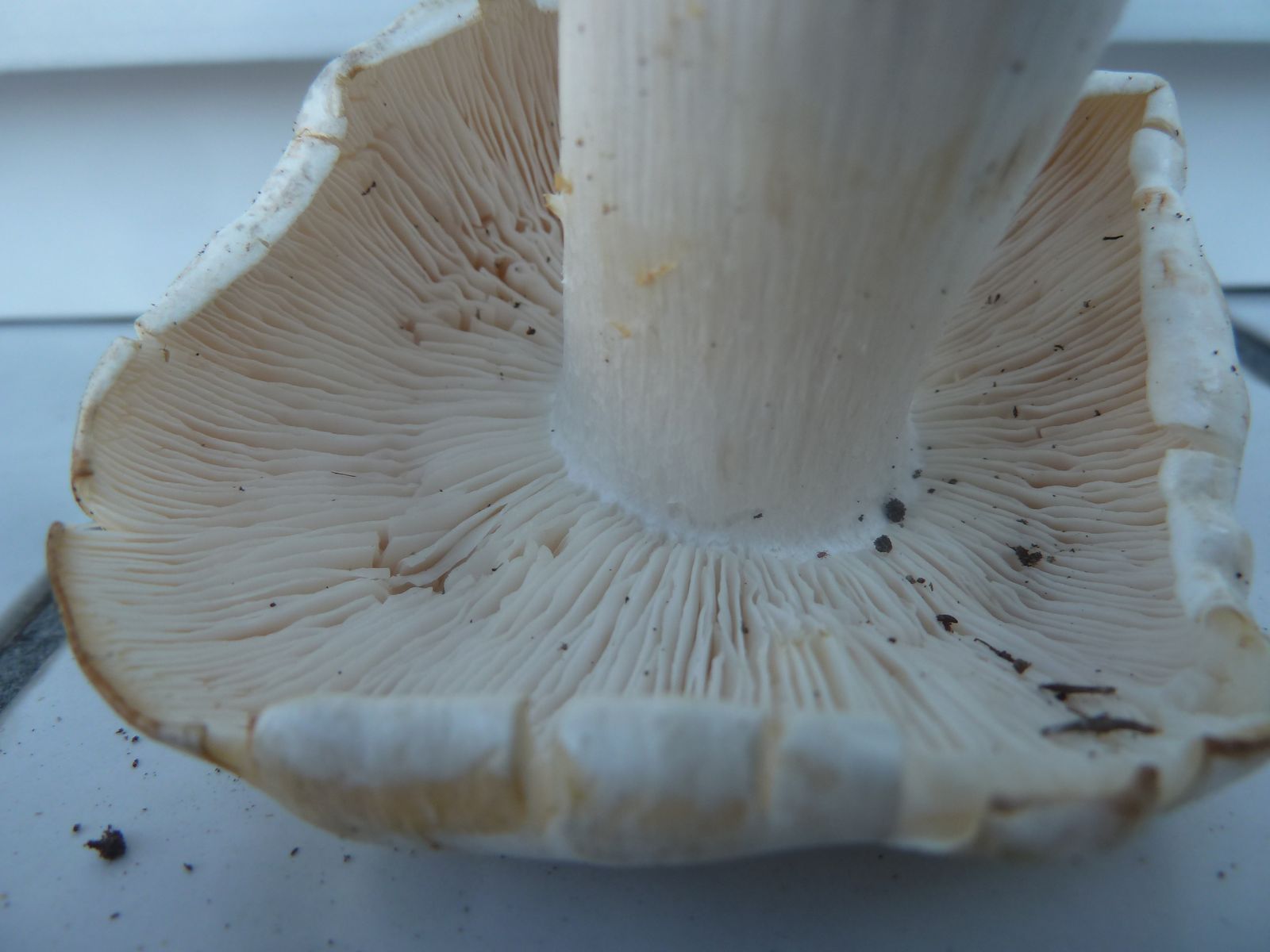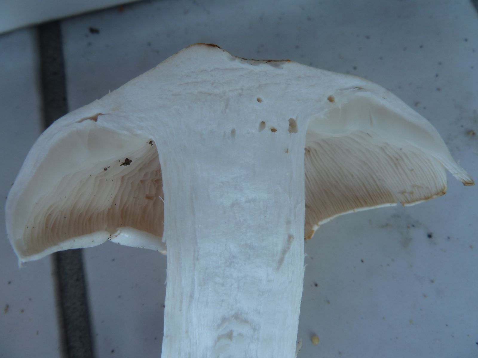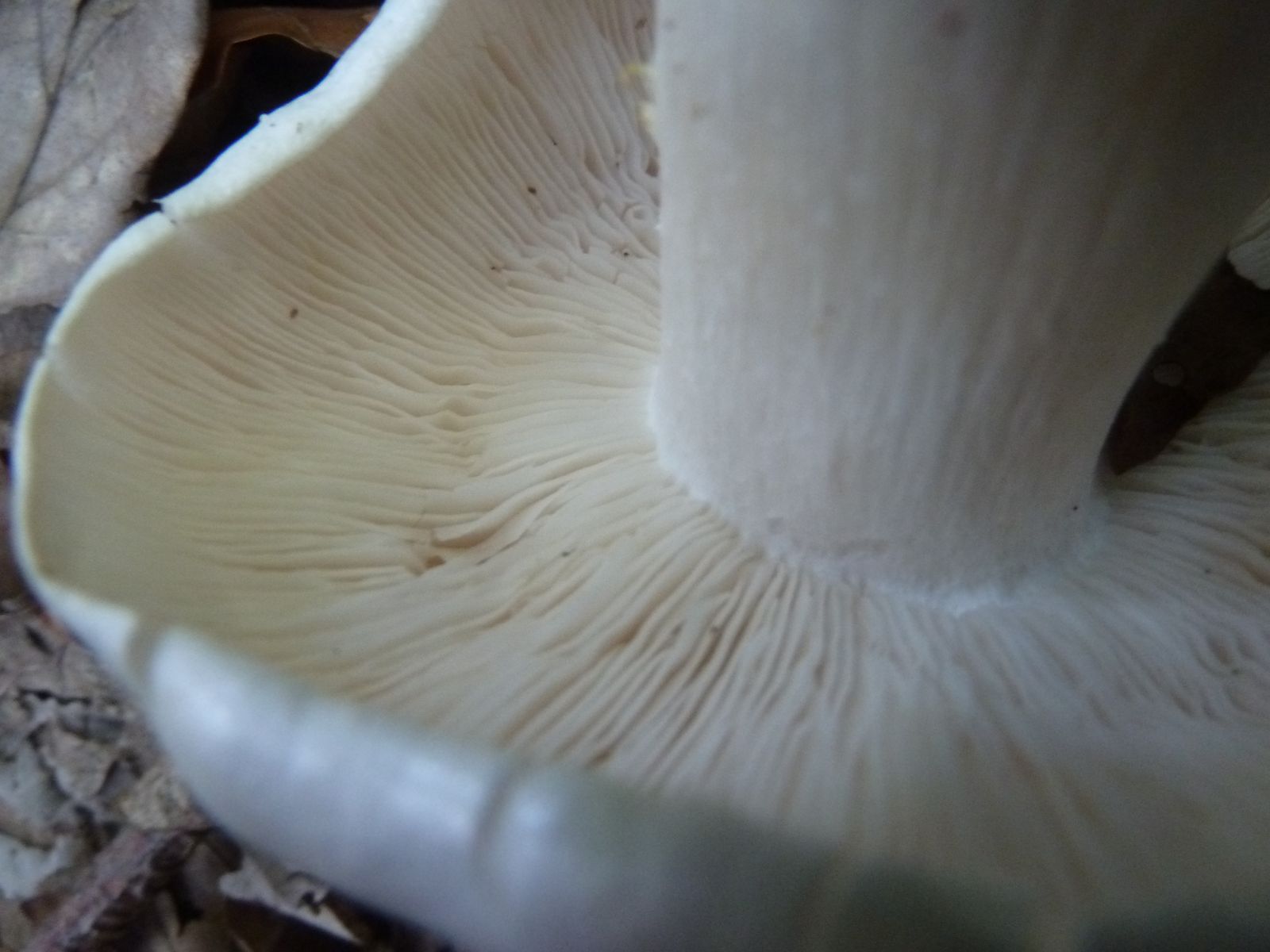Hier ein "richtiger" weißer Knollenblätterpilz Amanita phalloides var. alba, den ich vergangene Woche in einem Eichen-Hainbuchen-Mischwald gefunden habe. Beachte bitte die häutige Knolle an der Stielbasis, das ist das wichtigste Unterscheidungsmerkmal zu deinem Fund.