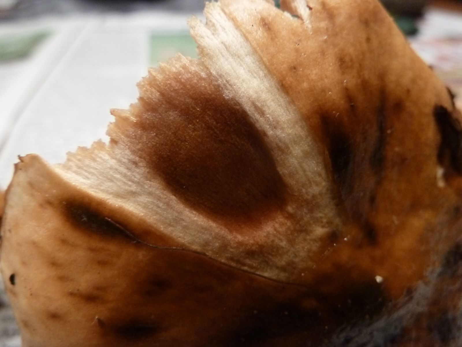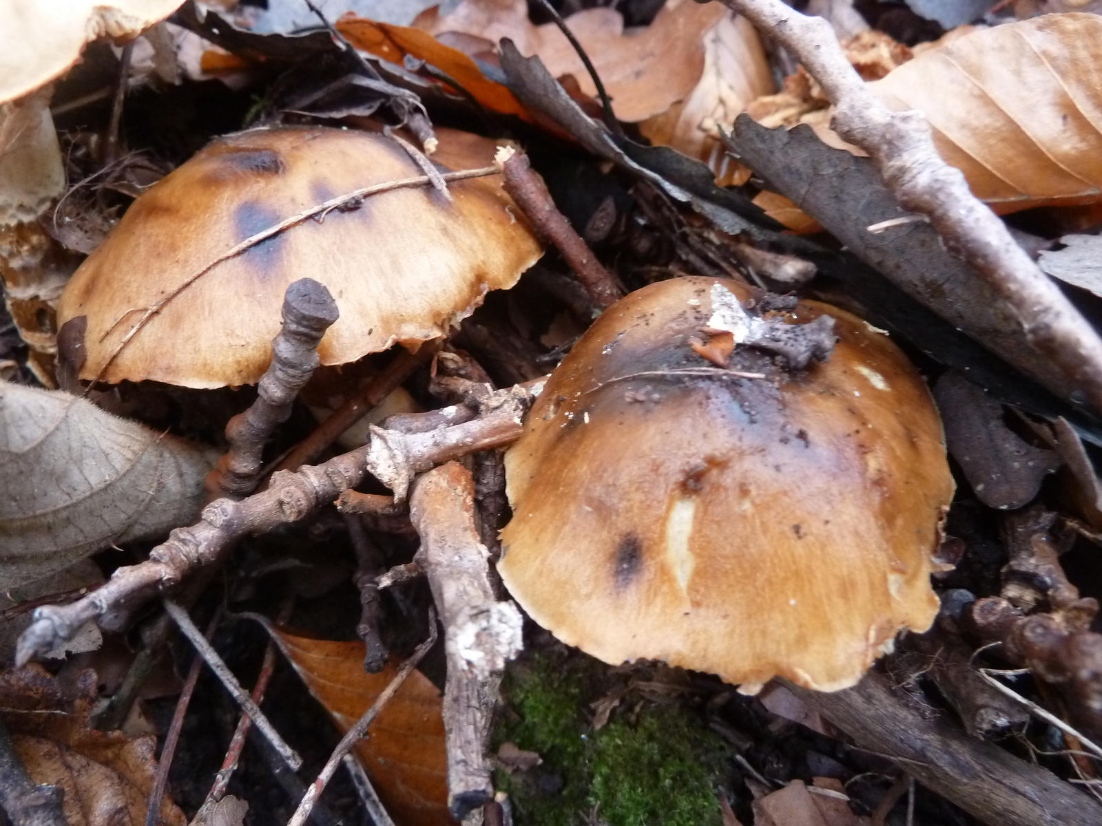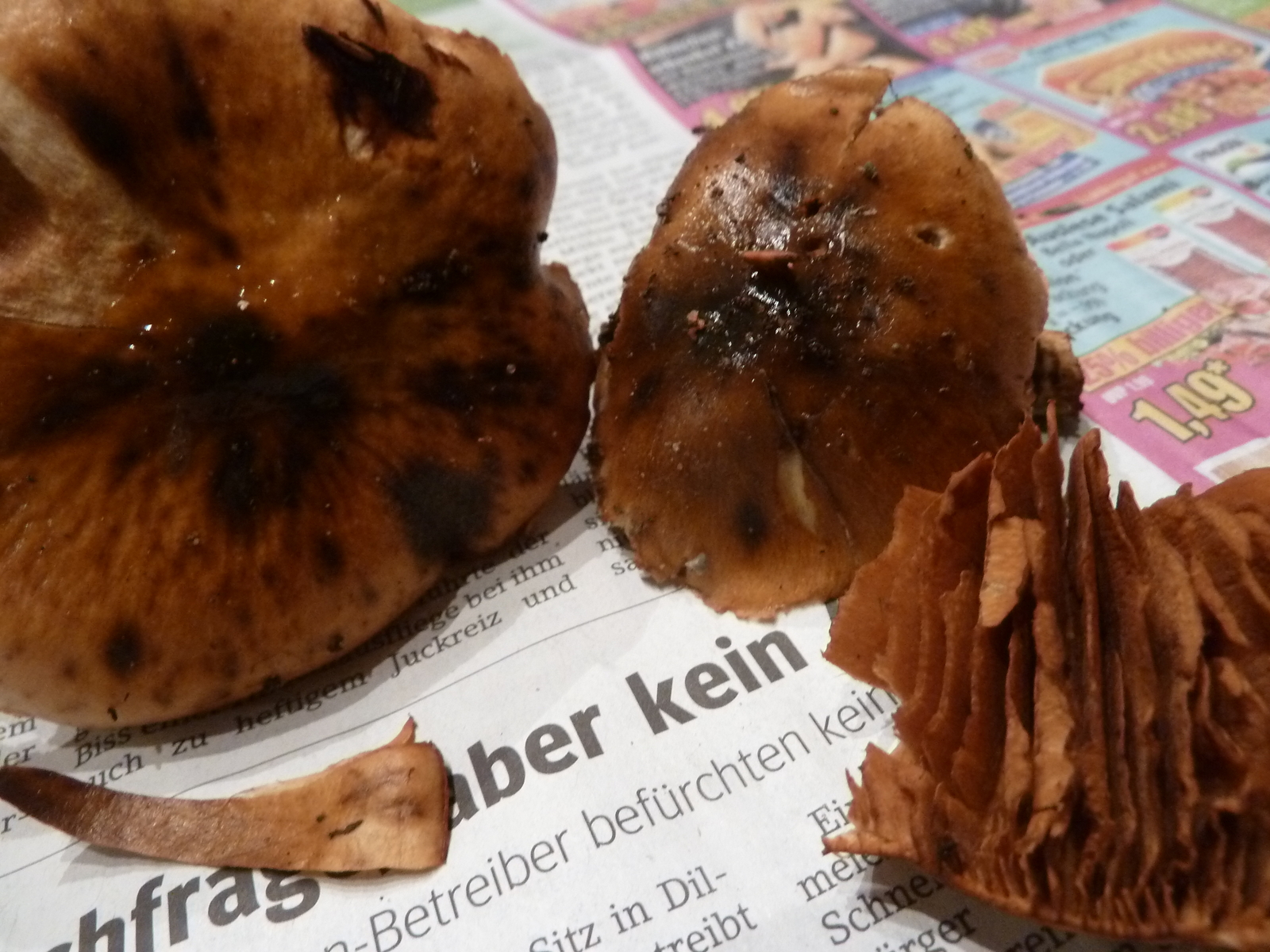 Am Waldrand zwischen Espen, Eichen und Buchen habe ich diese Telamonie (?) gefunden. Auffällig ist der dunkelfleckige Hut, auch schon junge Exemplare zeigen das, und die zimtbraunen bis orangebraunen Lamellen. Diese verfärben sich mit Natronlauge dunkelbraun, ebenso wie die Schleierreste am Stiel, das Hutfleisch und die Huthaut reagiert etwas schwächer.
