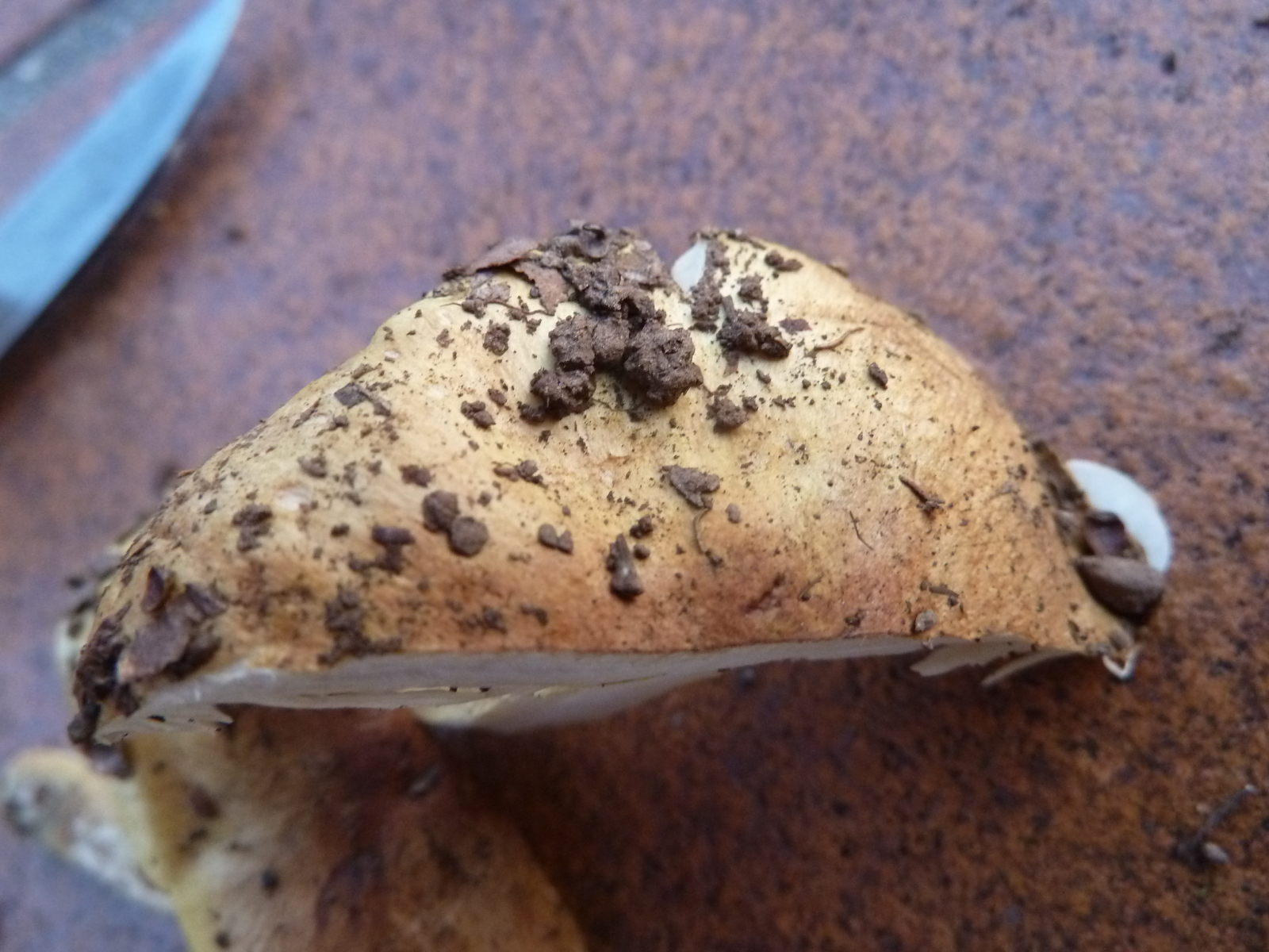 Zu guter letzt lehne ich mich ganz weit aus dem Fenster und gebe diesem Exemplar den Arbeitstitel Honig-Schleimfuß. Nicht nur der Hut, sondern auch die untere Stielhälfte ist ein Schleimbatzen. Beim Quetschen verströmt ein schwach süßlicher Geruch nach Honig, ähnlich wie ganz junge grüne Knollis, aber ohne die aasartige Komponente.