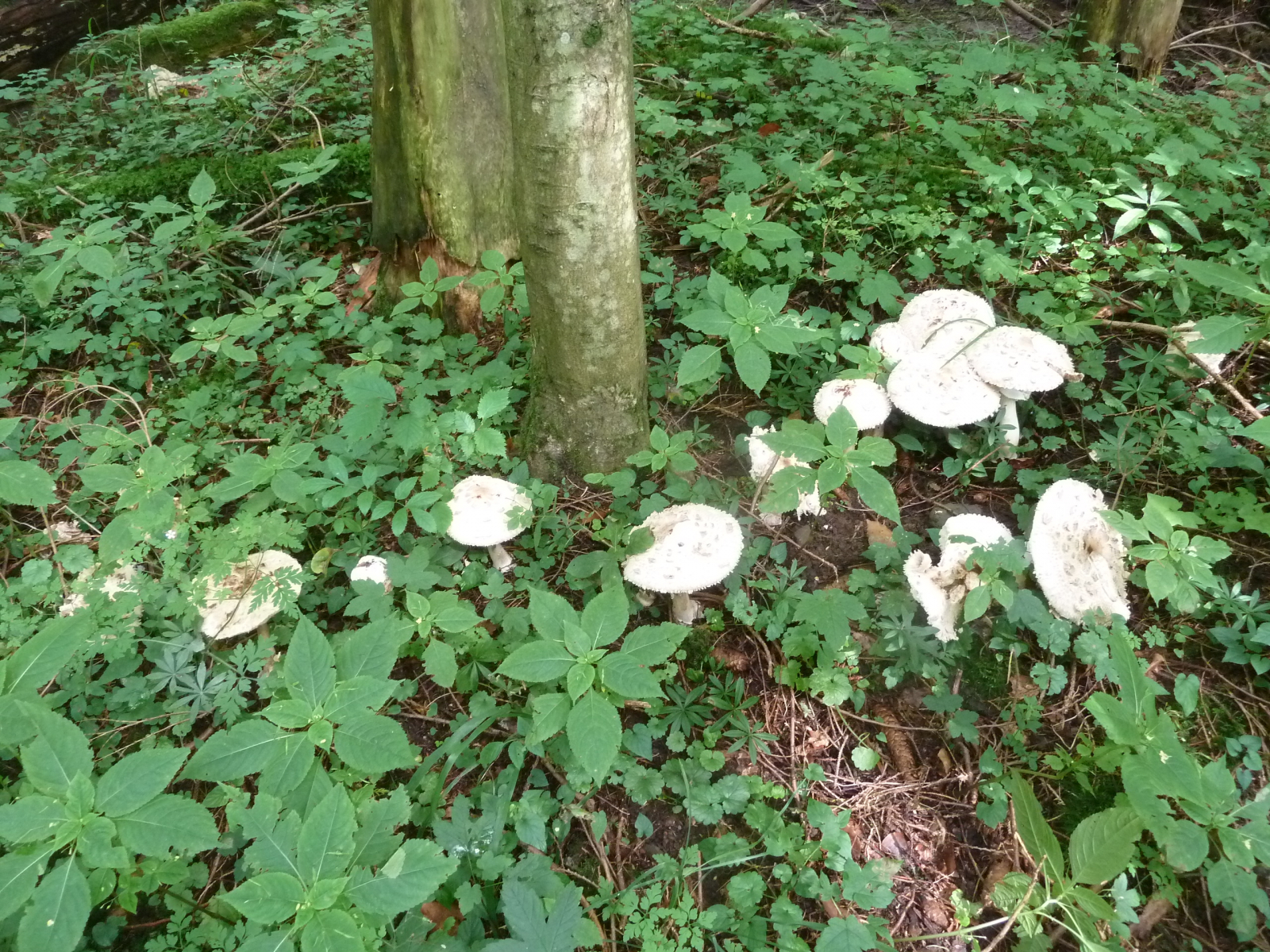 Diese Kollektion von Macrolepiota habe ich heute in einem Auwald in der Nähe von Herborn gefunden. Neben einigen Eschen und Ahorn standen noch diverse "exotische" Nadelbäume, die ich leider nicht identifizieren konnte. Boden basischer Basalt, ca. 300 Meter über NN, SEHR nasser Standort, durch Bachlauf praktisch dauerfeucht. Geruch schwach, angenehm. Im Schnitt innerhalb weniger Sekunden orangerot bis orangebraun verfärbend, ähnlich wie der Safranschirmling.
