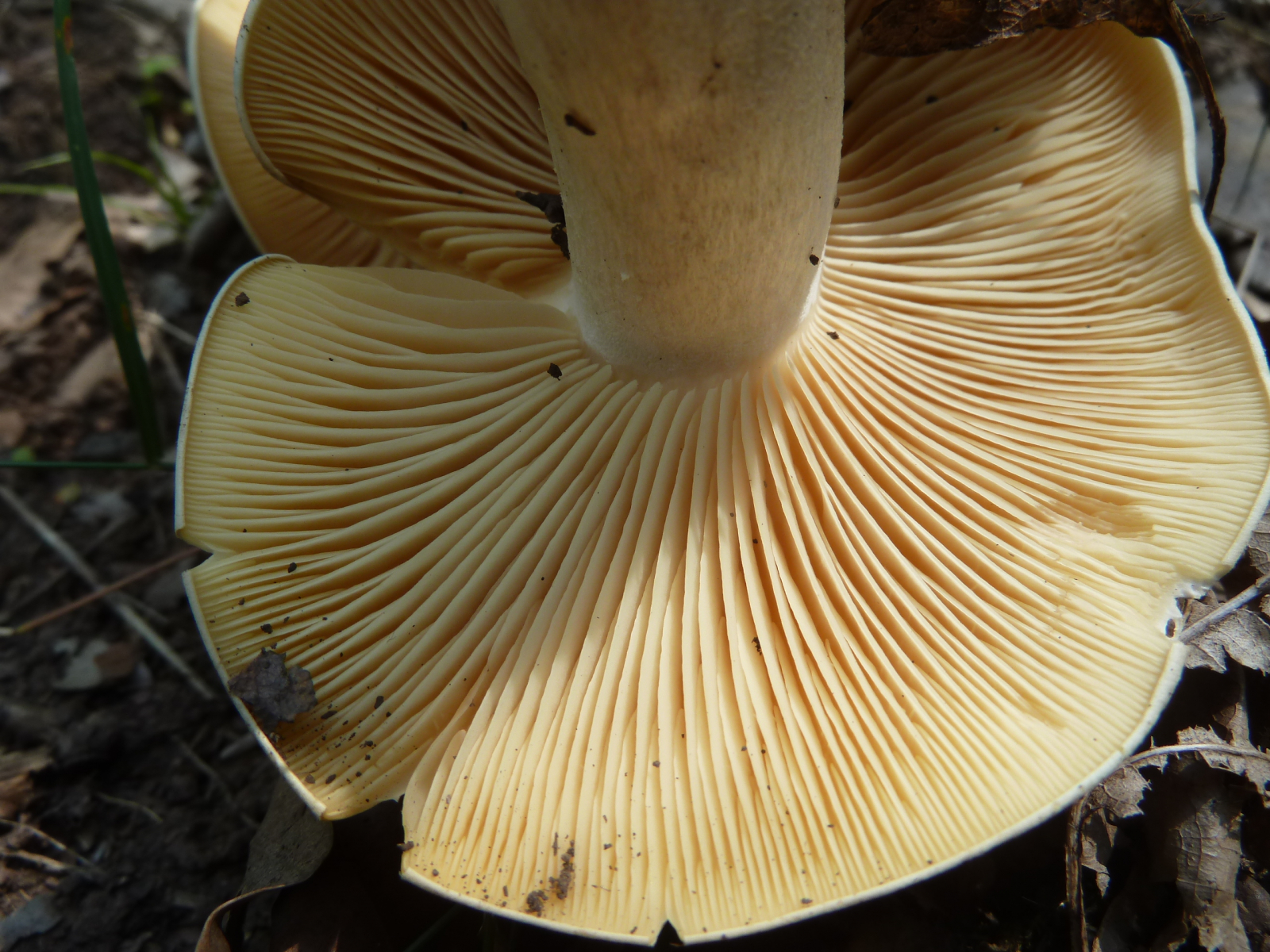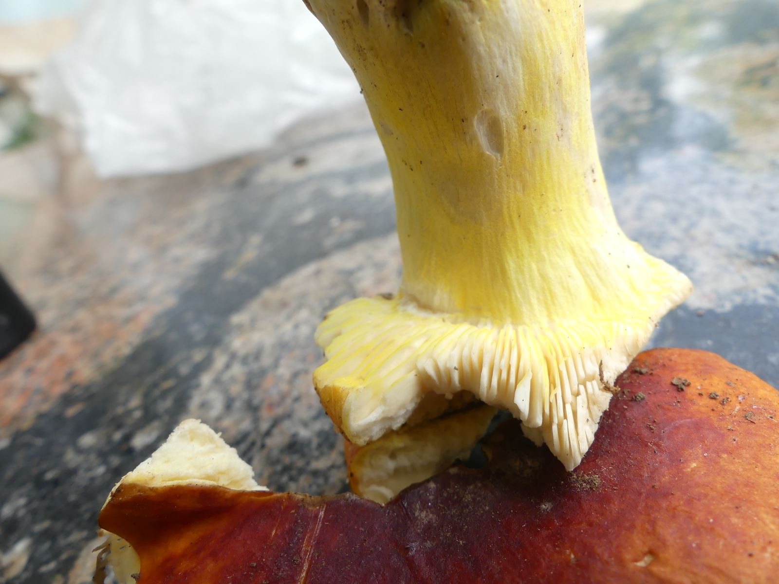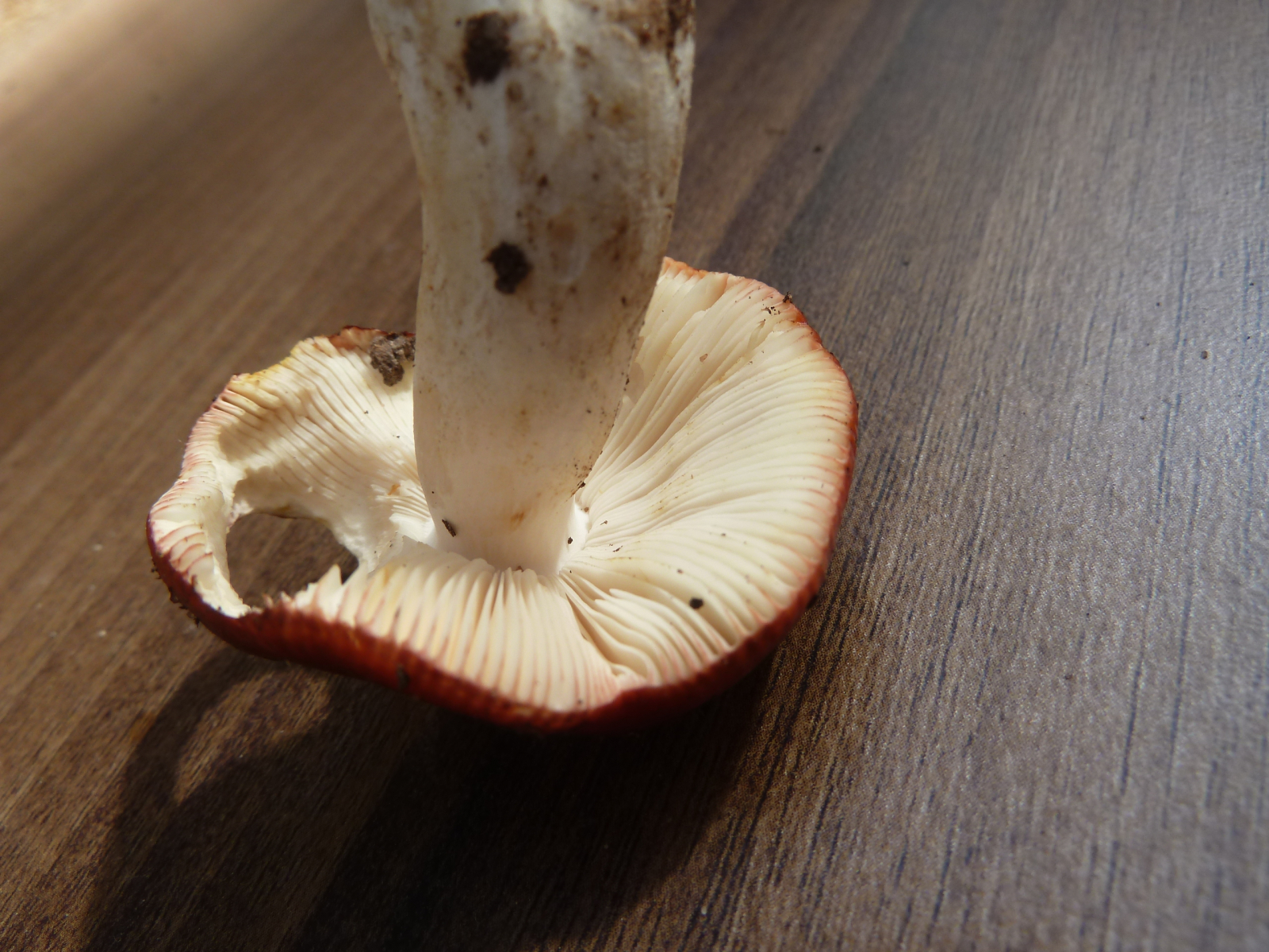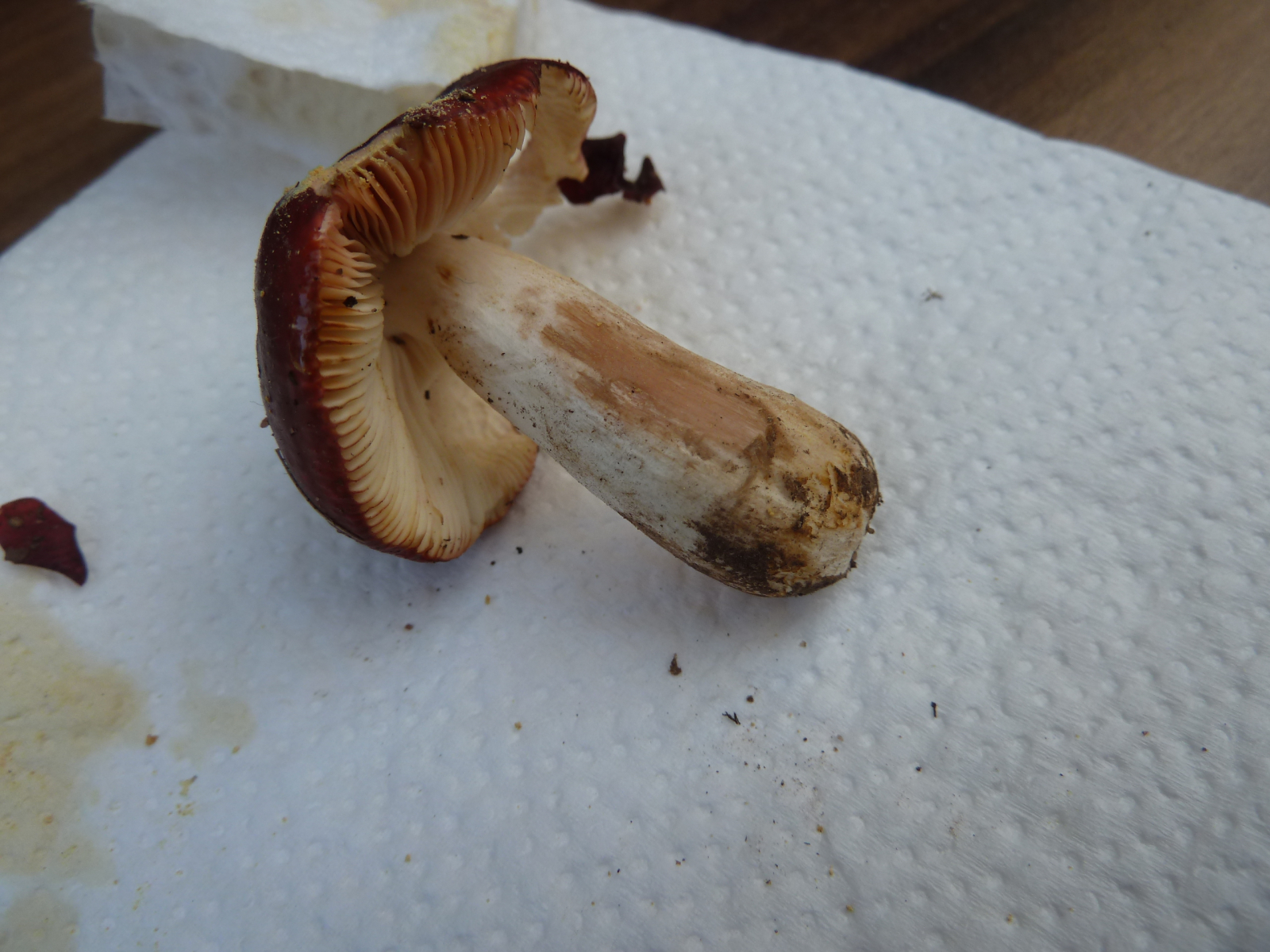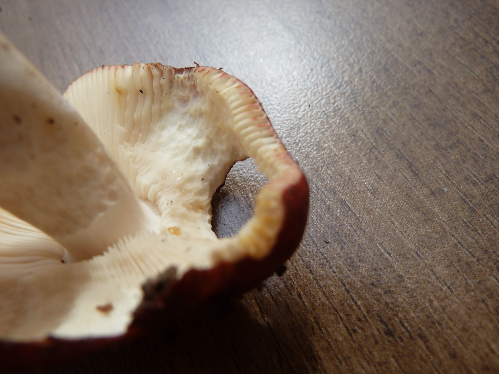 Vor ca. 20 Jahren hatte ich einmal Gold-Täublinge in voll ausgereifem Zustand gefunden. Diesmal habe ich ein einziges junges Exemplar unter Buchen-Eichen-Mischwald gefunden, das ich ebenfalls für einen Gold-Täubling halte. Lamellenschneiden zwar nicht chromgelb, aber schon mit deutlichem Gelbstich. Geschmack völlig mild auch nach längerem Kauen.