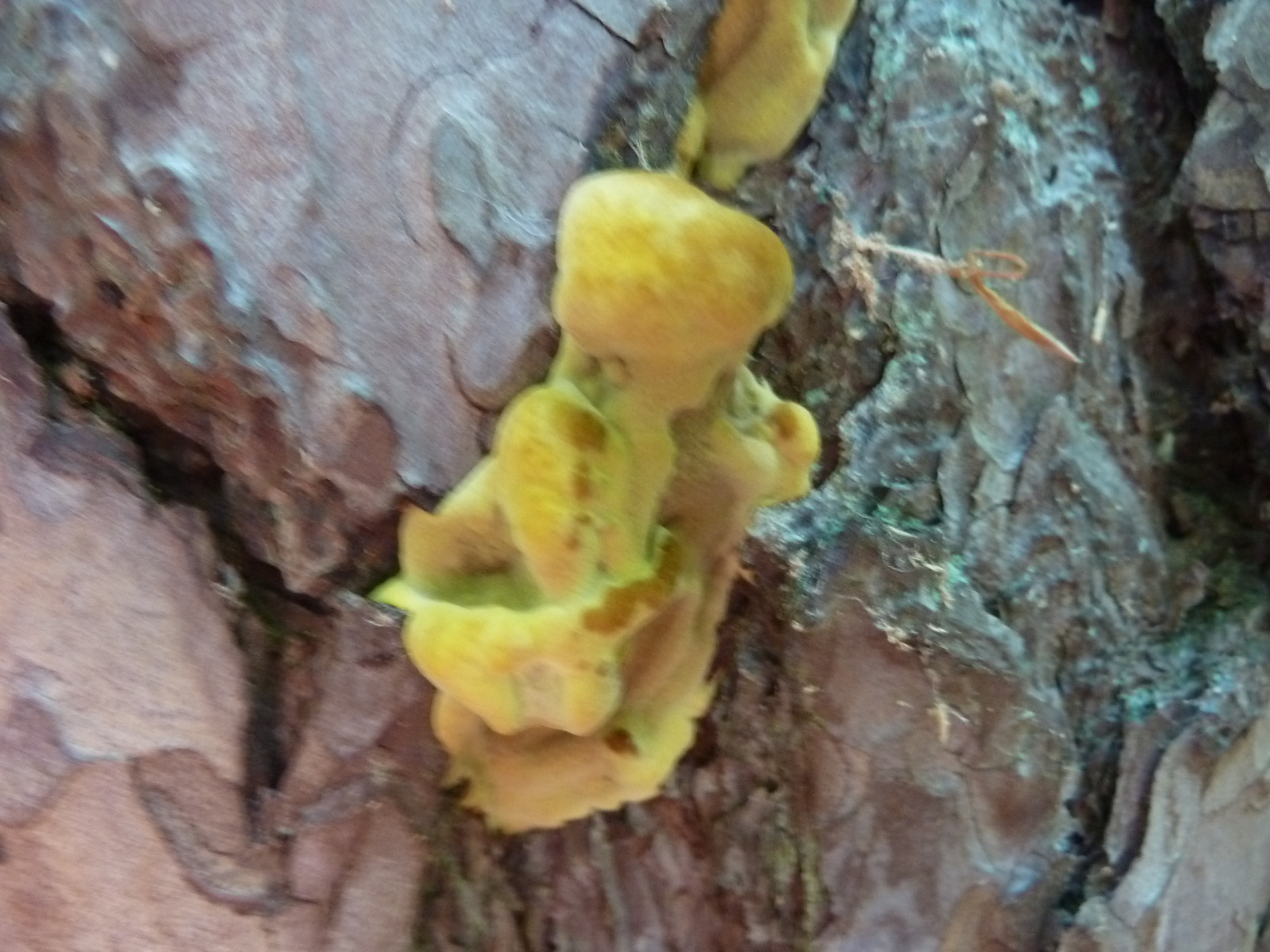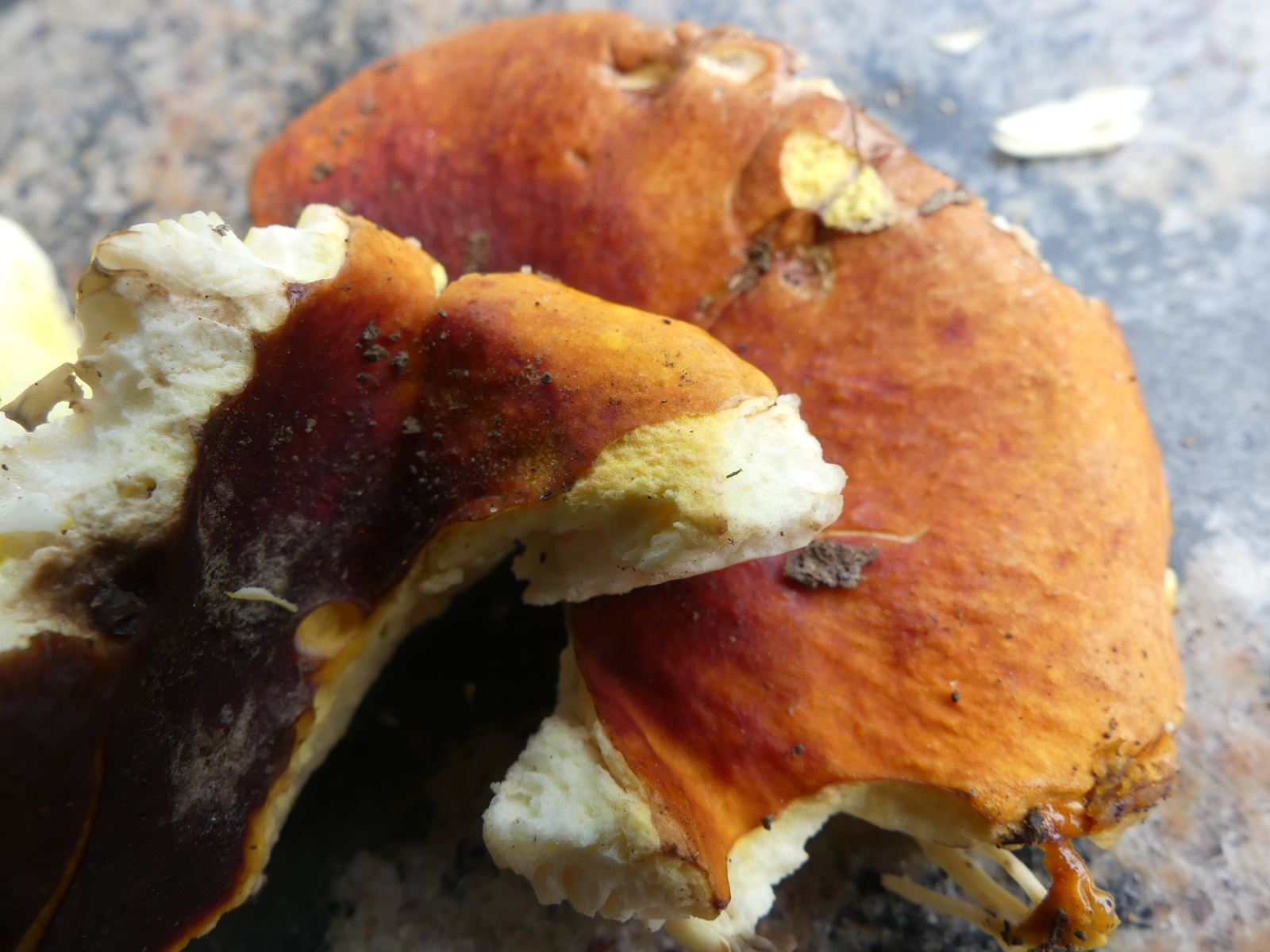 Ist das ein Kiefern-Braunporling? Was besseres fällt mir gerade nicht ein, Druckstellen der Oberfläche verfärben sich relativ schnell von gelb nach braun.