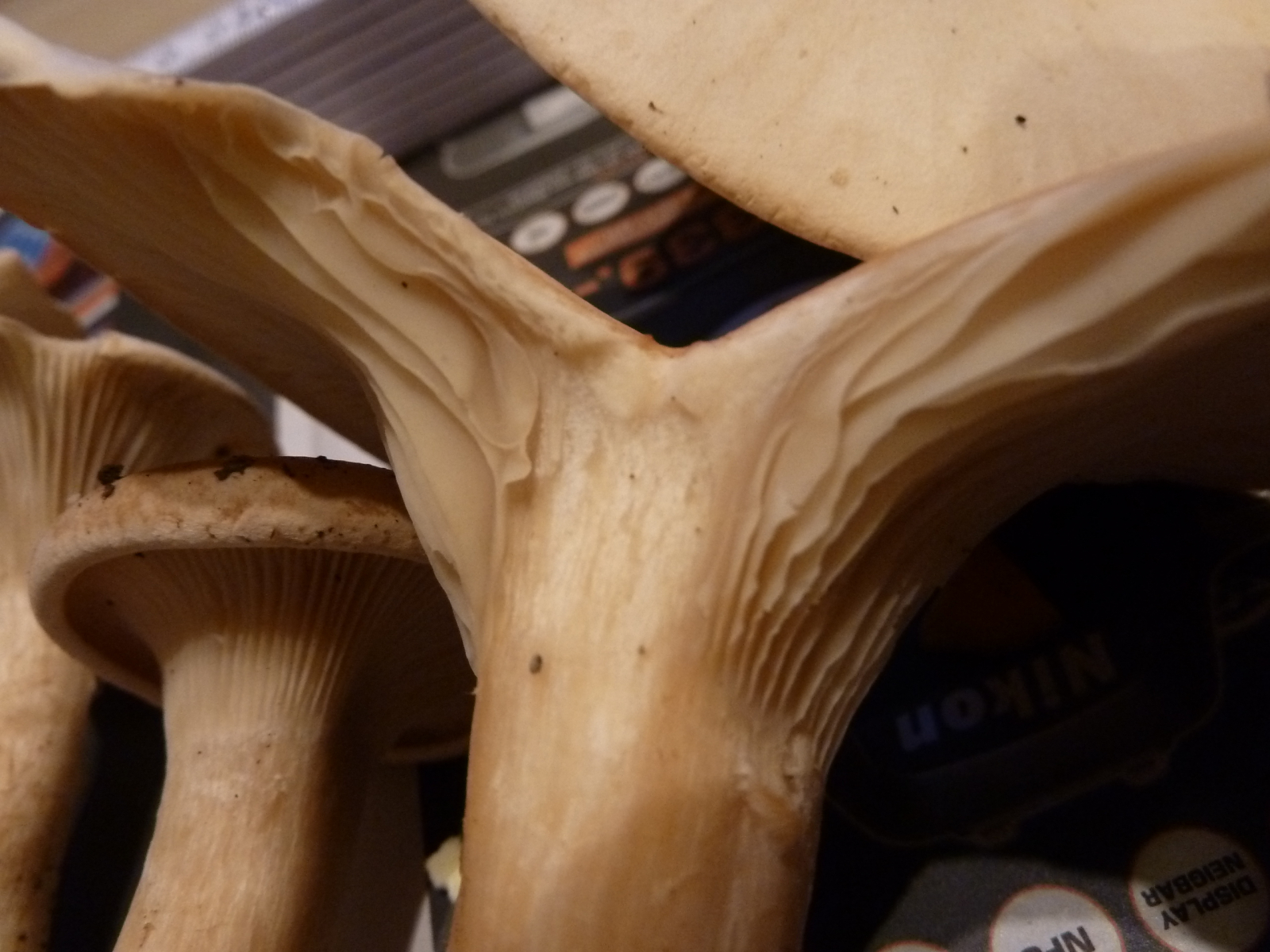 Er milcht nicht (jedenfalls jetzt nach drei Stunden Liegezeit), Geruch beim Zerreiben nach Schwimmbad/Chlor, geselliger Wuchs mit ca. 15-20 Fruchtkörper auf Holzast.