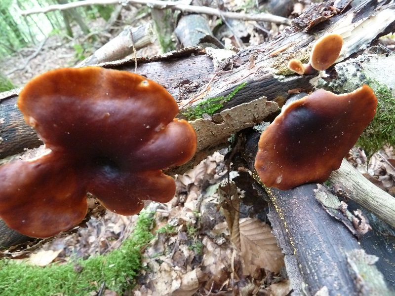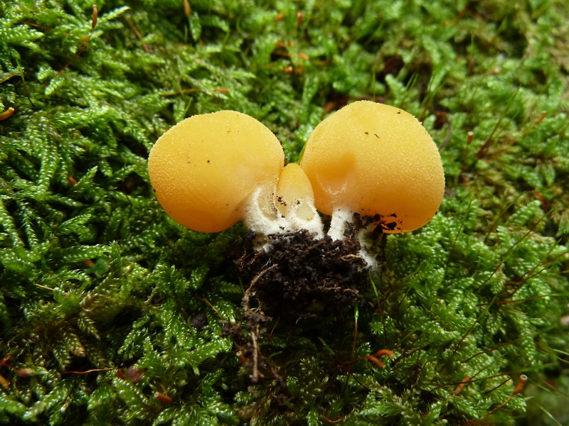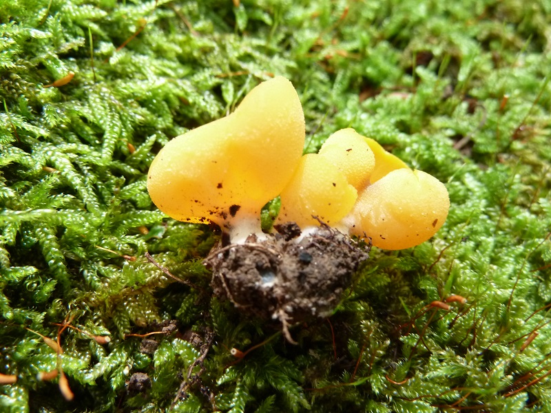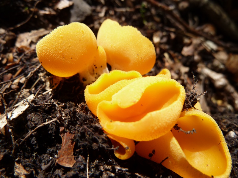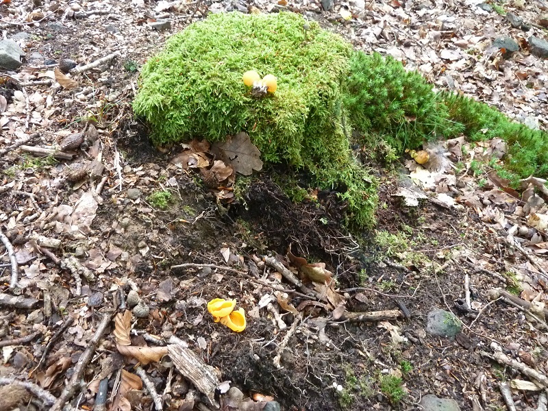 Vor drei Jahren hatte ich letztmals den sehr seltenen leuchtenden Wurzelbecherling, auch gestielter Orangebecherling genannt, gefunden. Die Bestimmung wurde damals mikroskopisch bestätigt. Gestern finde ich in rund 100 Meter Entfernung vom bekannten Fundort (zumindest äußerlich) identische Fruchtkörper.