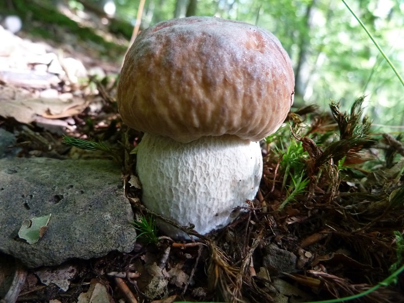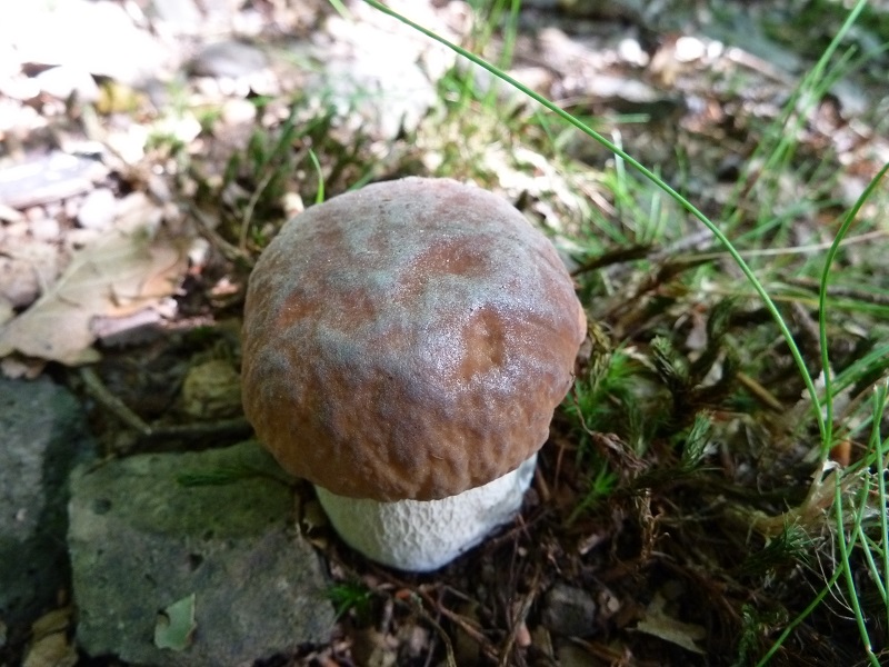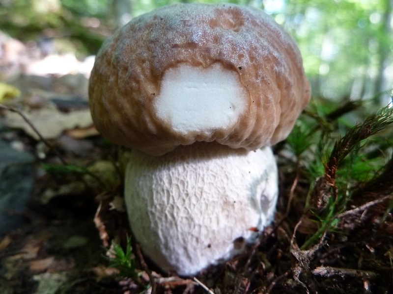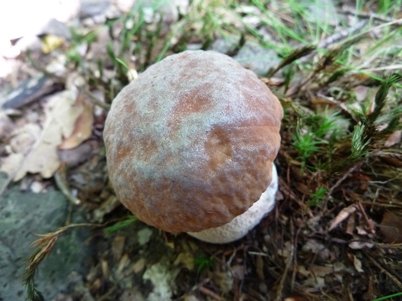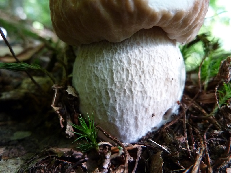 Hutfarbe ähnlich wie "normaler" Steinpilz, aber in der Hutmitte mit grausilbrigem Überzug, erhabenes weißes relativ grobmaschiges Stielnetz auf weißem Grund auf der gesamten Länge. Dieser "Überzug" in der Hutmitte erinnert mich etwas an Reifpilze.