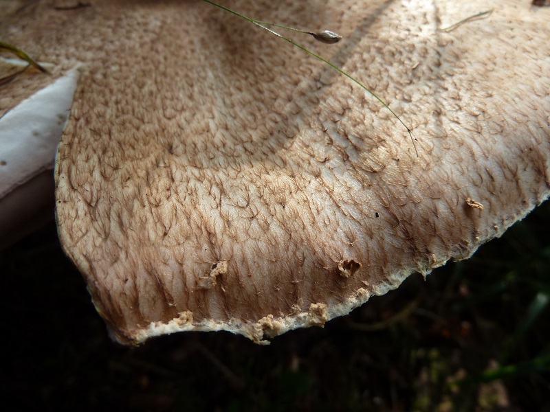 Da der Pilz noch recht jung ist und es sich um ein Einzelexemplar handelt, habe ich ihn stehen lassen. Die Profis hier im Forum können das doch auch ohne Röhrenansicht bestimmen, oder? In ein paar Tagen möchte ich ihn nochmal anschauen, hoffentlich wird er nicht abgeerntet ...