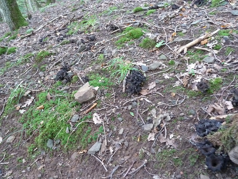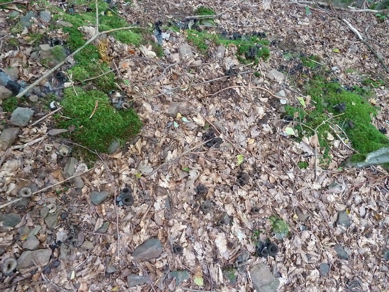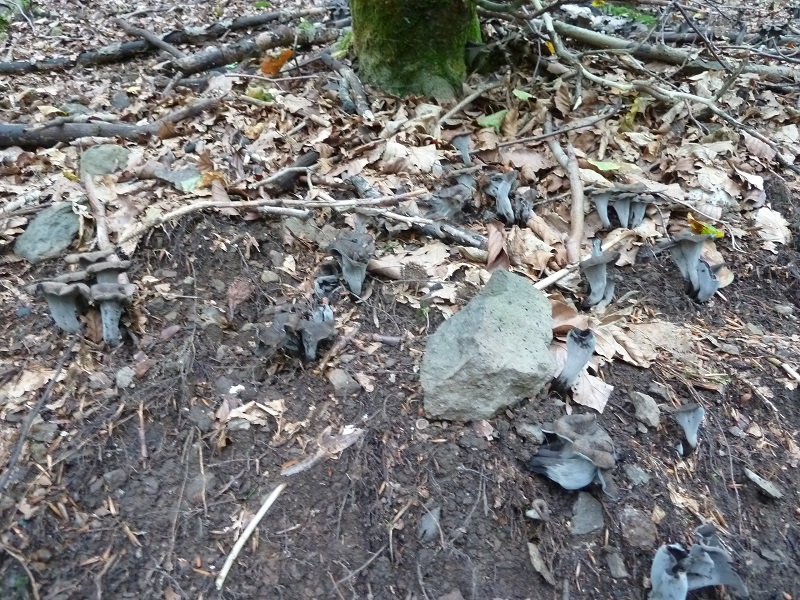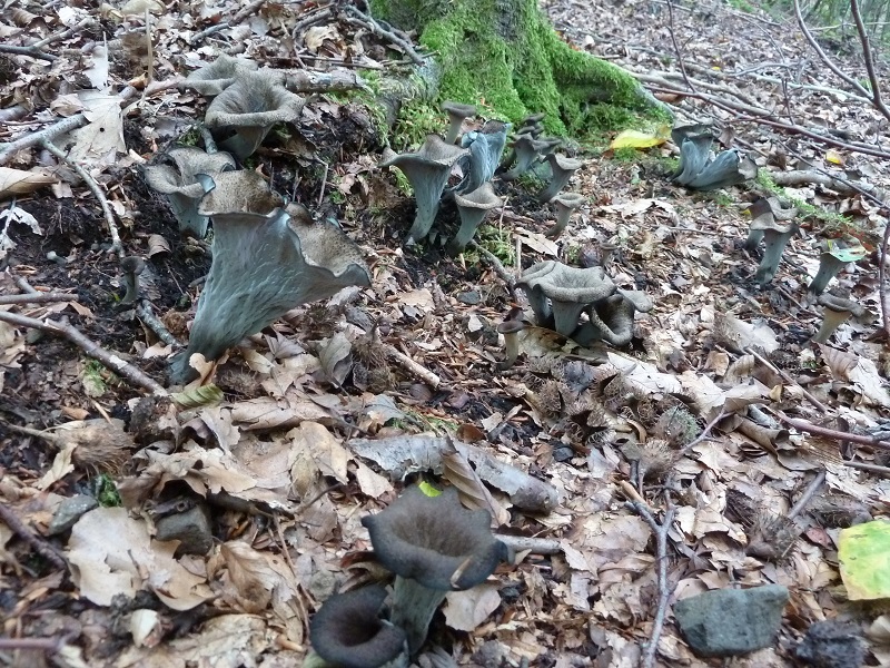 Die Kraterelle (nur das abgebildete Exemplar) habe ich zu Bestimmungszwecken mitgenommen, der graue Leistling war mir zwischen die Herbsttrompeten geraten. Der graue Leistling kommt hier auf dem basischen Basalt in den Eichen-Hainbuchen-Wäldern zwischen Herborn und Dillenburg relativ häufig vor, die Kraterelle ist sogar hier selten.